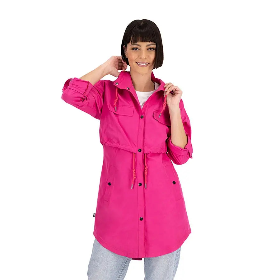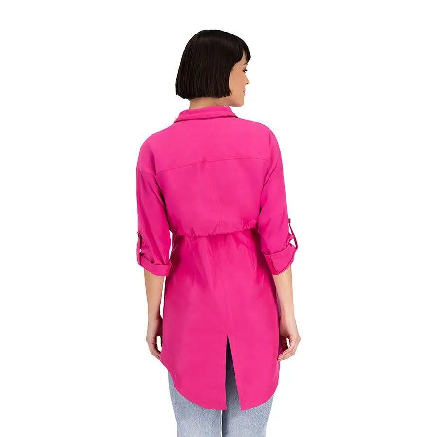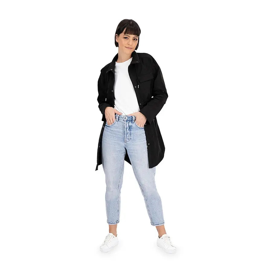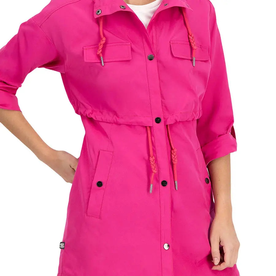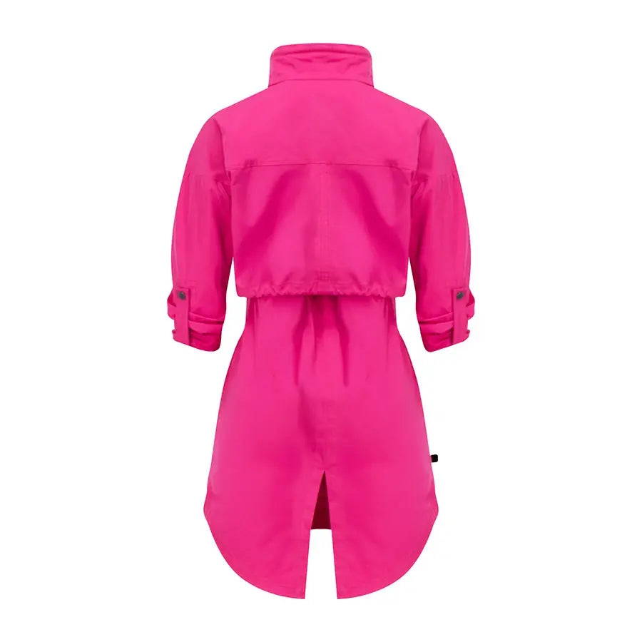 Gabardina con paneles divididos, presenta mangas con doblez ajustable y botones frontales. Cuenta con jaretas ajustables en cuello y cintura, bolsas con botón y forro de malla.