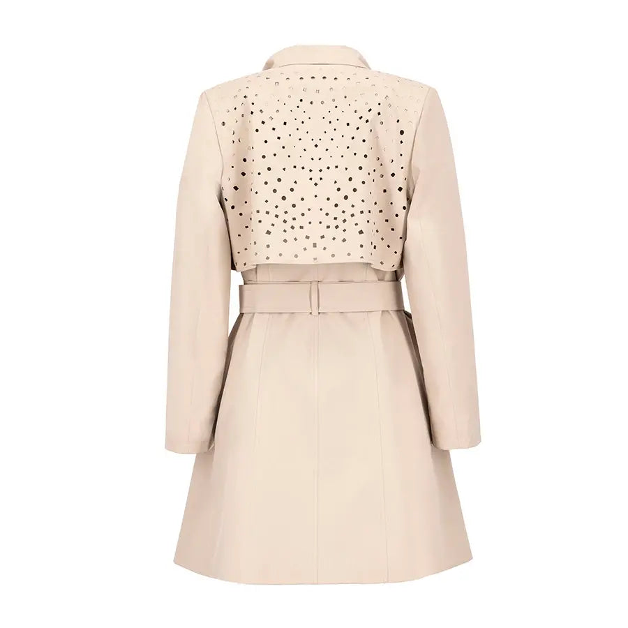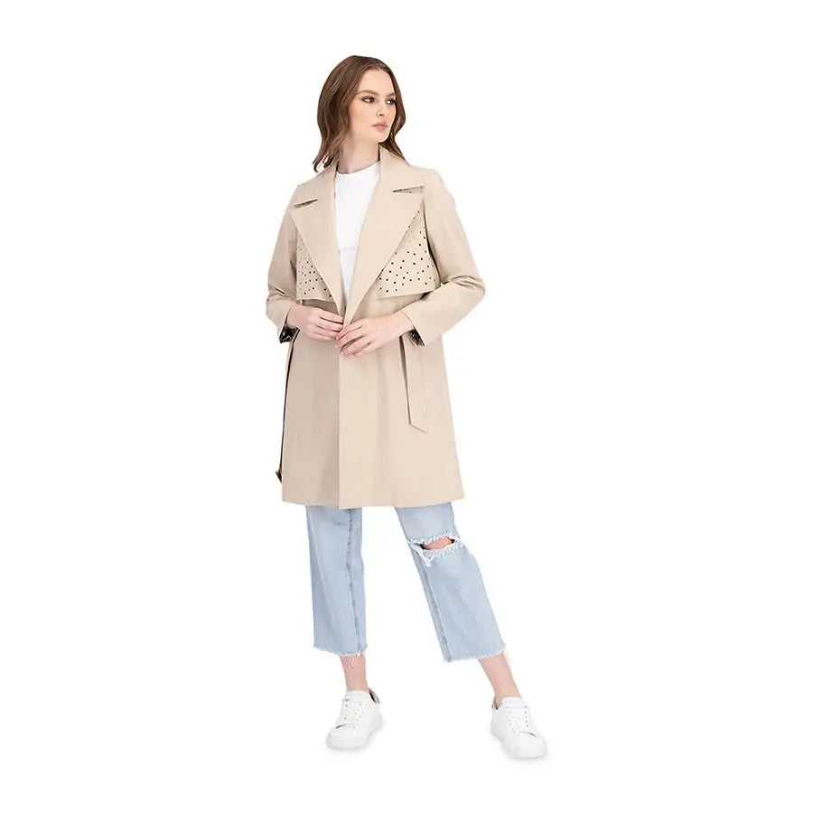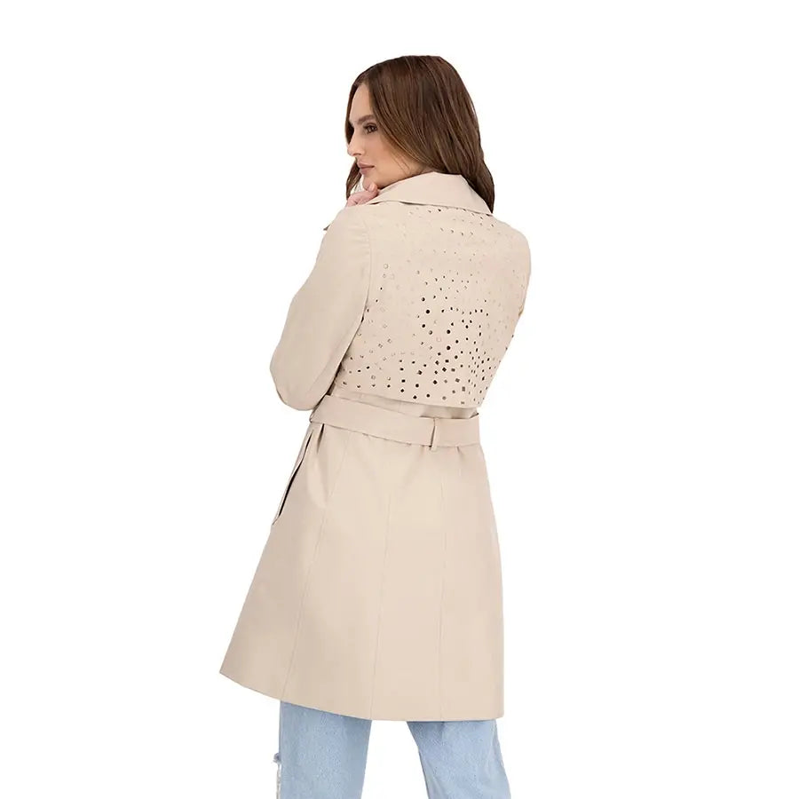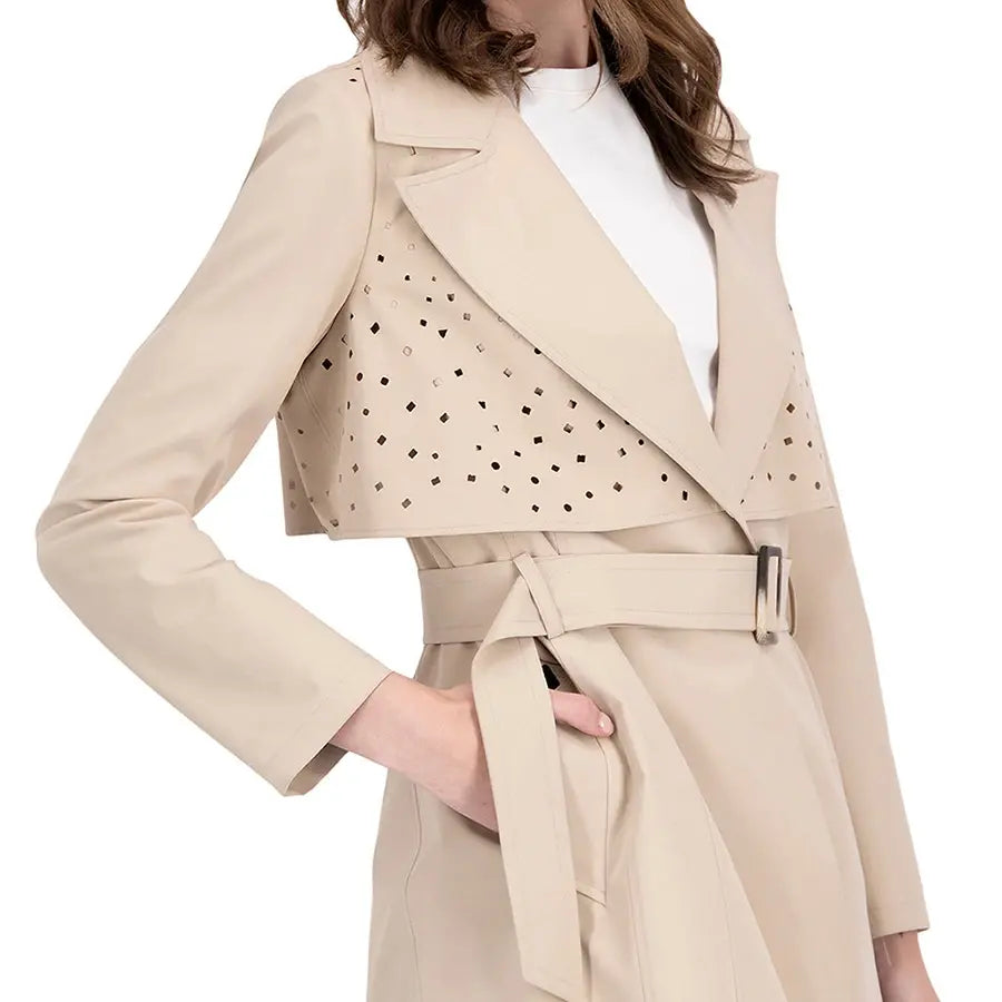 Gabardina con solapas cortavientos texturizadas en pecho y espalda. Tiene charreteras en los hombros y cuello en V con solapa tipo muesca. Cuenta con doble botonadura, puños ajustables con correa y cinturón deslizable.