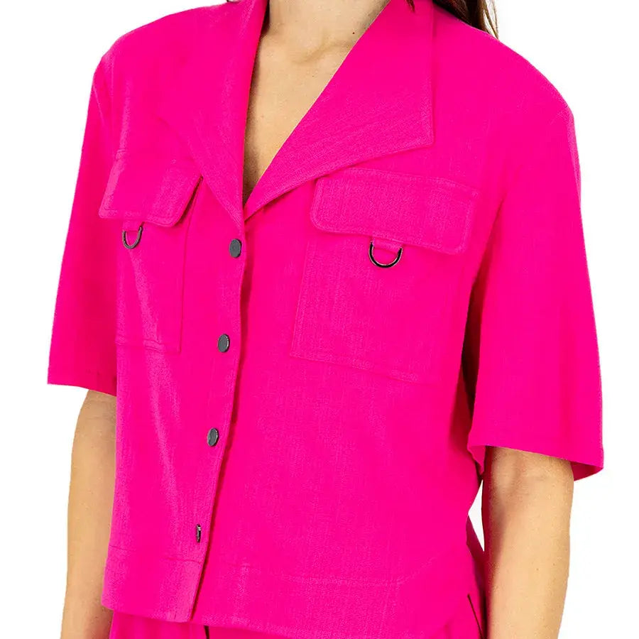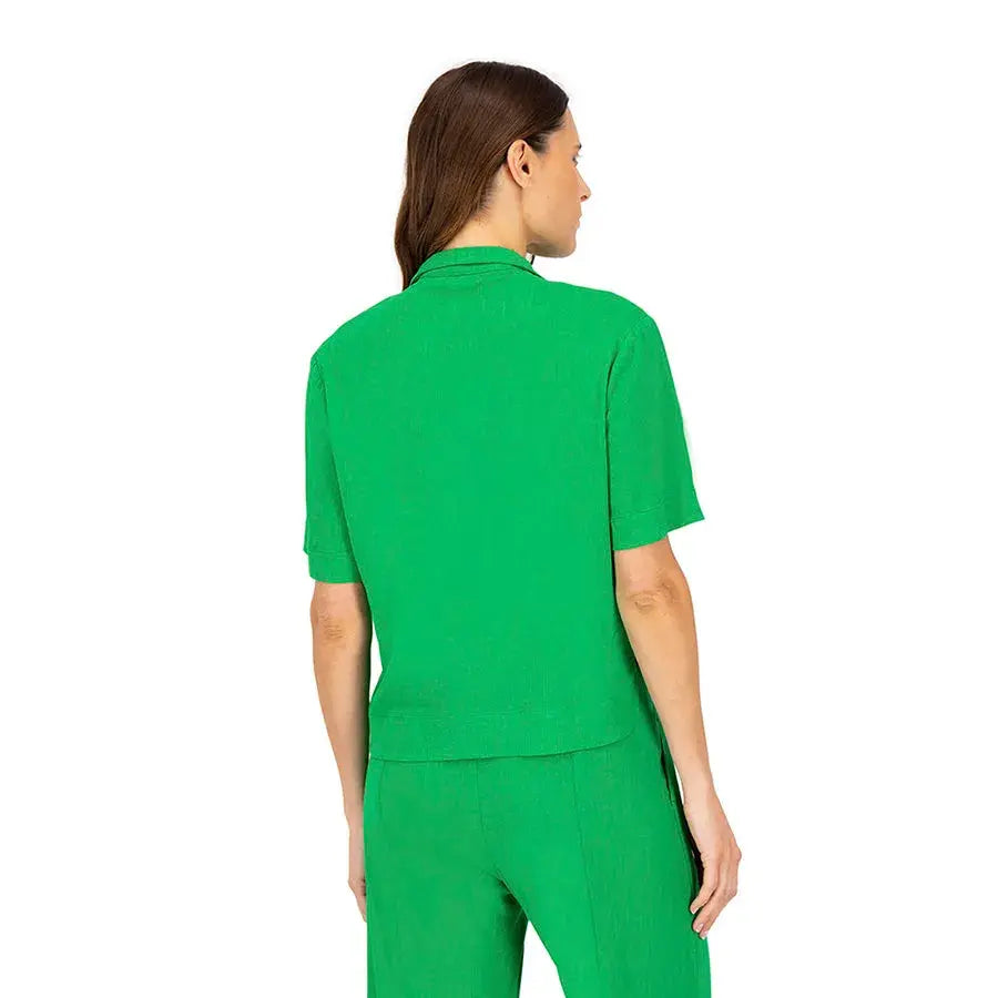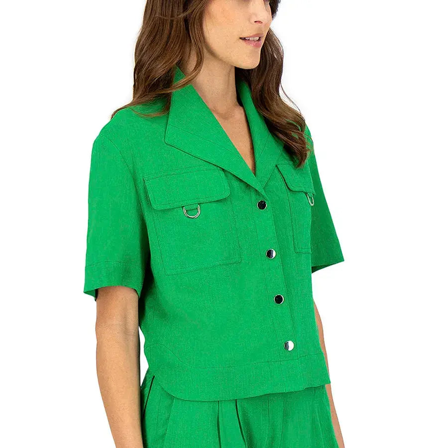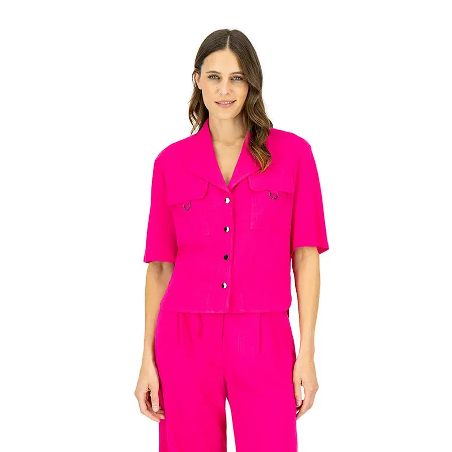 Blusa camisera de corte recto con escote solapa y botones al frente. Incluye bolsas a la altura del pecho y manga corta para un look fresco y casual.