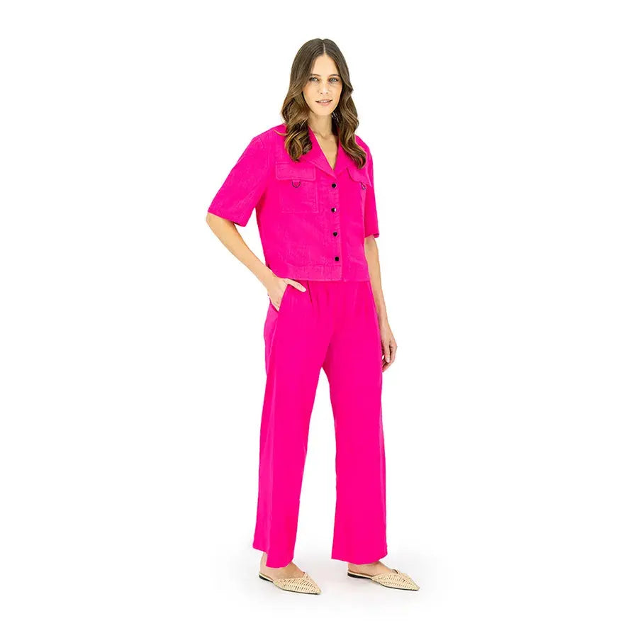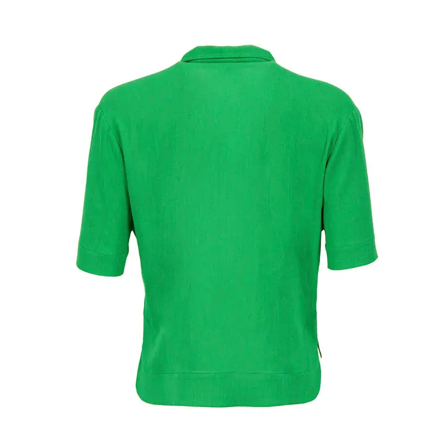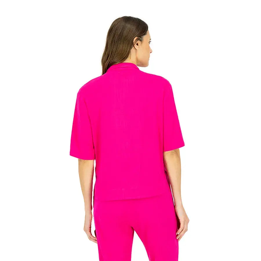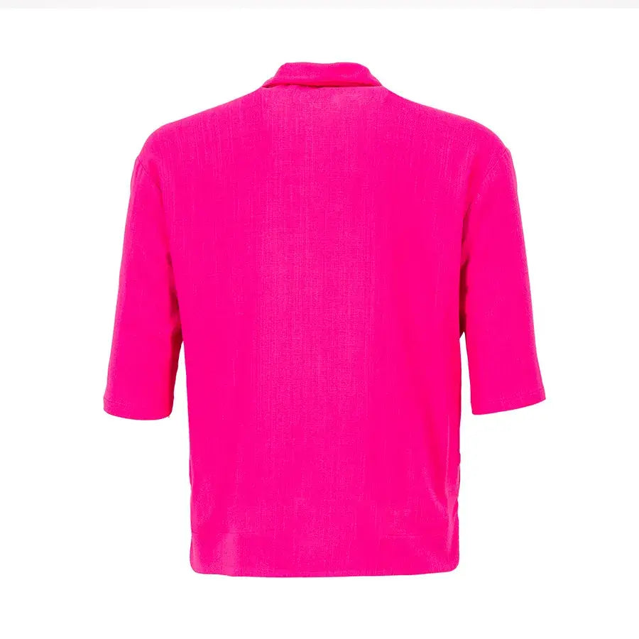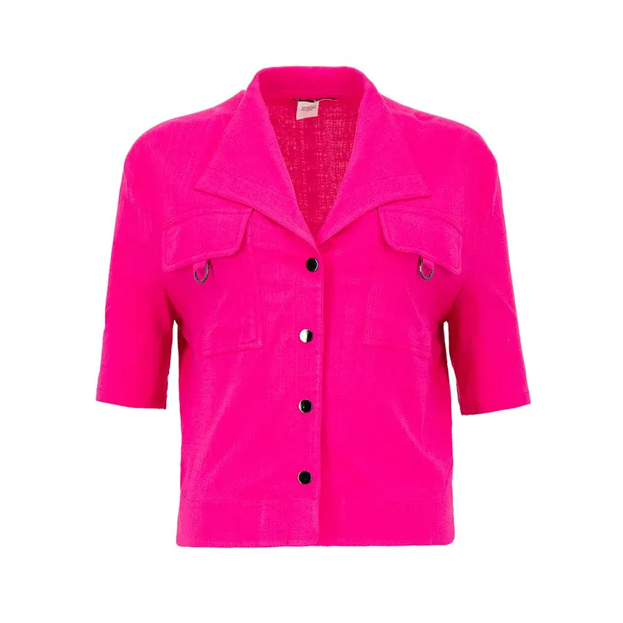Blusa camisera de corte recto con escote solapa y botones al frente. Incluye bolsas a la altura del pecho y manga corta para un look fresco y casual.