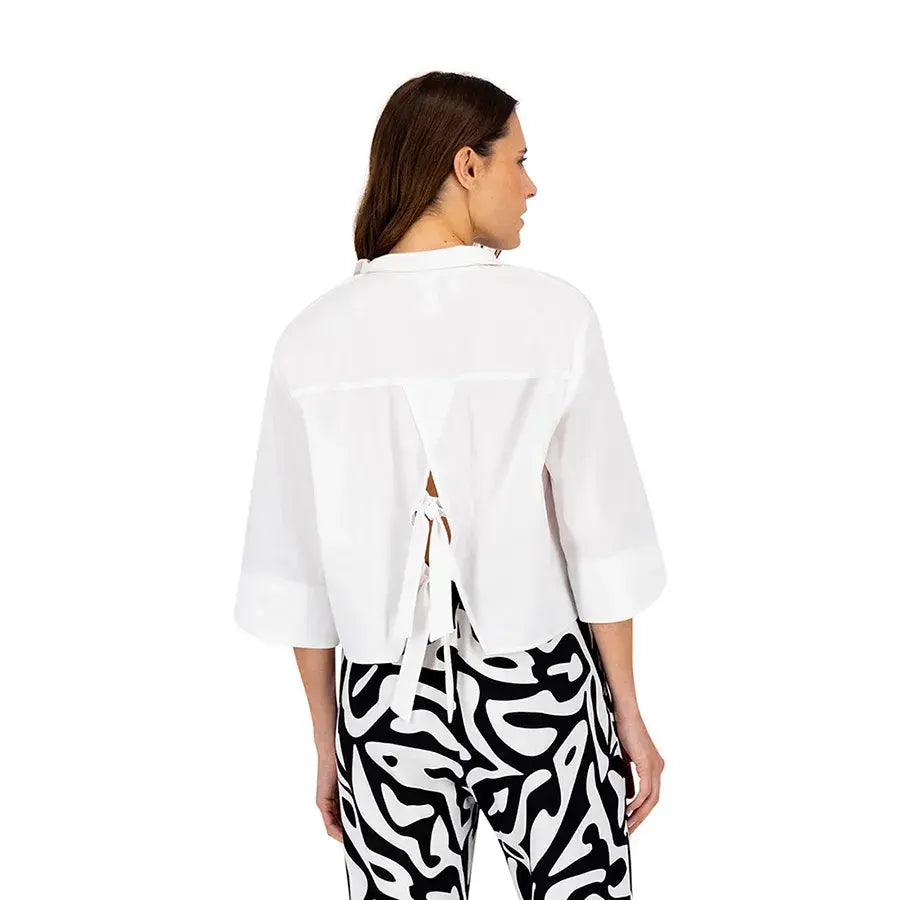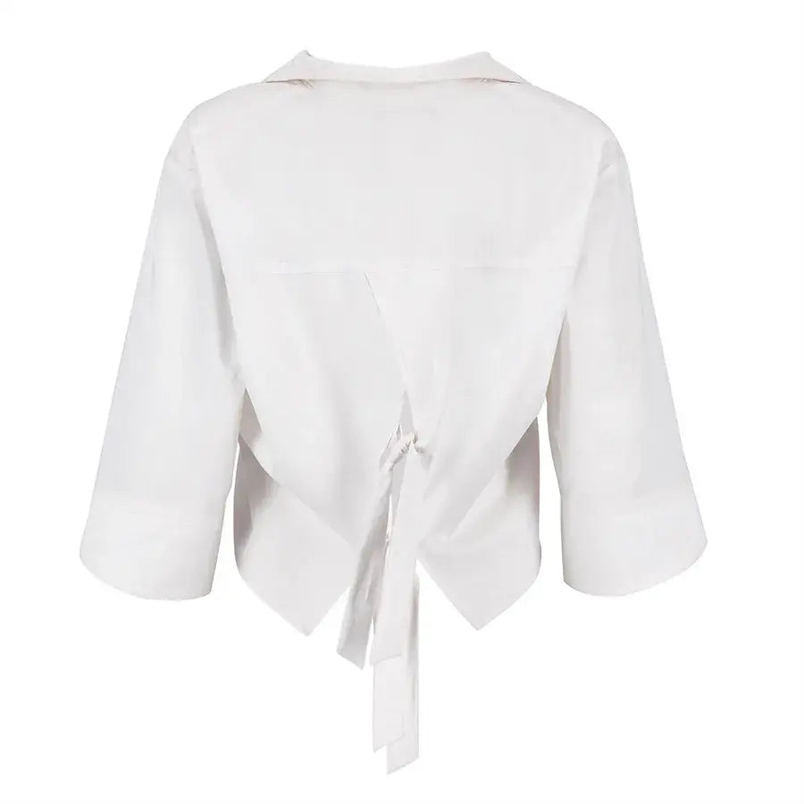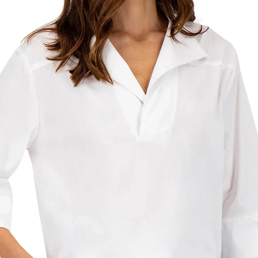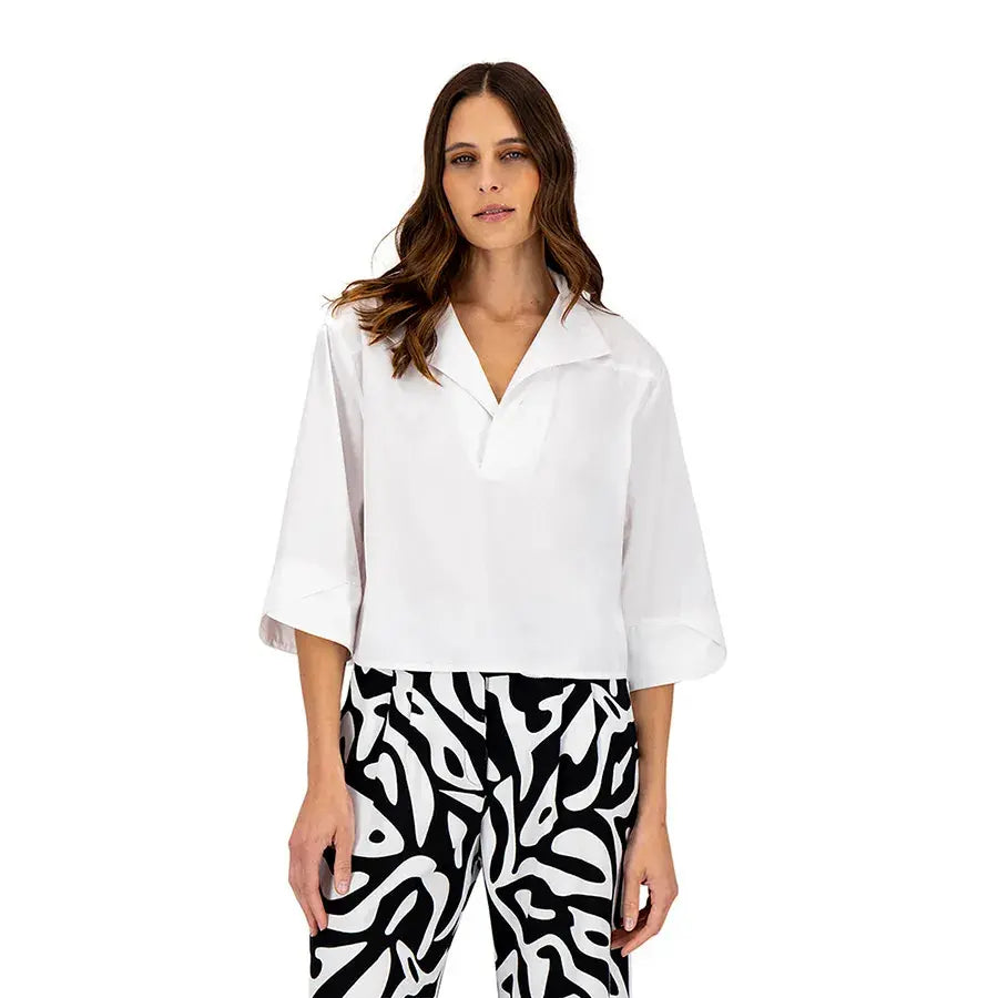 Blusa de corte recto con cuello en V tipo solapa y mangas 3/4 en corte A, terminadas con puño cruzado que añade un detalle sutil y elegante.