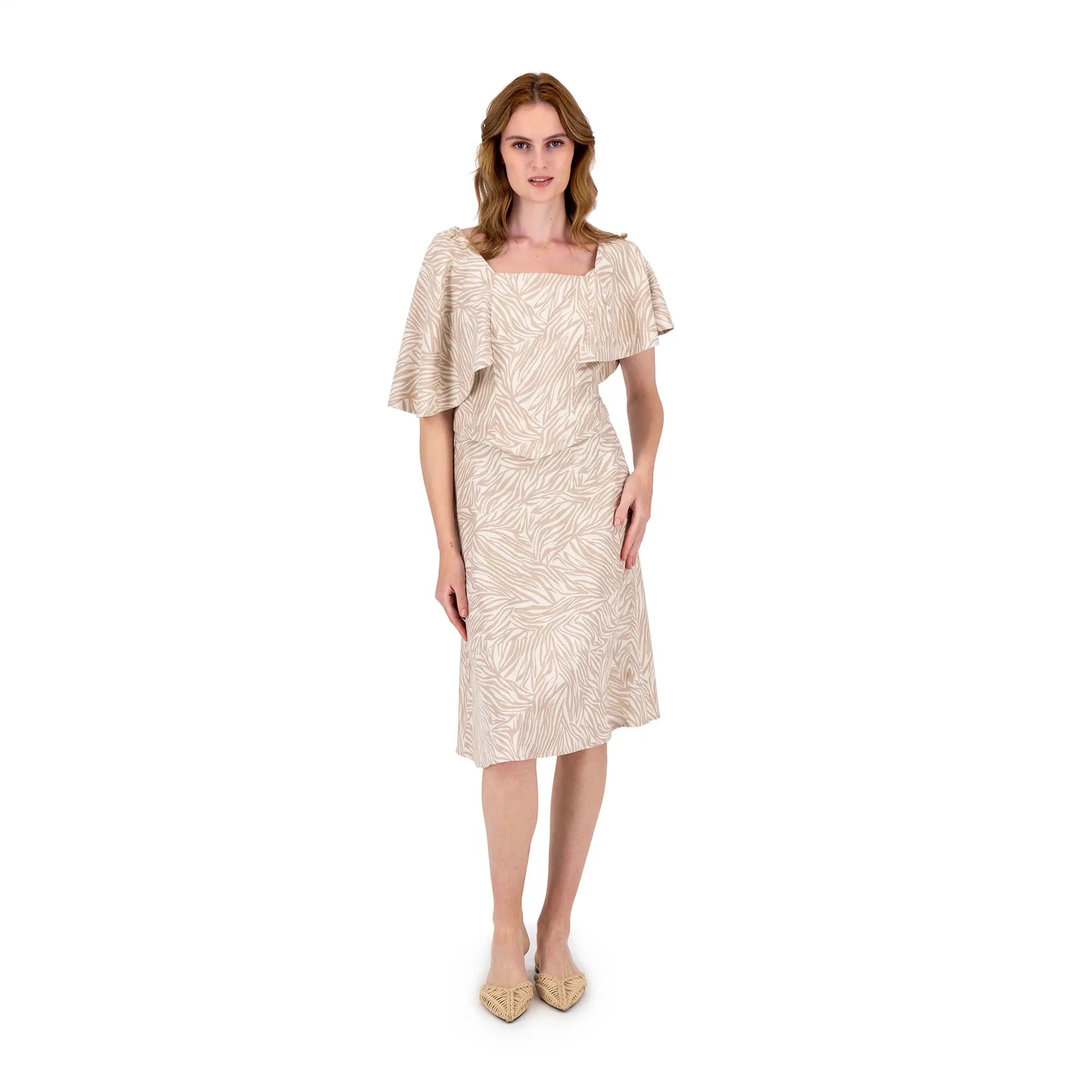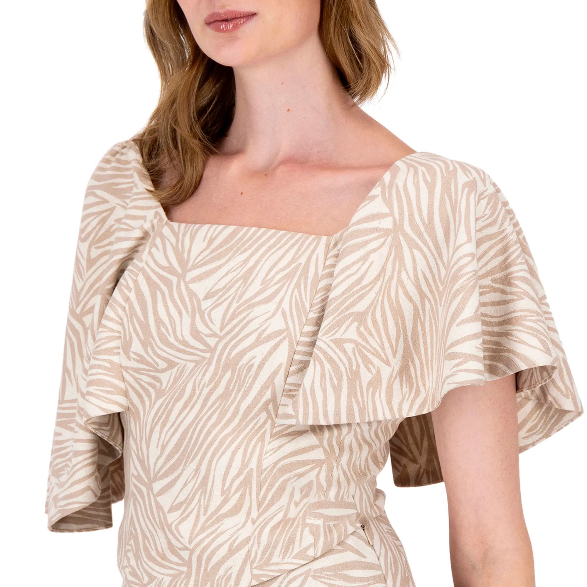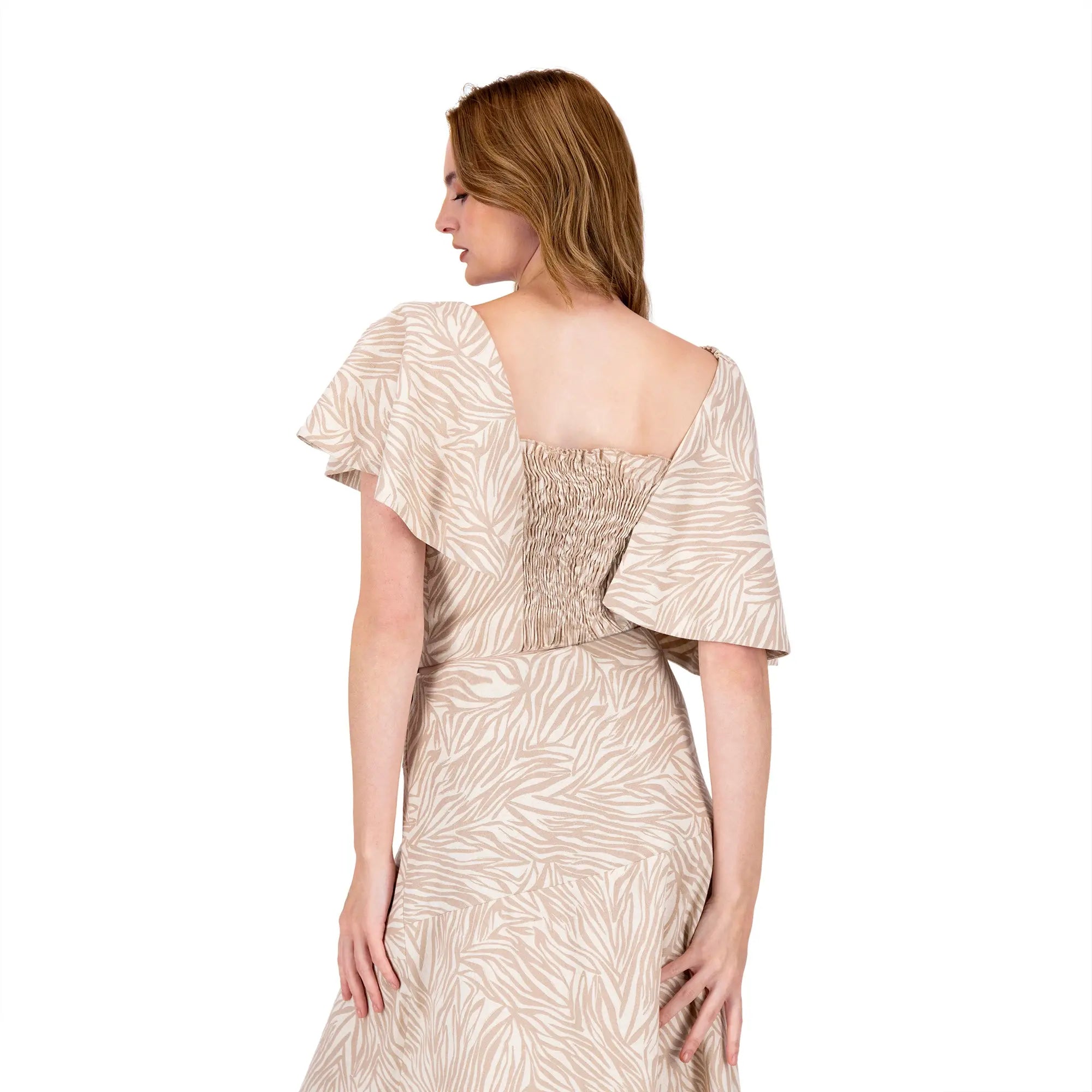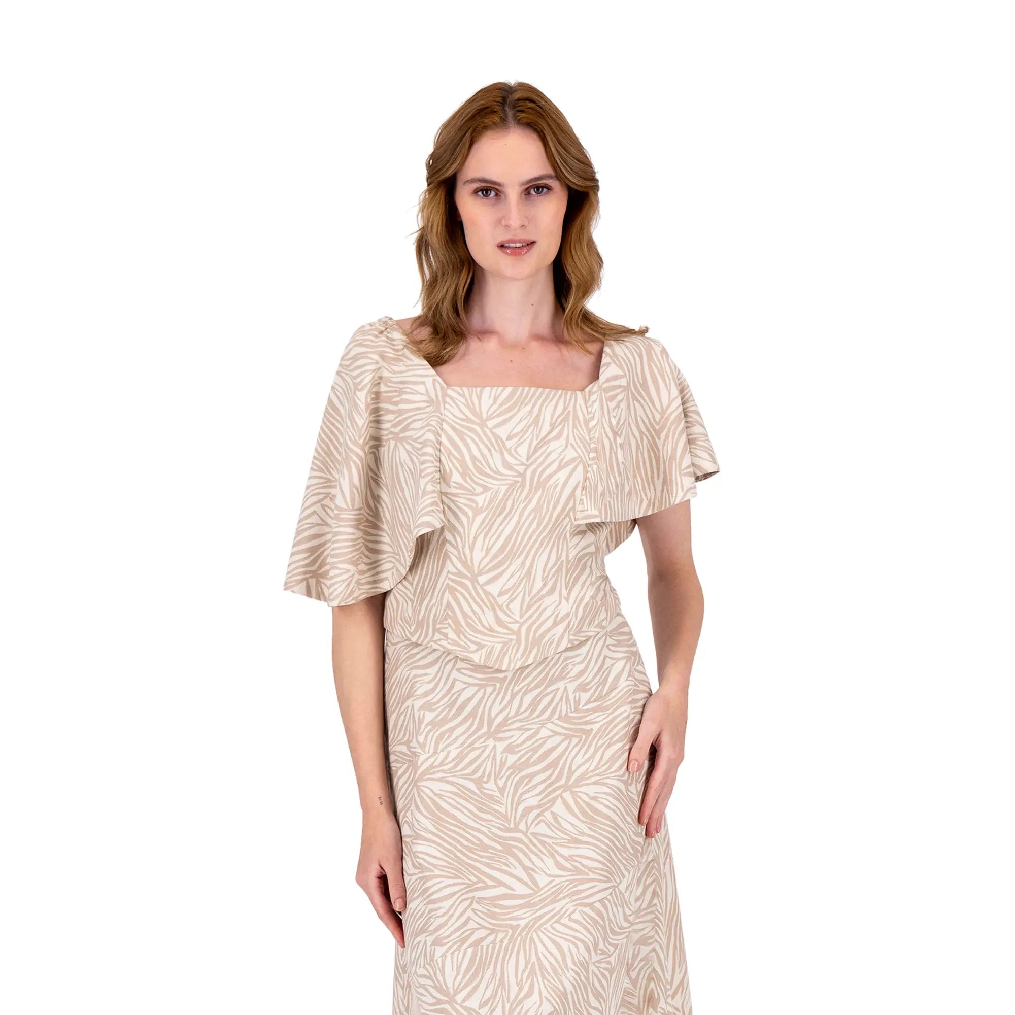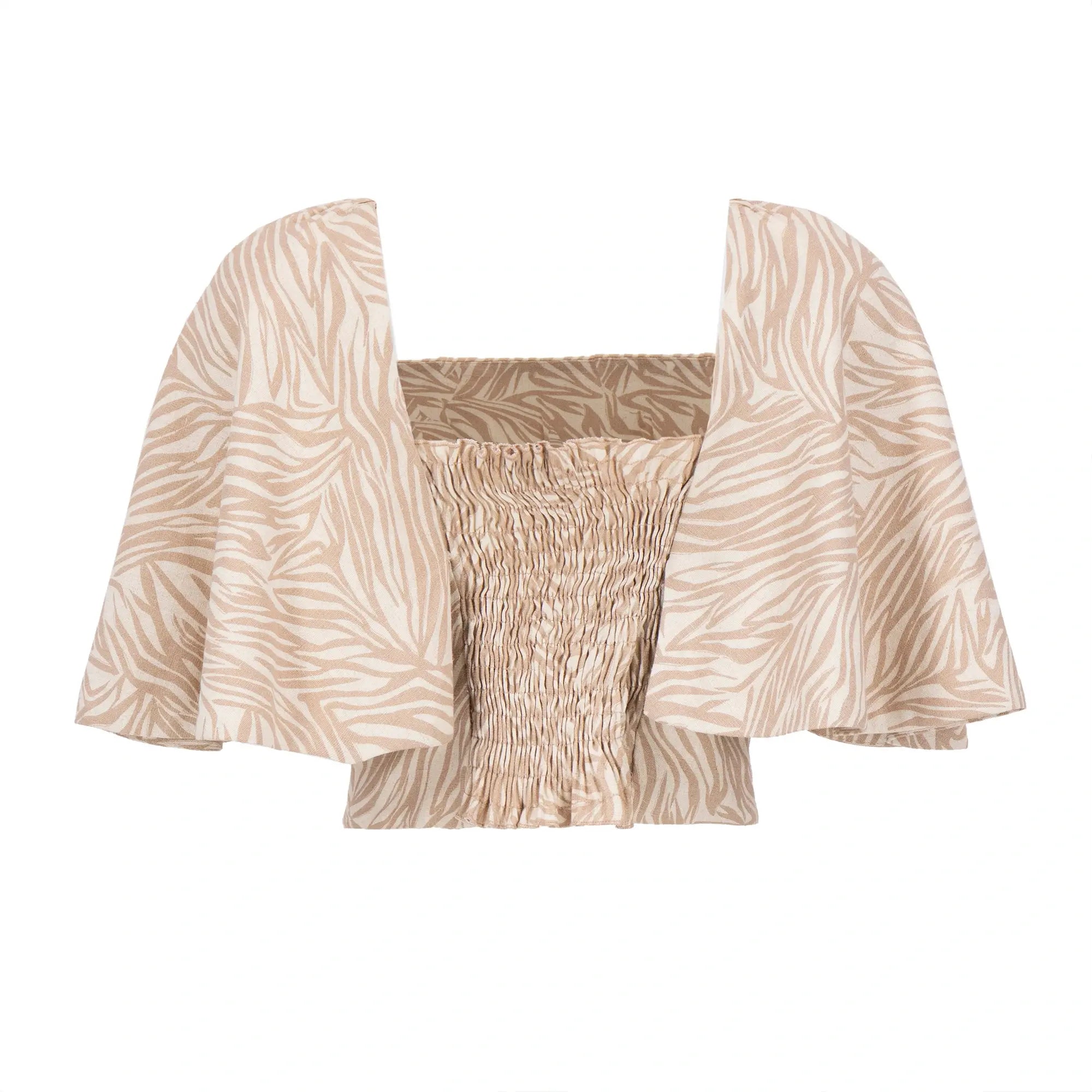 Blusa con estampado safari y mangas amplias de caída fluida. Su escote cuadrado realza el cuello y la espalda con detalle elástico aporta comodidad. Una prenda fresca, versátil y elegante.