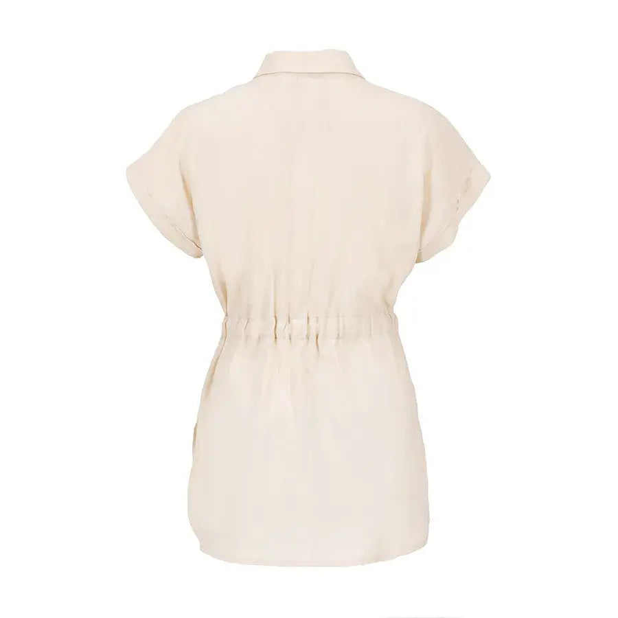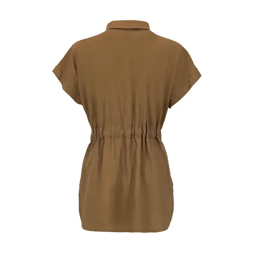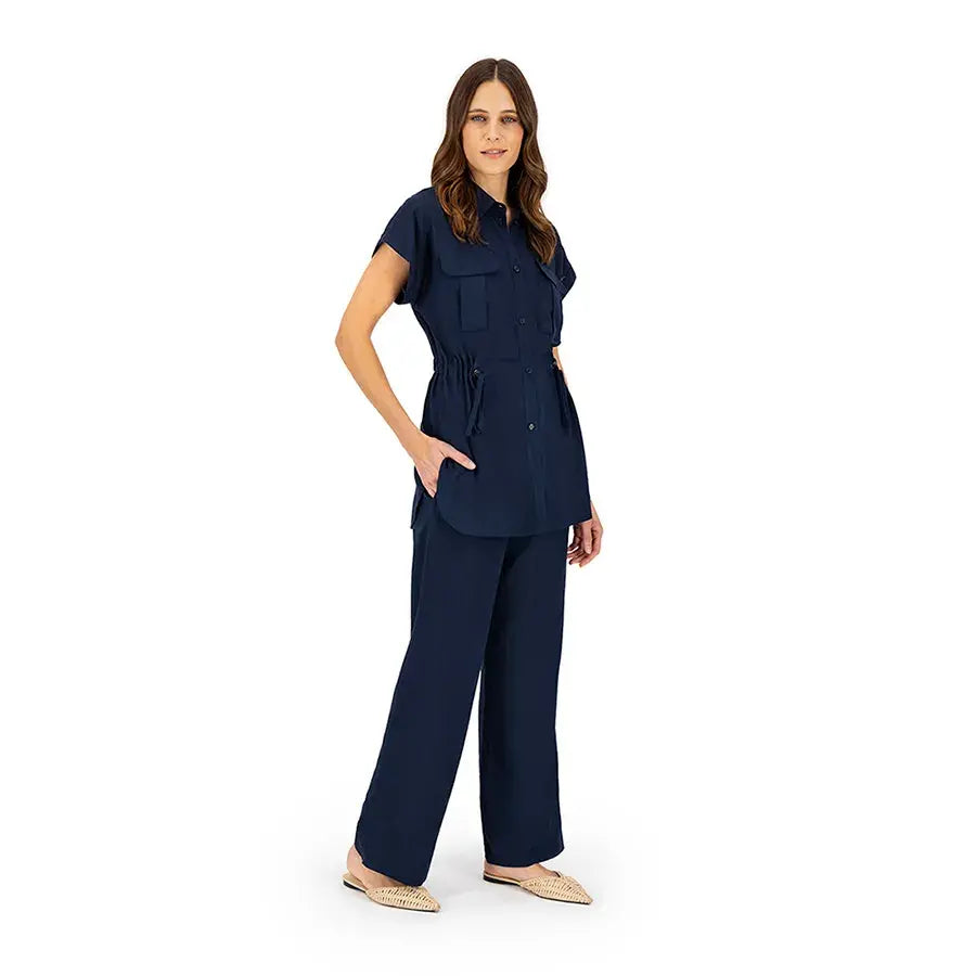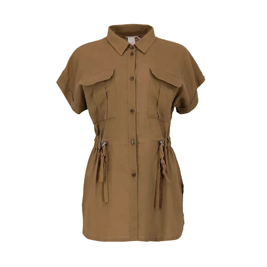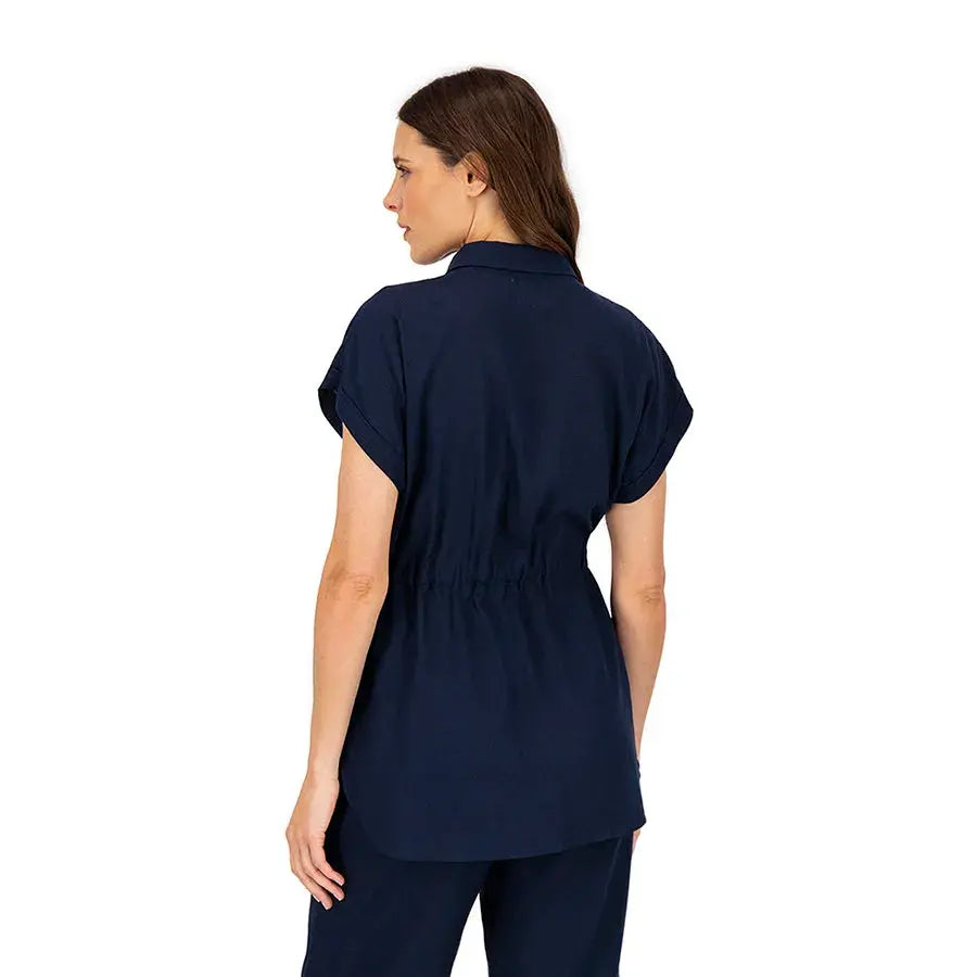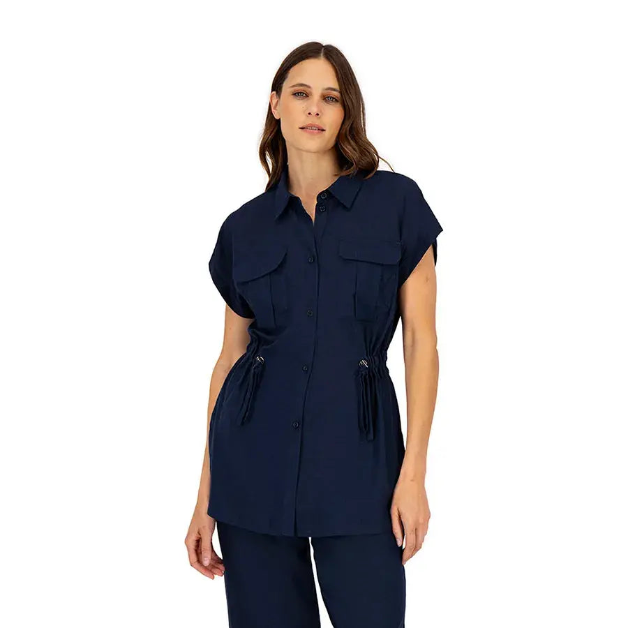 Blusa de corte recto con cuello tipo camisa, botones al frente y jaretas ajustables que permiten definir la cintura. Incluye bolsas en el pecho para un toque funcional y estilizado.