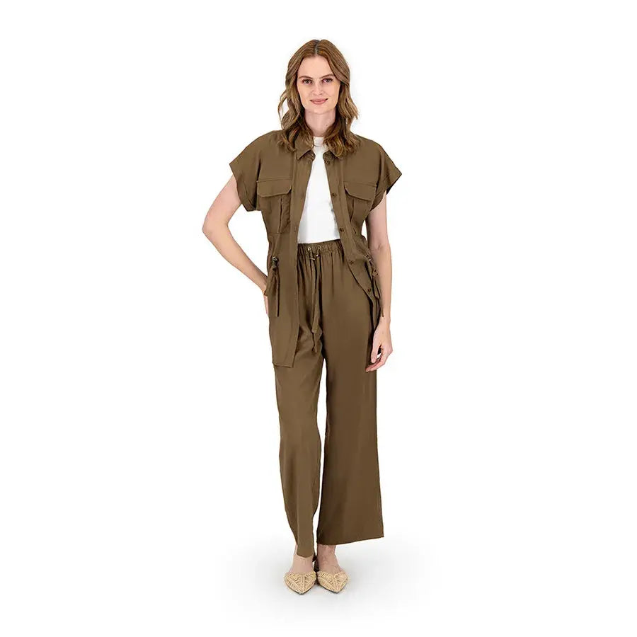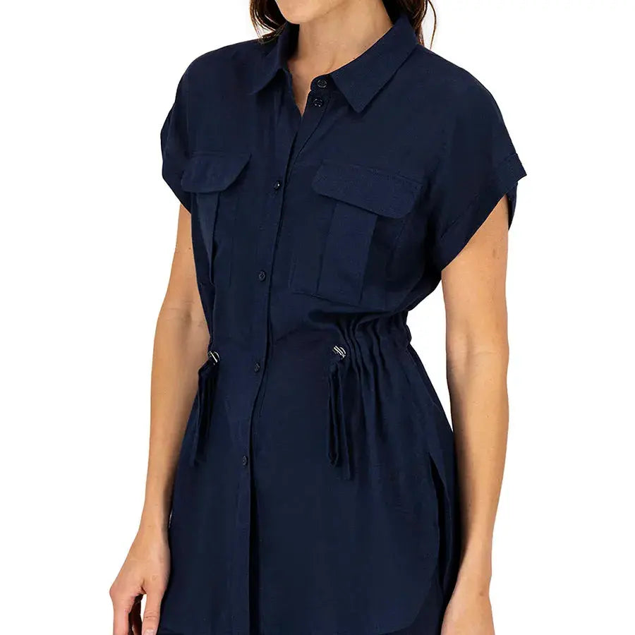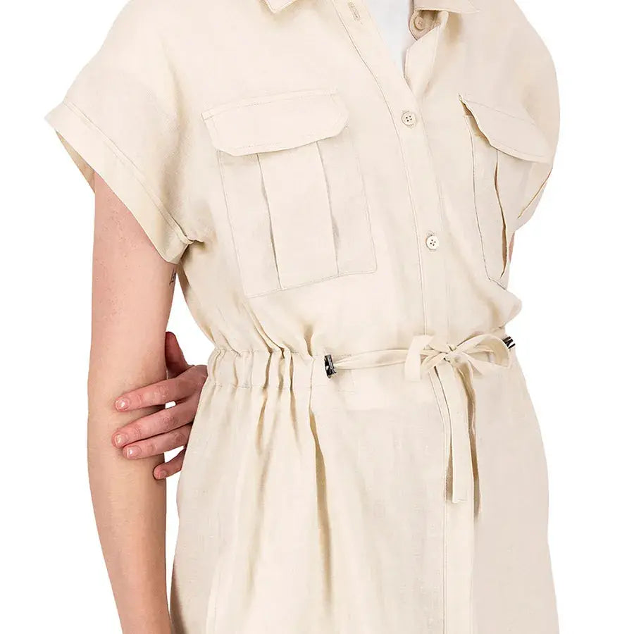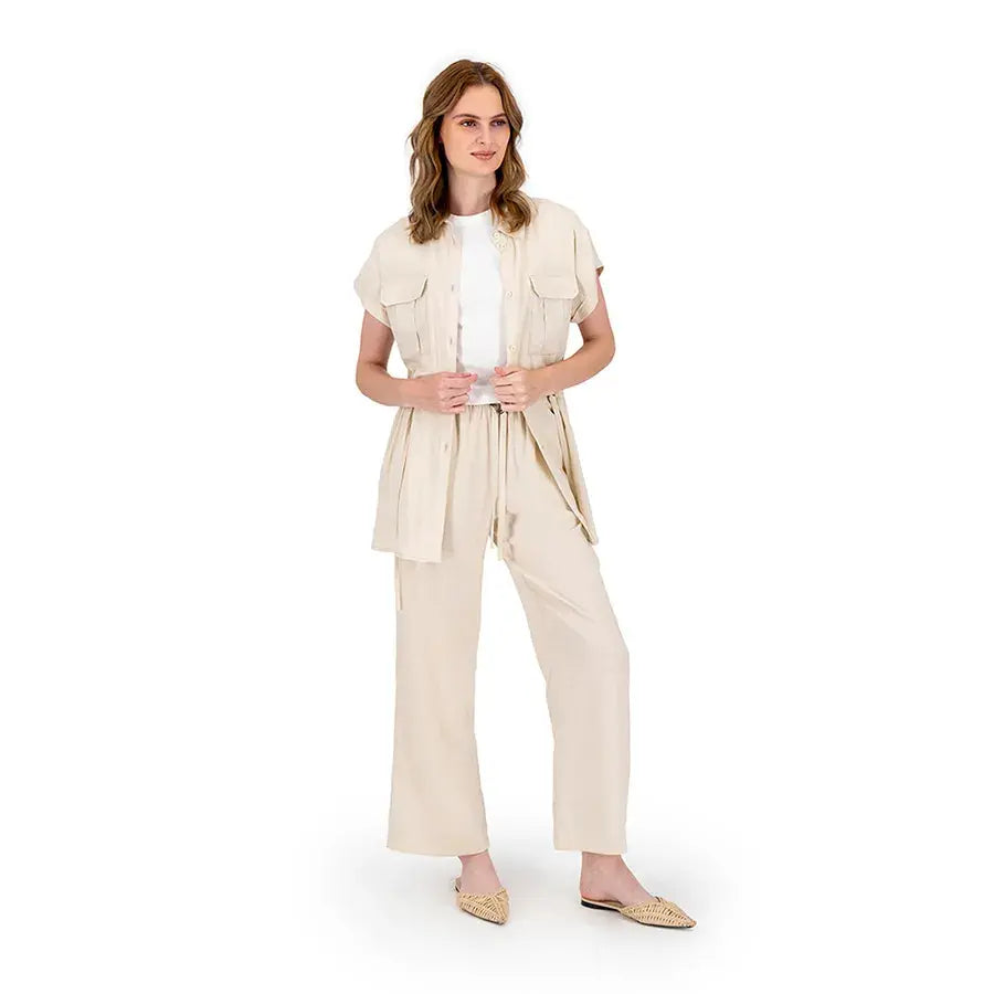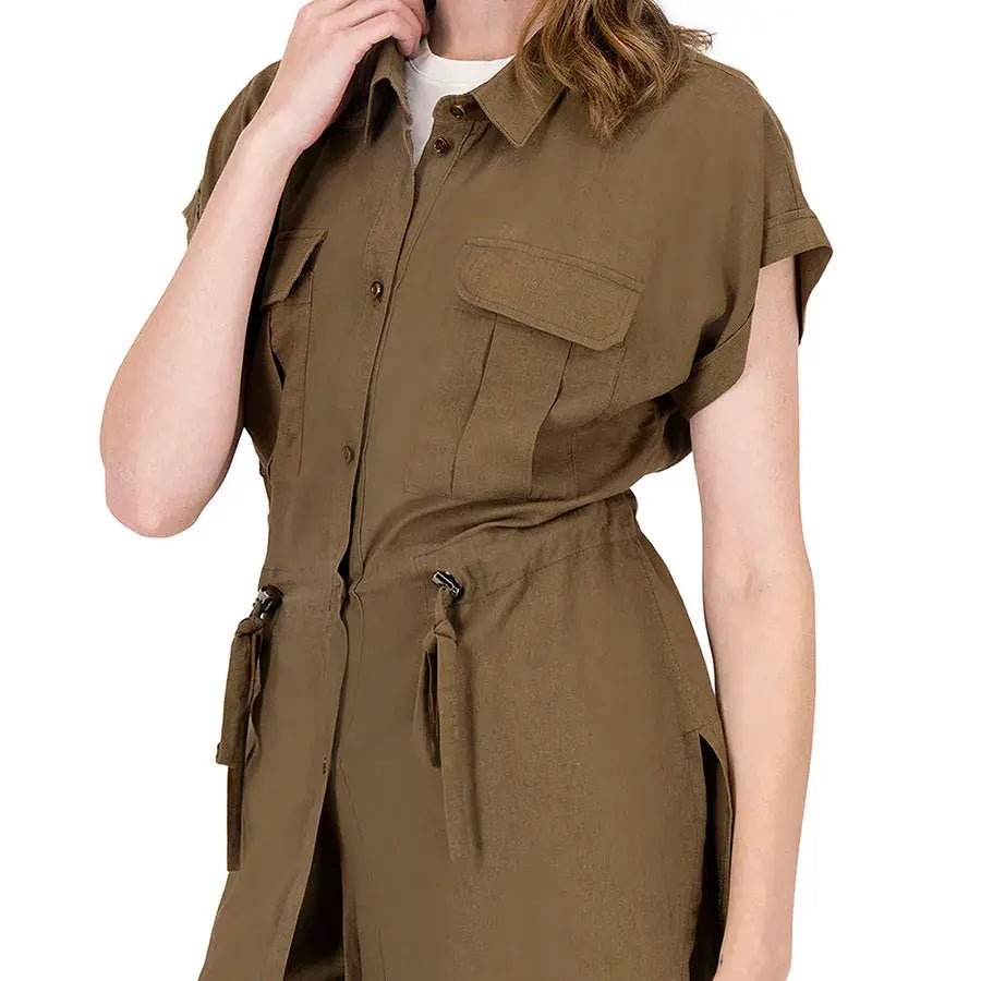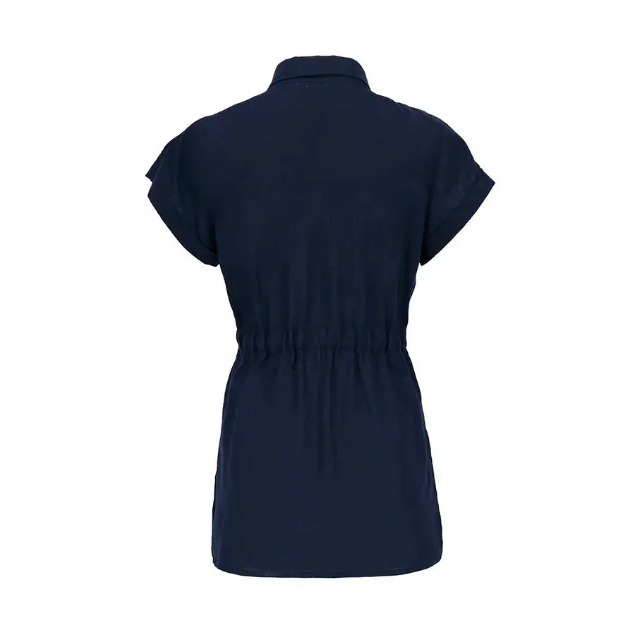 Blusa de corte recto con cuello tipo camisa, botones al frente y jaretas ajustables que permiten definir la cintura. Incluye bolsas en el pecho para un toque funcional y estilizado.