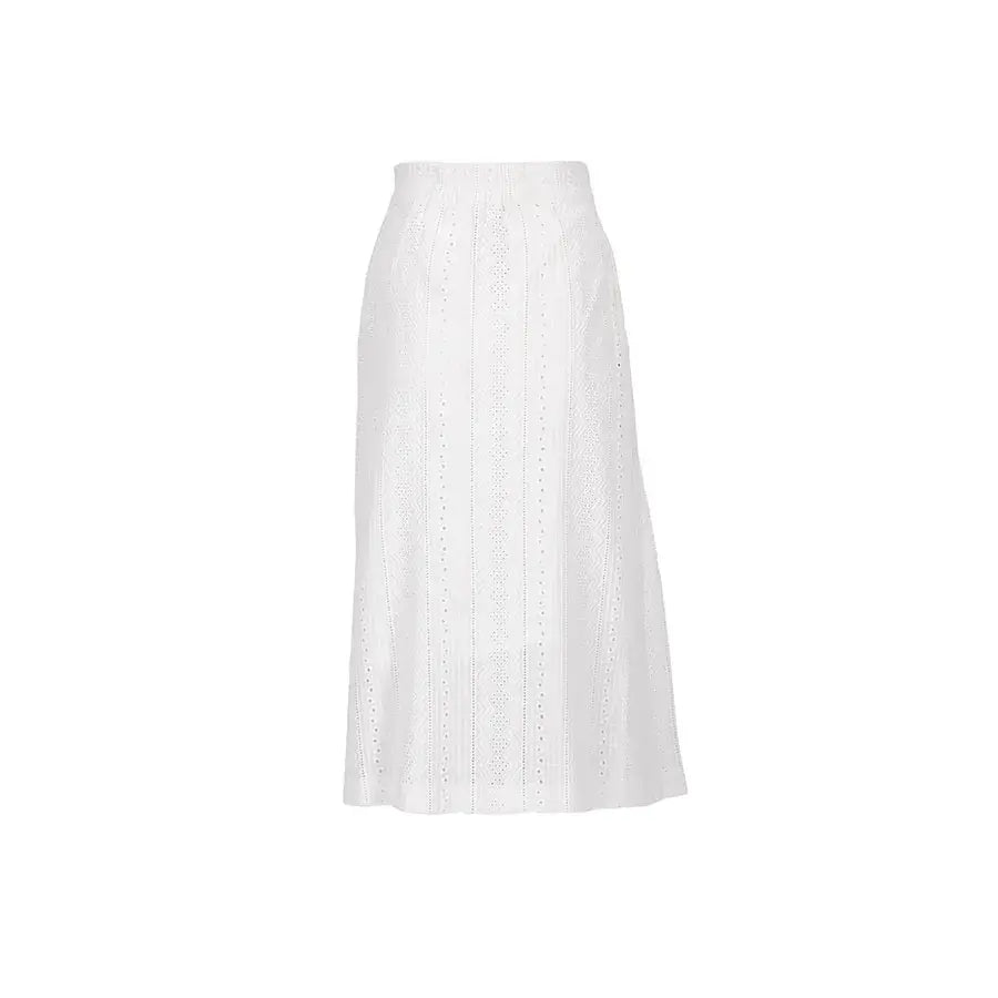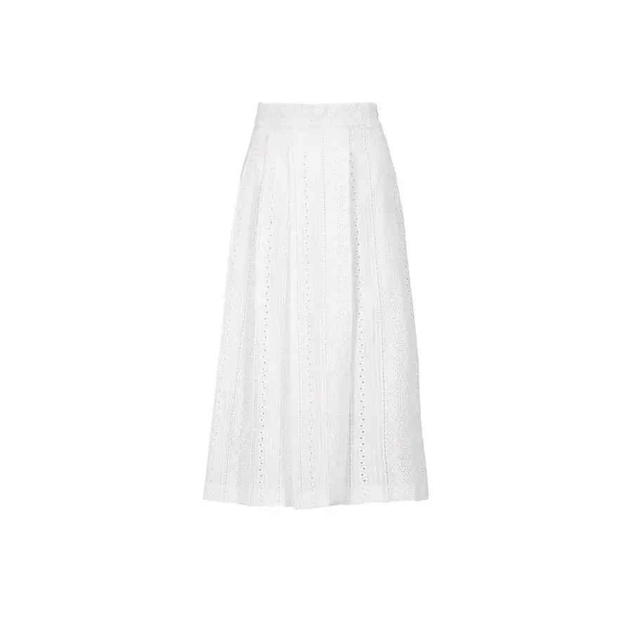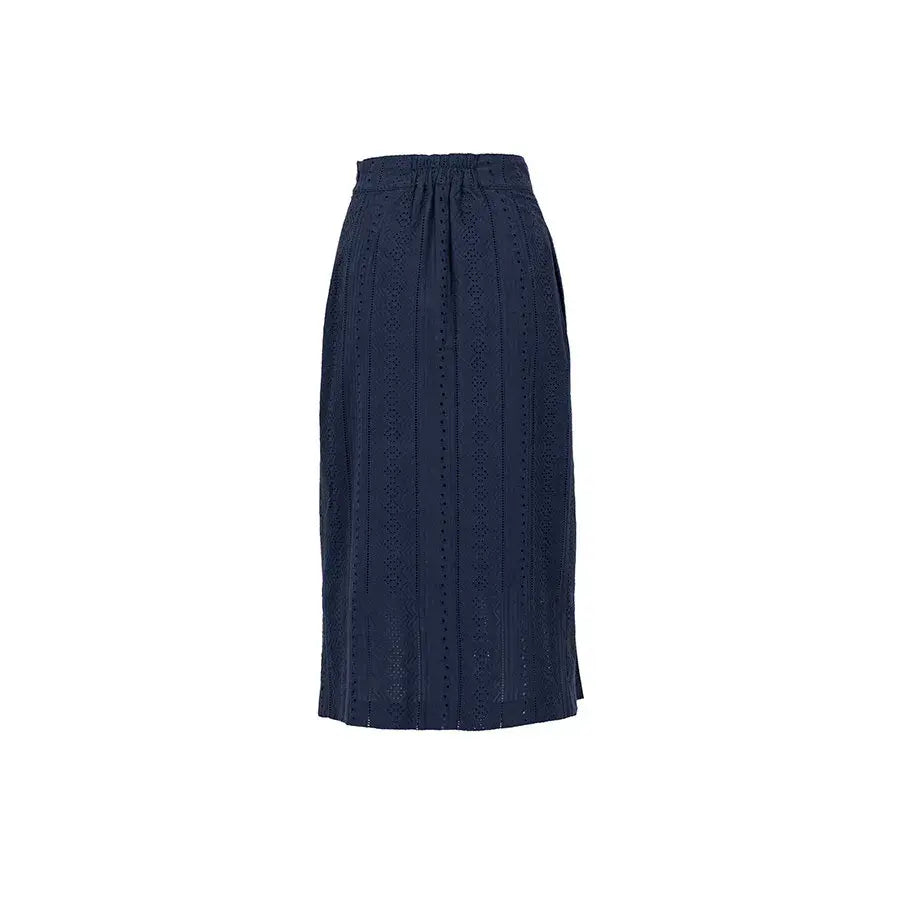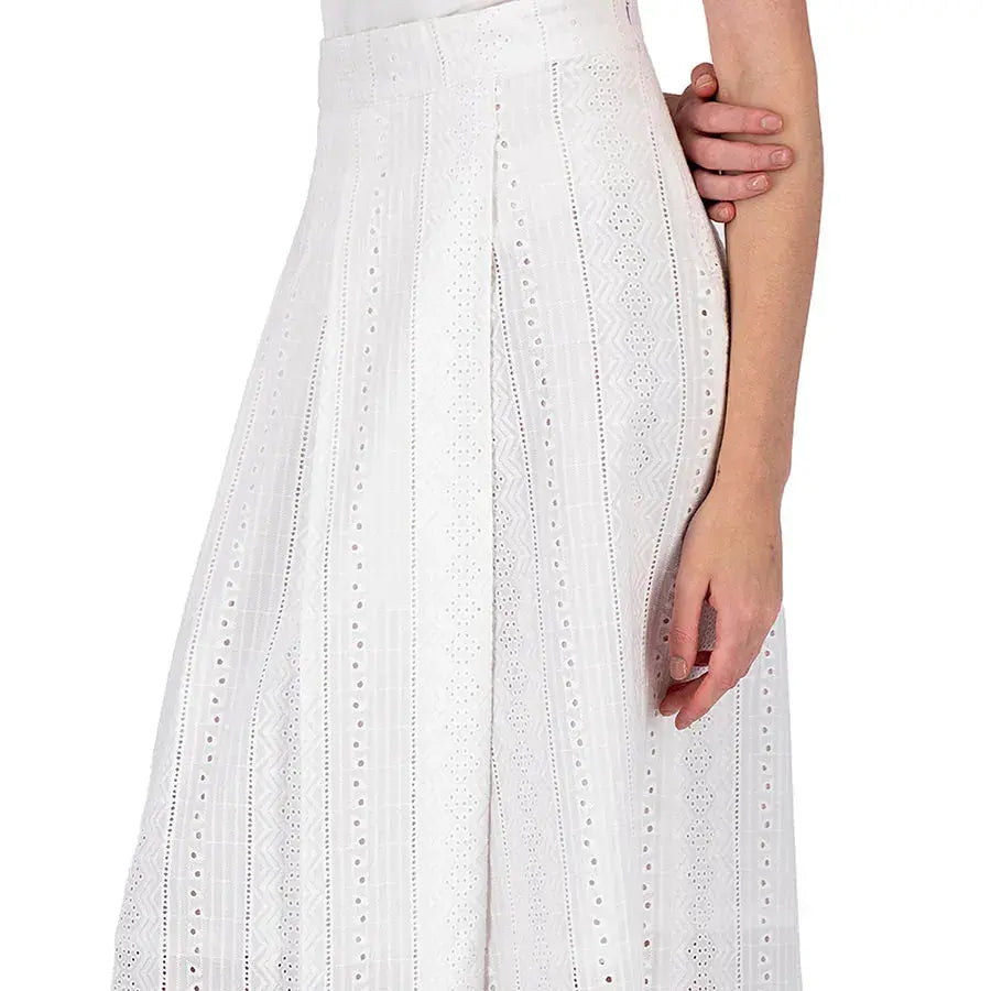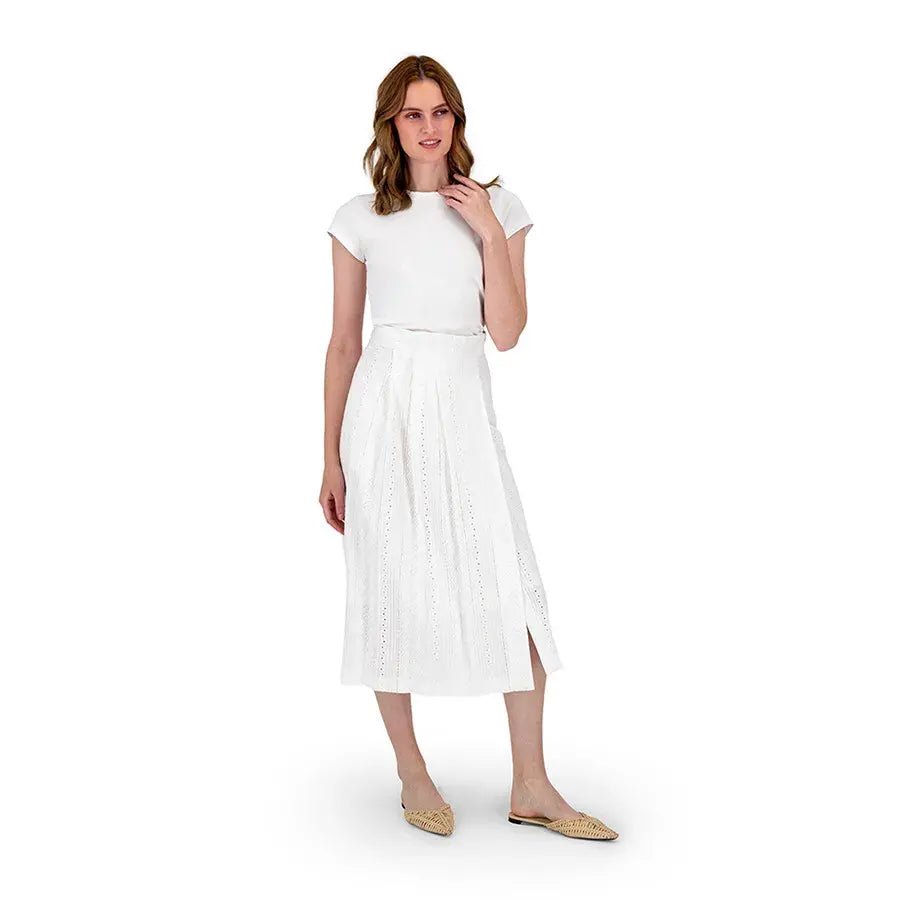 Falda de cintura alta con tablones marcados y apertura lateral que aporta movimiento. Confeccionada en tejido calado que le da un acabado fresco y detallado.
