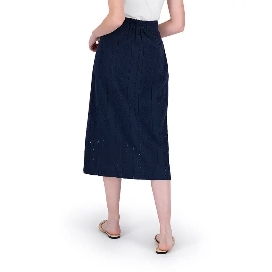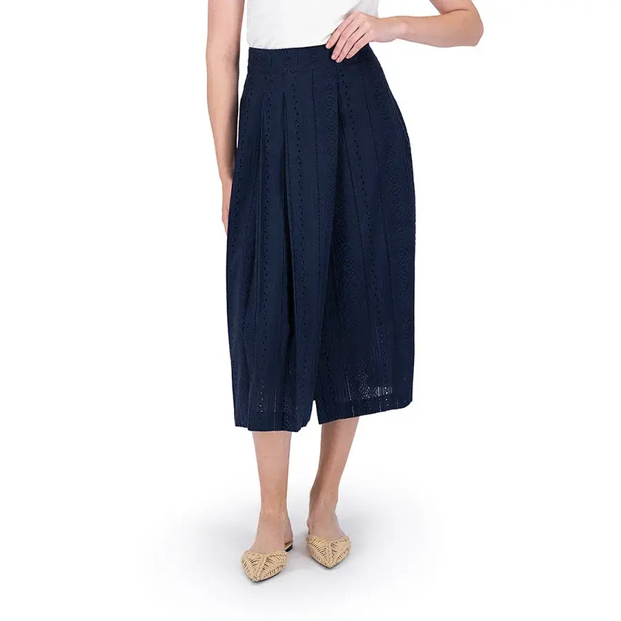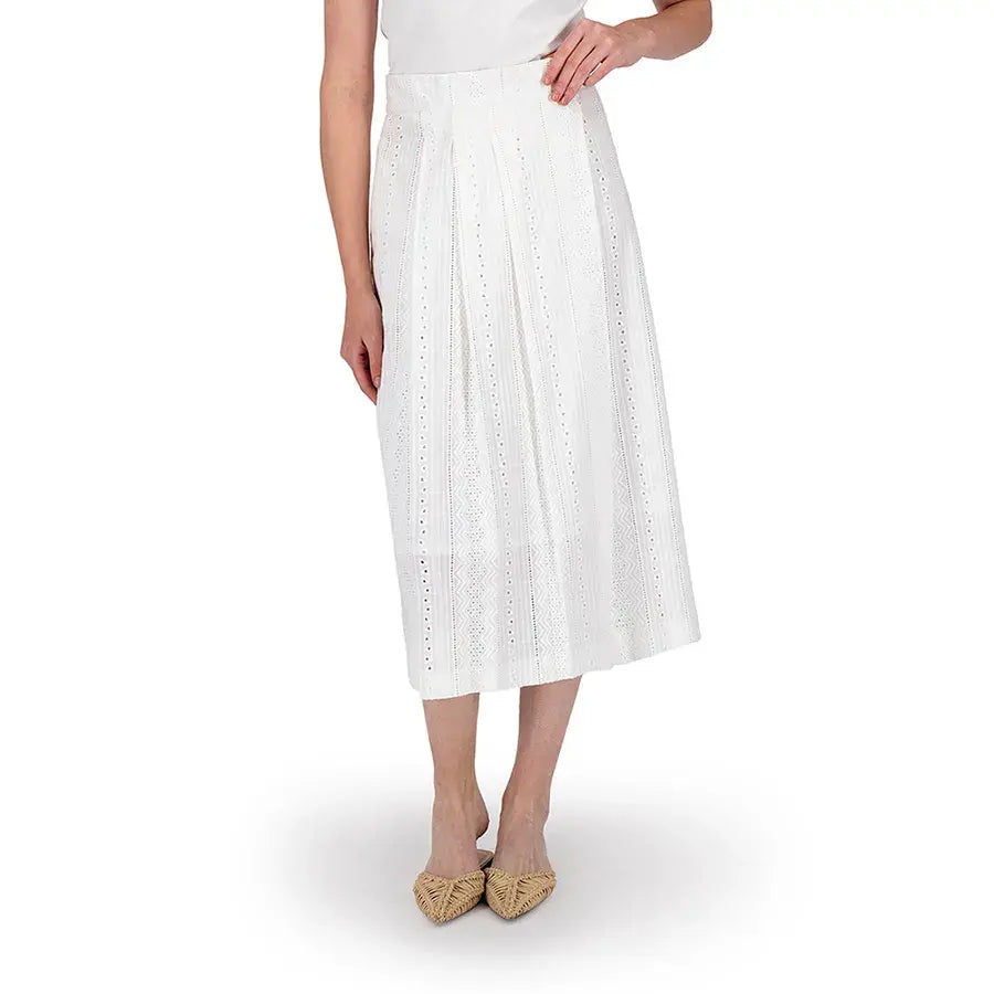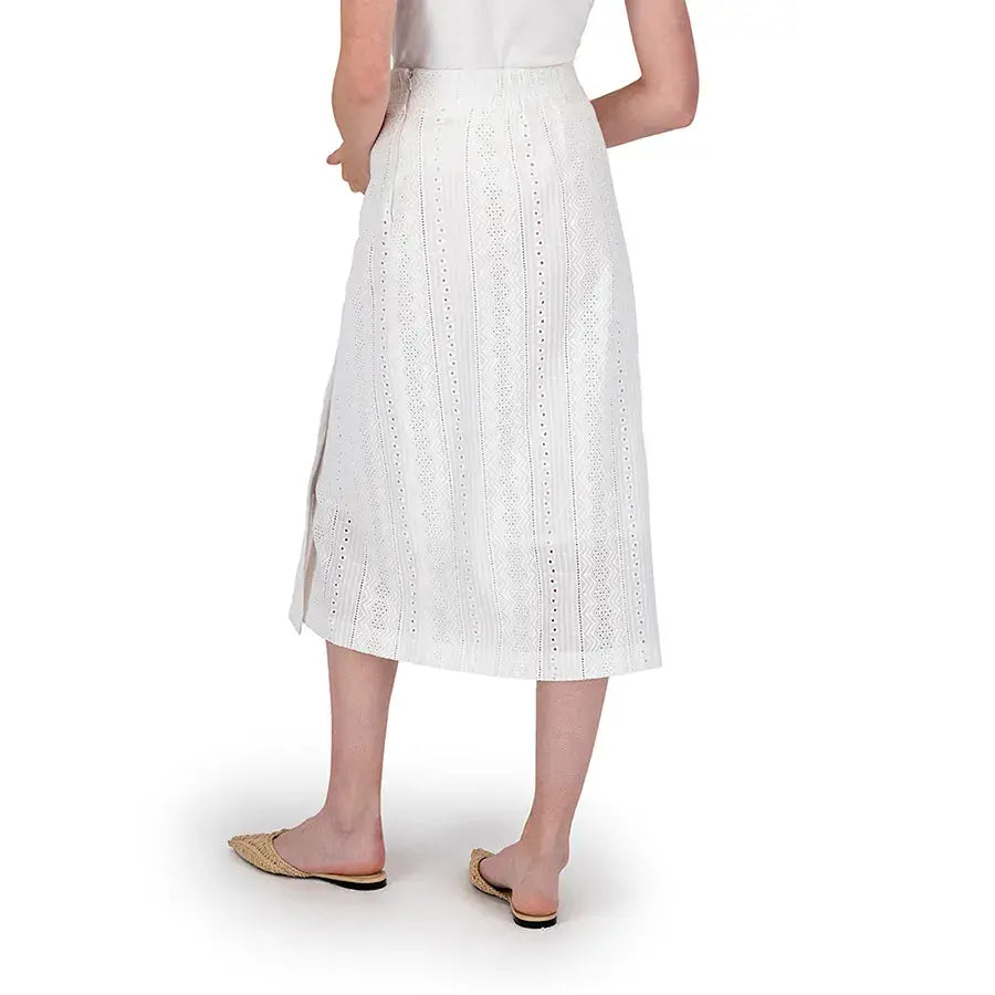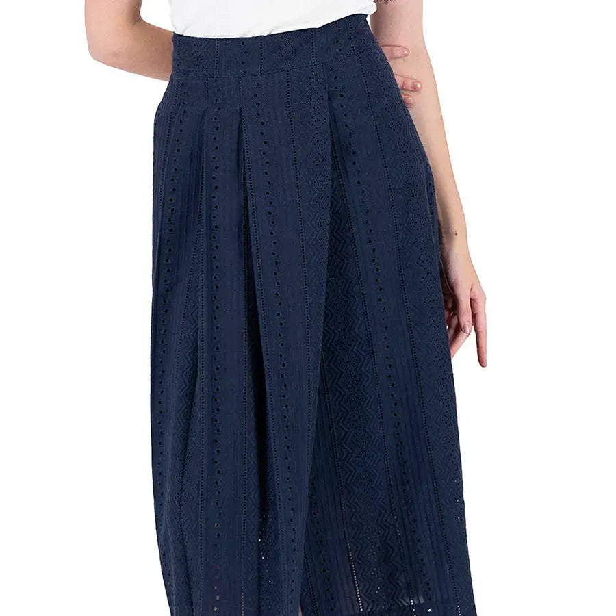 Falda de cintura alta con tablones marcados y apertura lateral que aporta movimiento. Confeccionada en tejido calado que le da un acabado fresco y detallado.