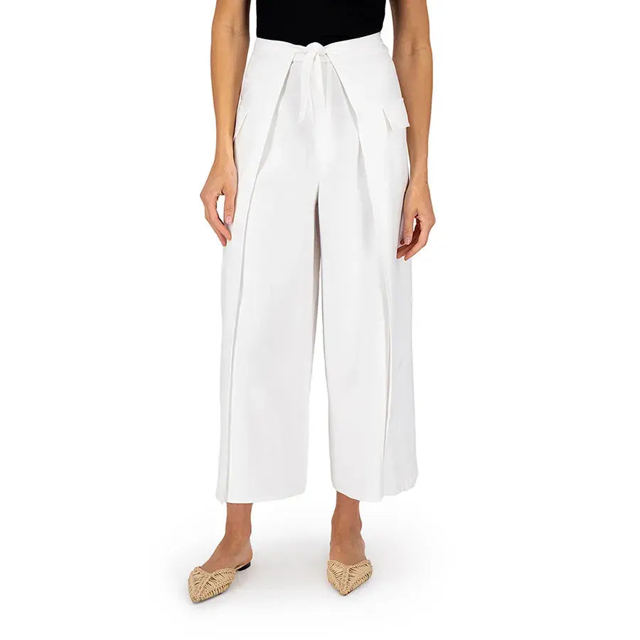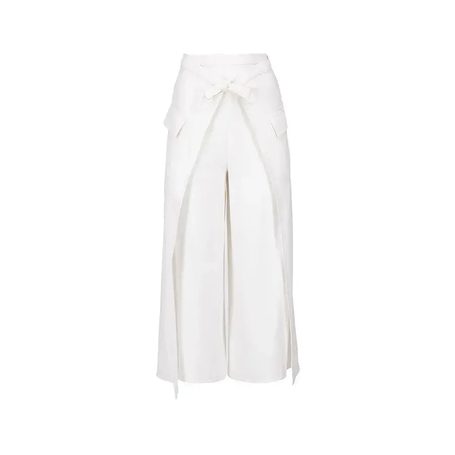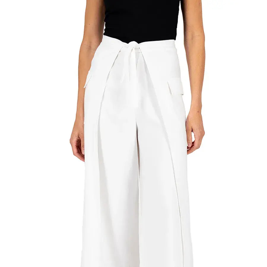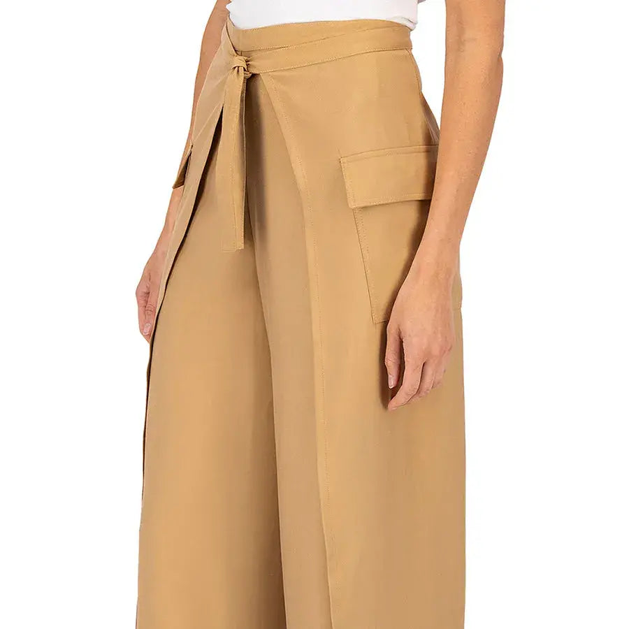 Pantalón tipo palazzo con diseño envolvente y atadura en la cintura. Cuenta con bolsas laterales tipo cargo que le dan un toque funcional y relajado.