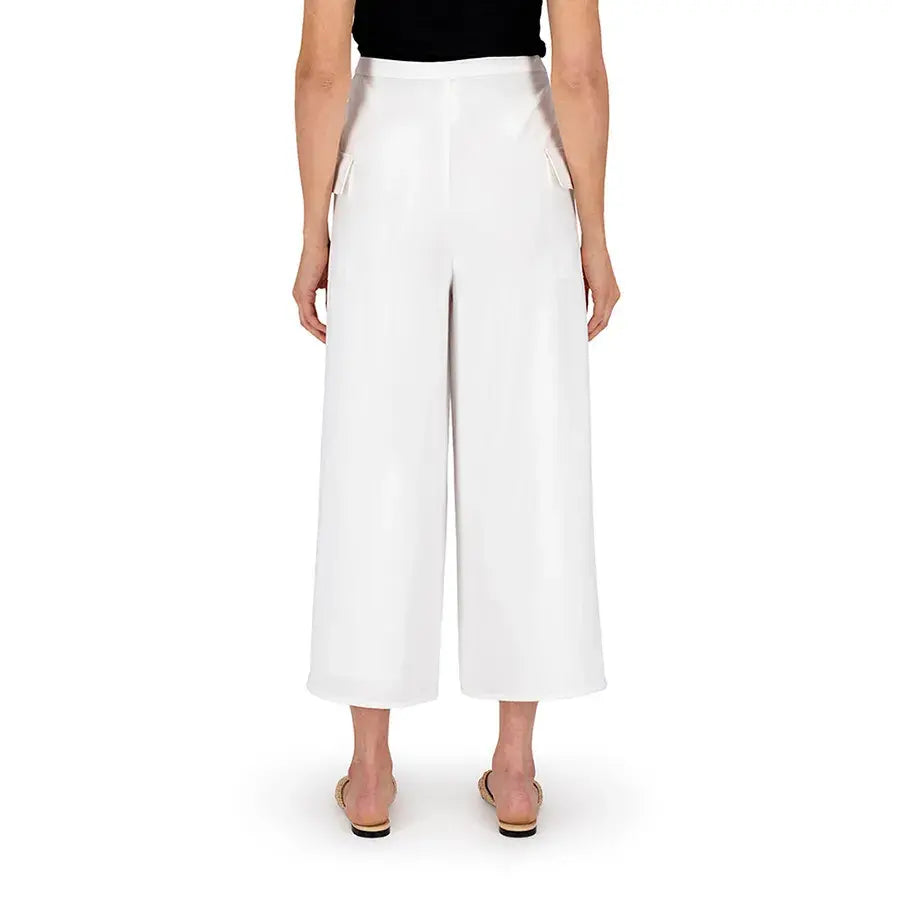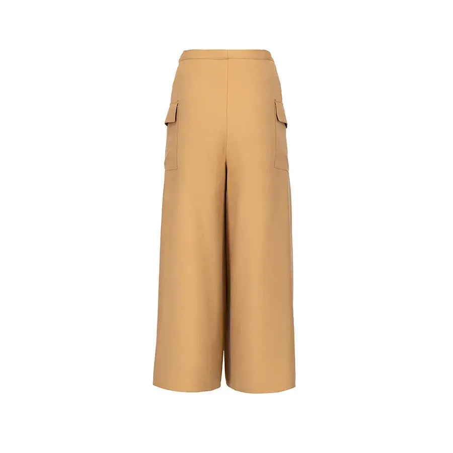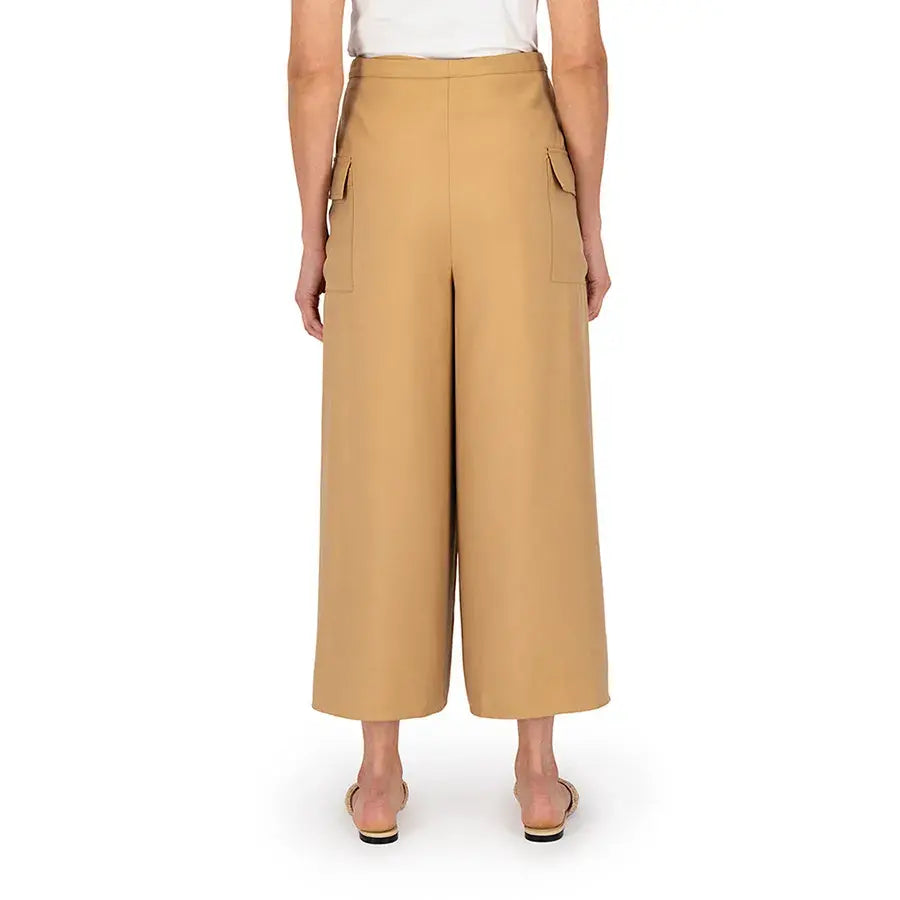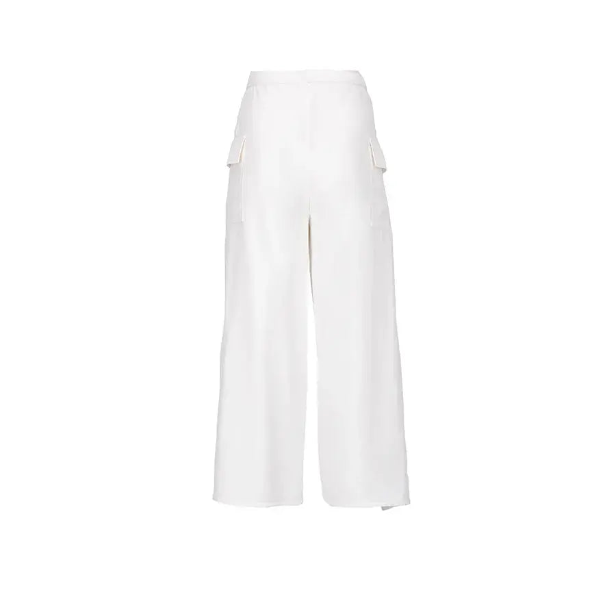 Pantalón tipo palazzo con diseño envolvente y atadura en la cintura. Cuenta con bolsas laterales tipo cargo que le dan un toque funcional y relajado.