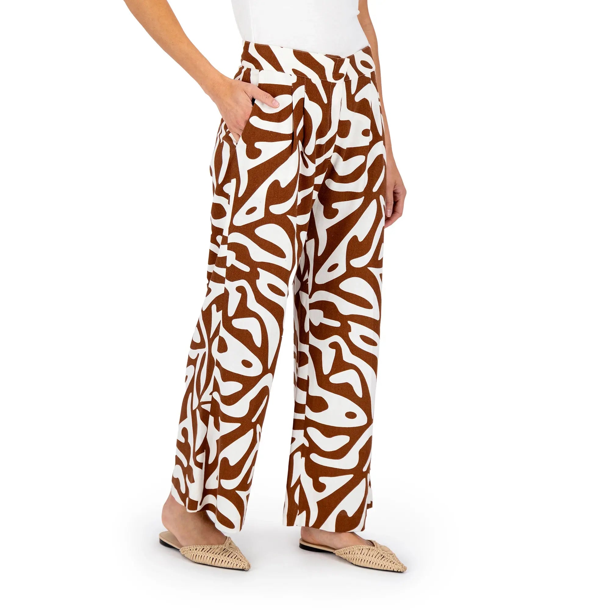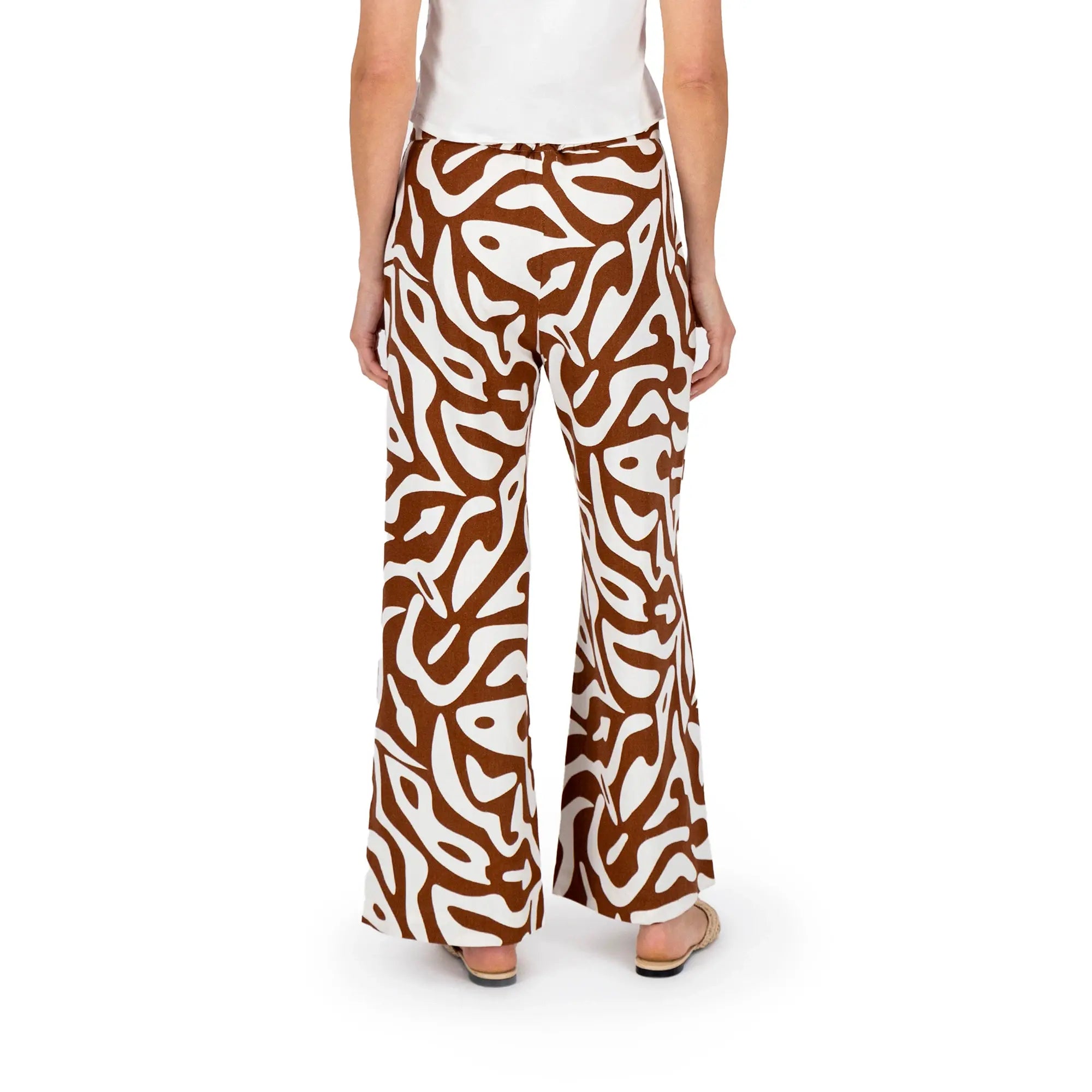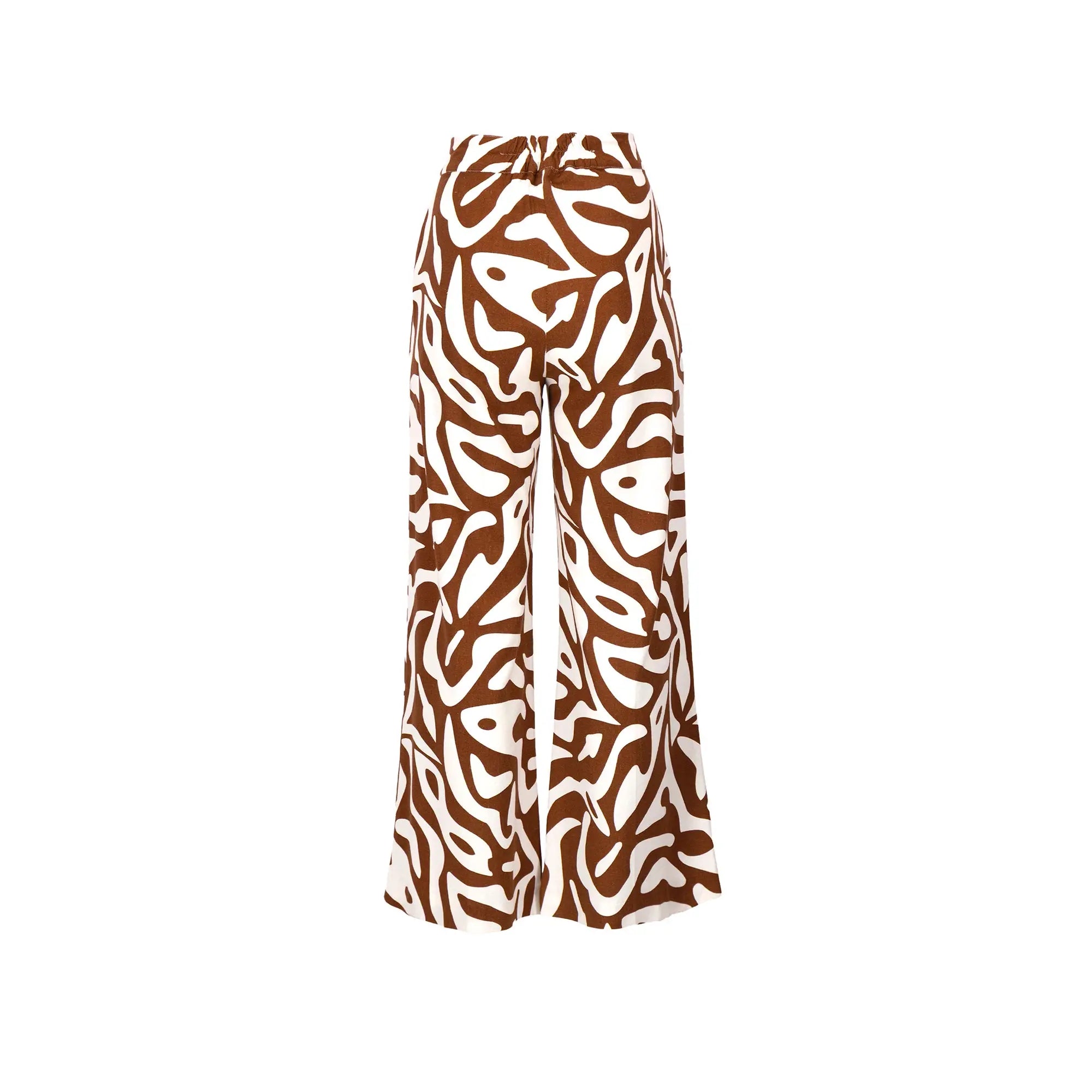 Pantalón palazzo de tiro alto en tejido estructurado con caída suave. Presenta un estampado orgánico en marrón y crema, inspirado en formas naturales. El diseño incluye pinzas frontales, bolsillos laterales y cintura definida con cierre oculto. Su silueta amplia y fluida aporta movimiento al andar y versatilidad para llevar con piezas superiores ligeras o estructuradas.