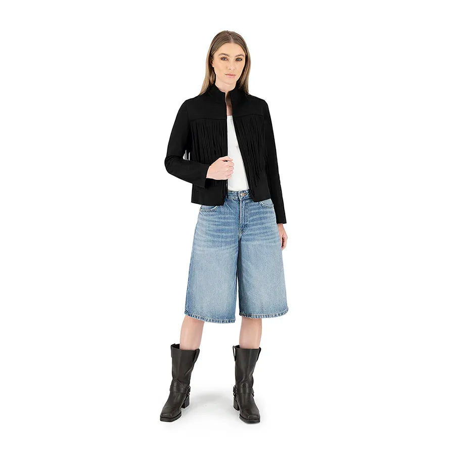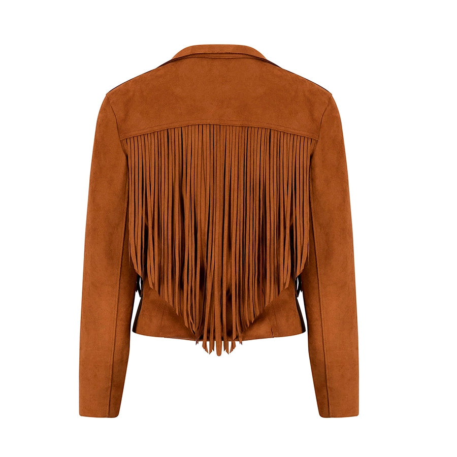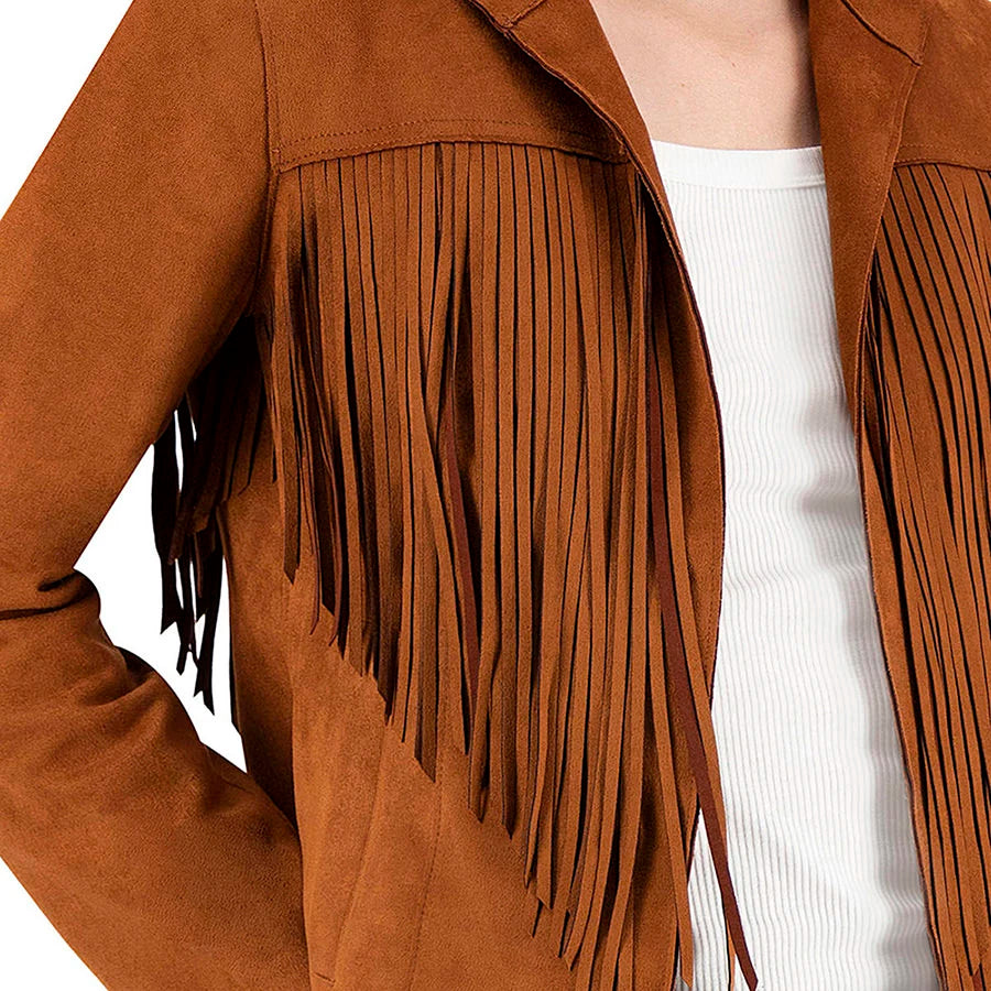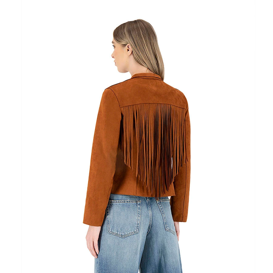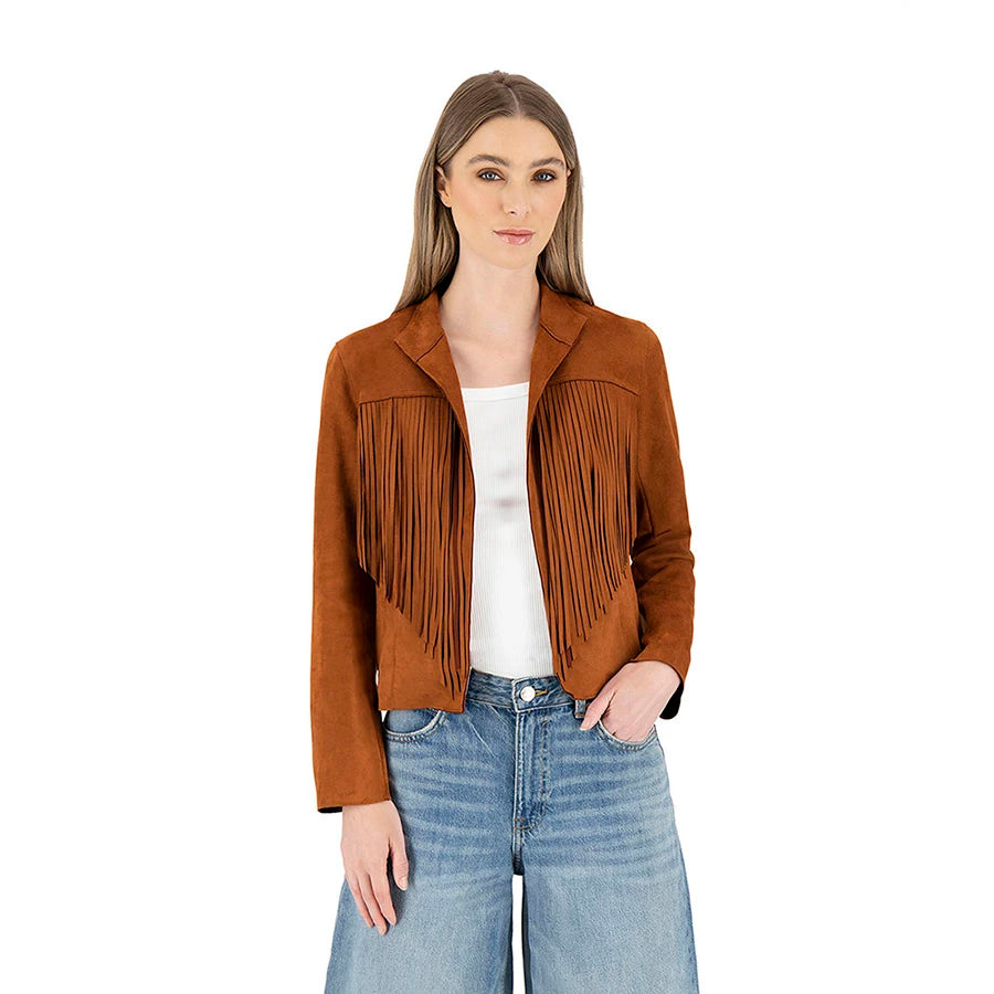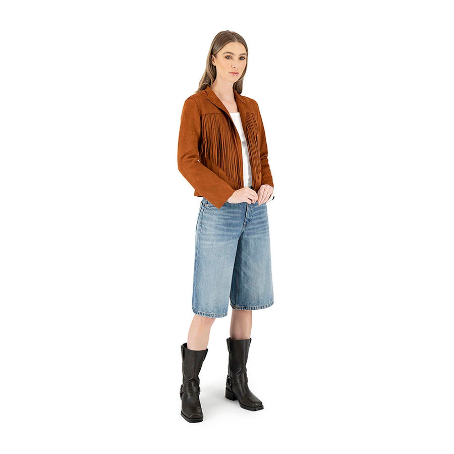Chaqueta corta estilo vaquero en gamuza suave color marrón caramelo. Cuenta con flecos decorativos en la parte frontal y espalda. Diseño con cuello tipo solapa y frente abierto. El acabado aterciopelado de la gamuza aporta elegancia y textura al conjunto.