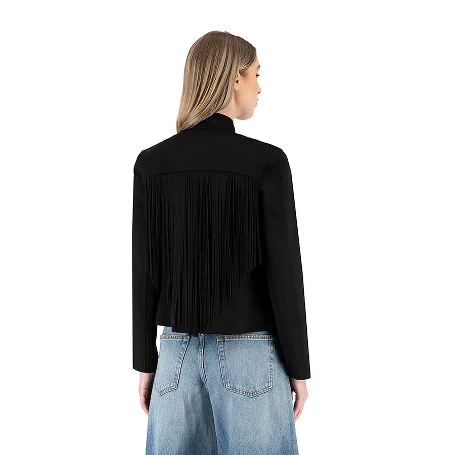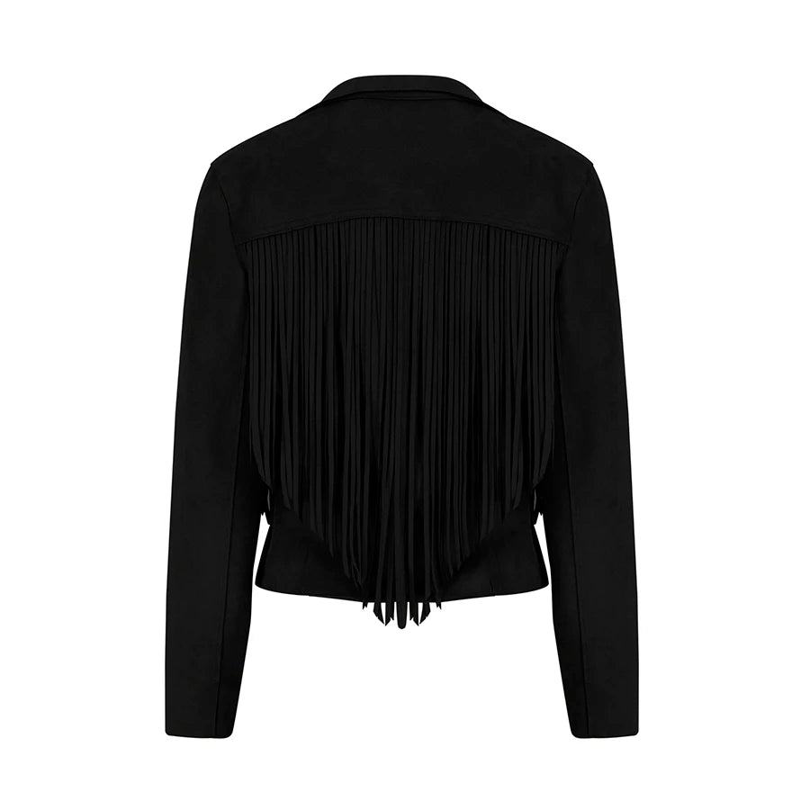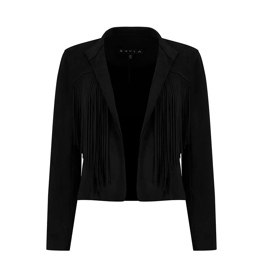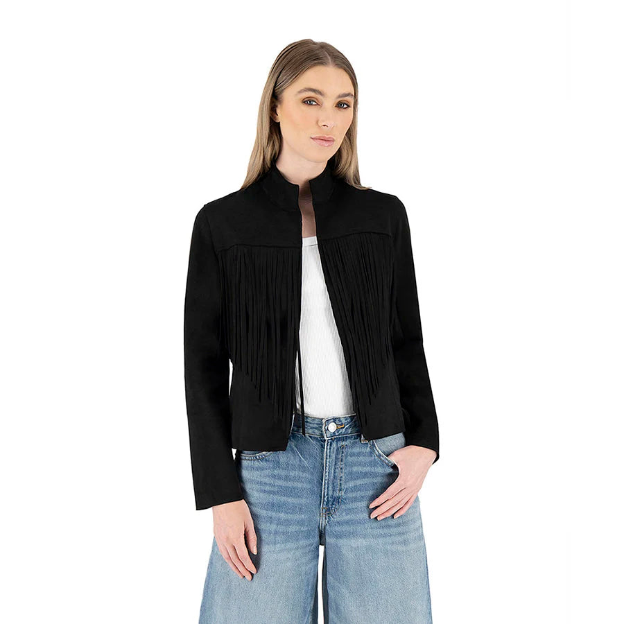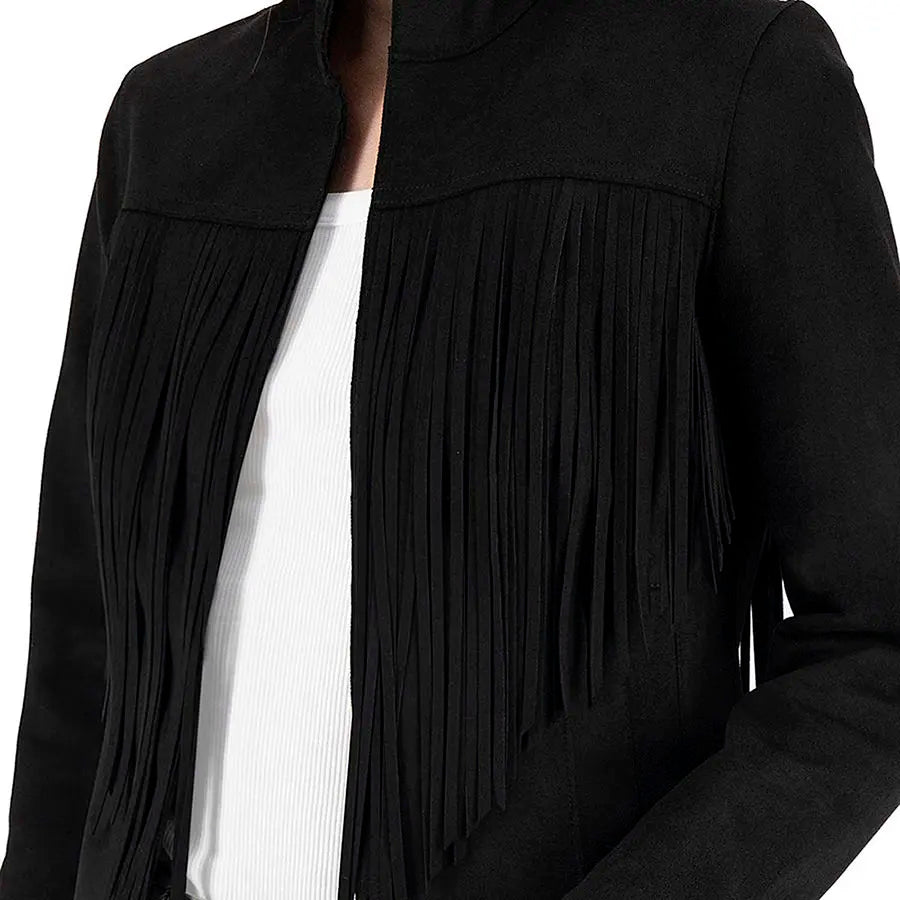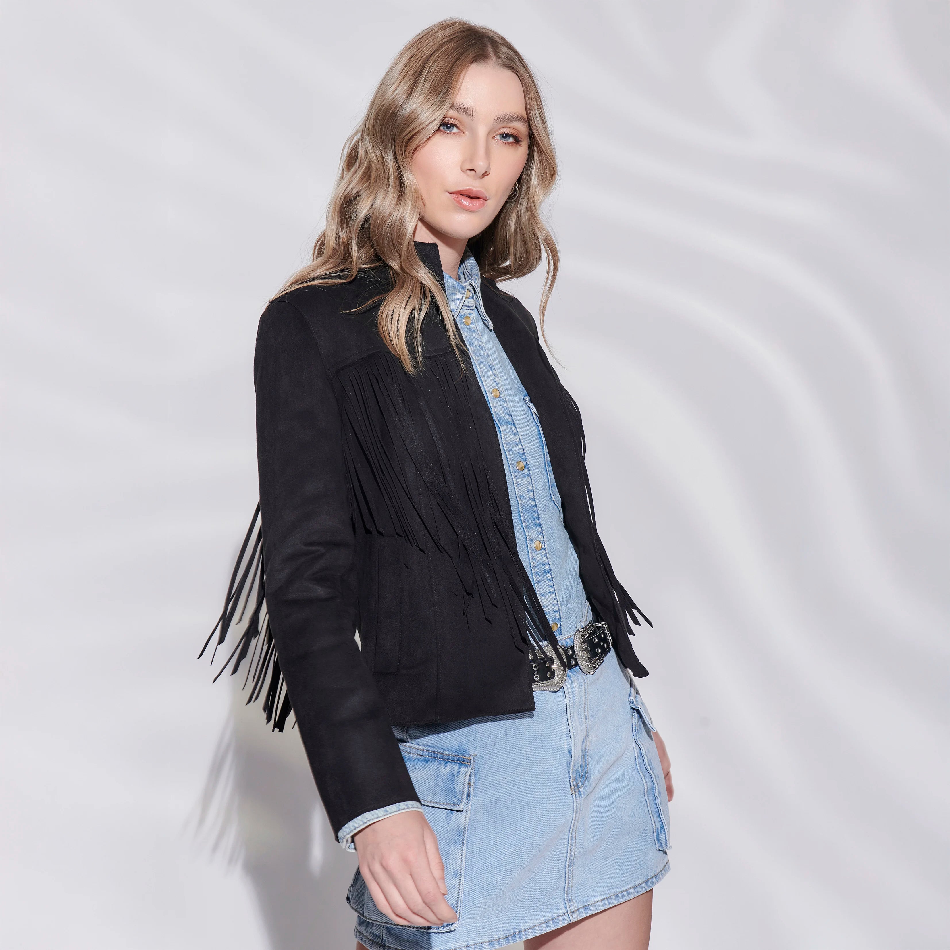 Chaqueta corta estilo vaquero en gamuza suave color marrón caramelo. Cuenta con flecos decorativos en la parte frontal y espalda. Diseño con cuello tipo solapa y frente abierto. El acabado aterciopelado de la gamuza aporta elegancia y textura al conjunto.