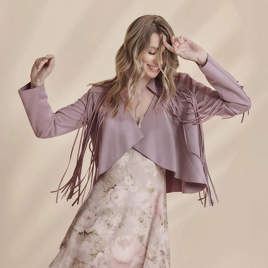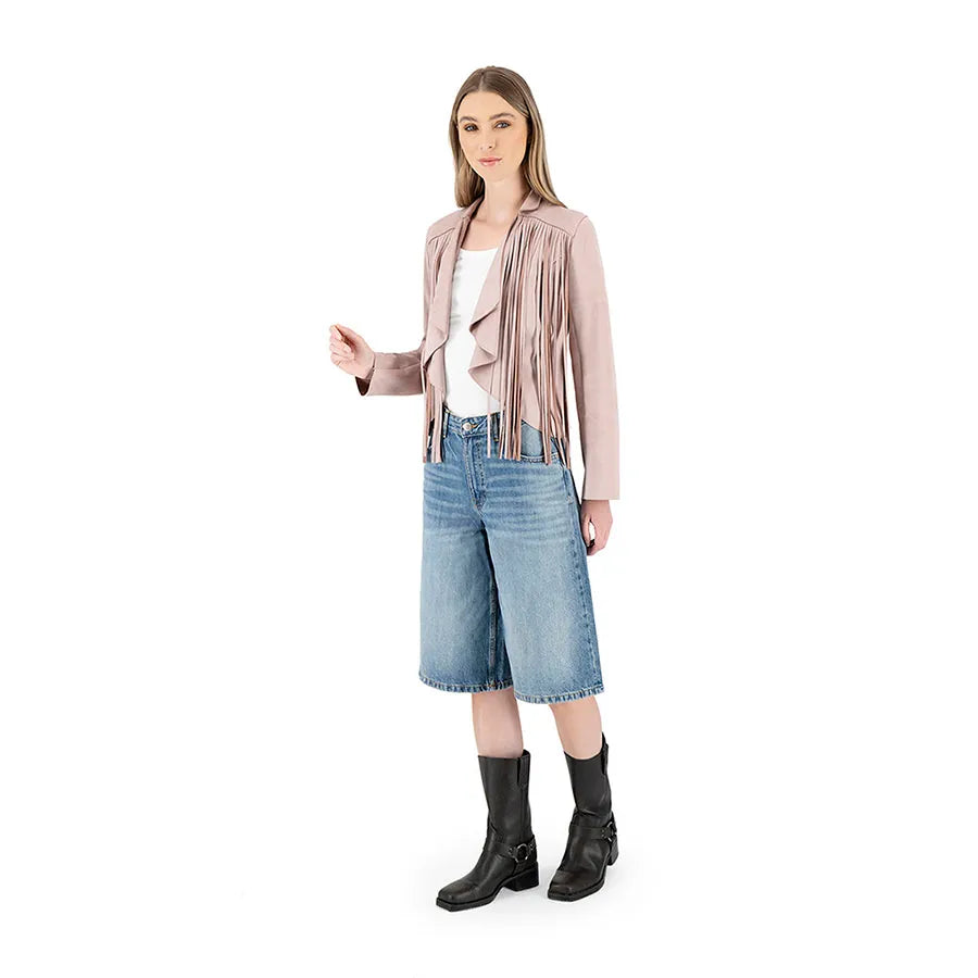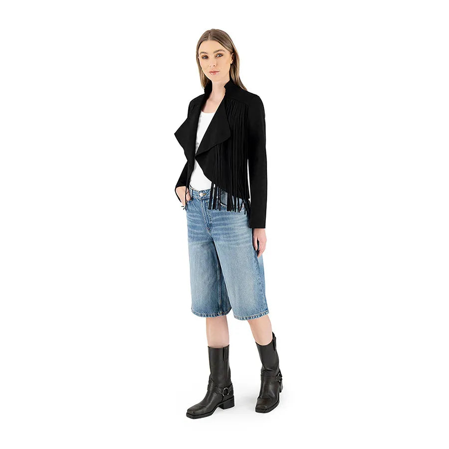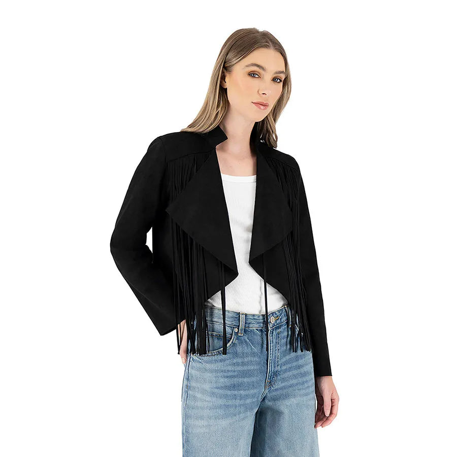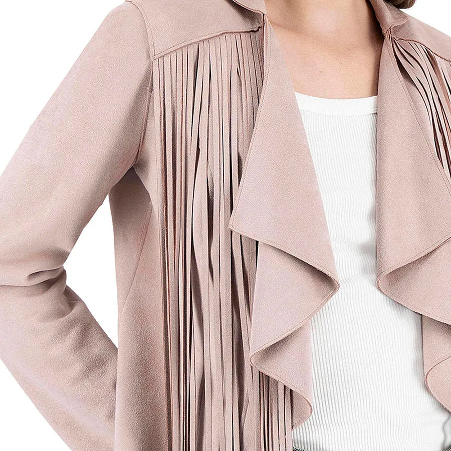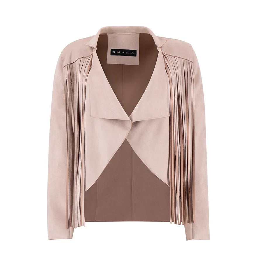 Chaqueta de suede con flecos. Presenta solapa cascada y cierre cruzado que crean una silueta favorecedora y sofisticada. Los flecos en la parte frontal aportan movimiento y textura distintiva, mientras que su corte cropped estiliza la figura
