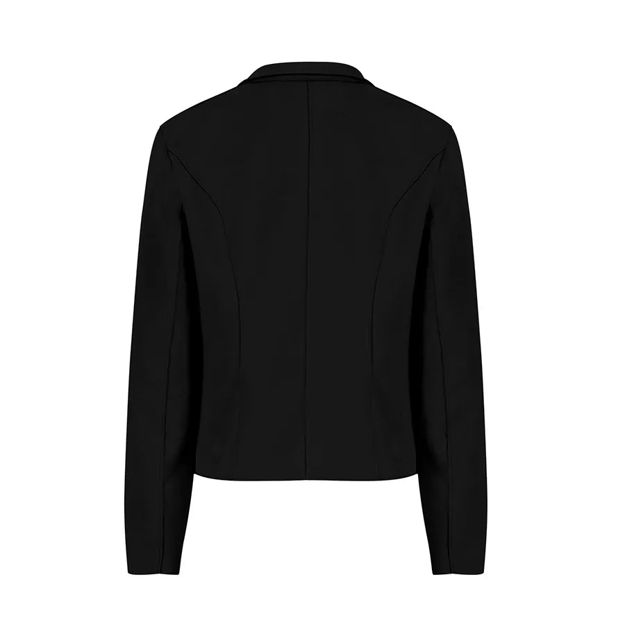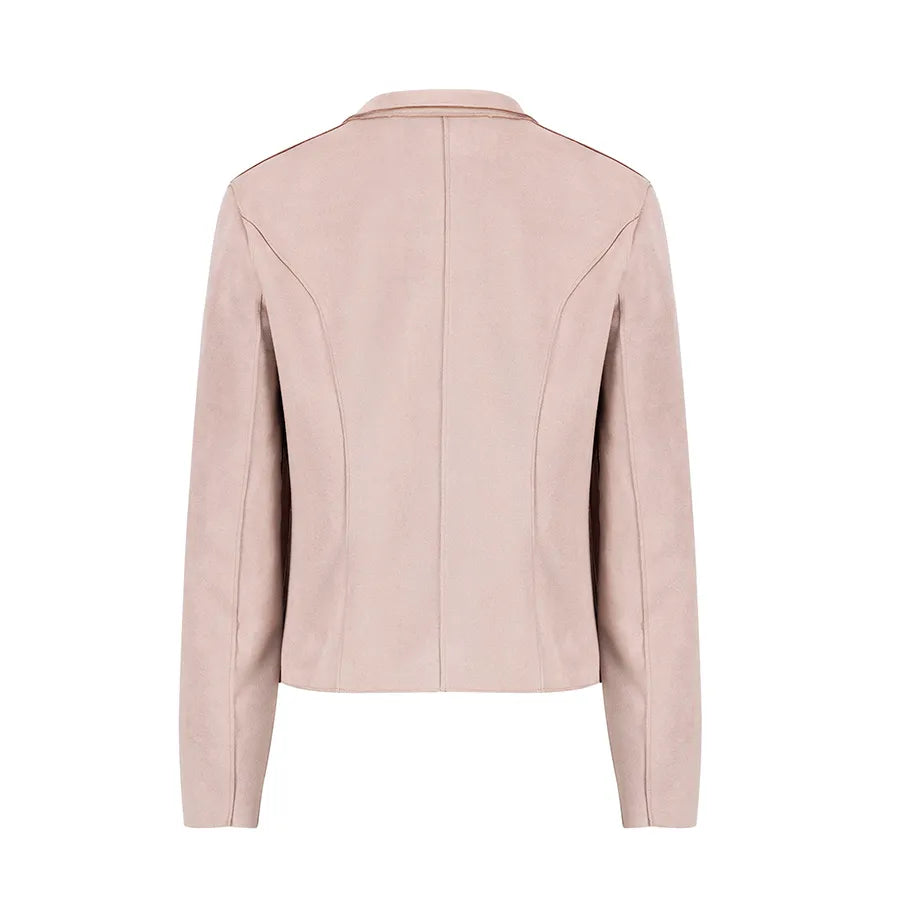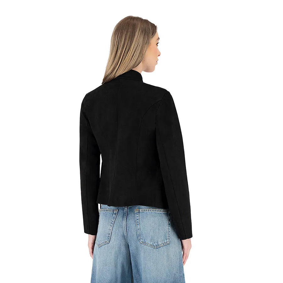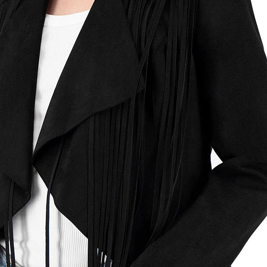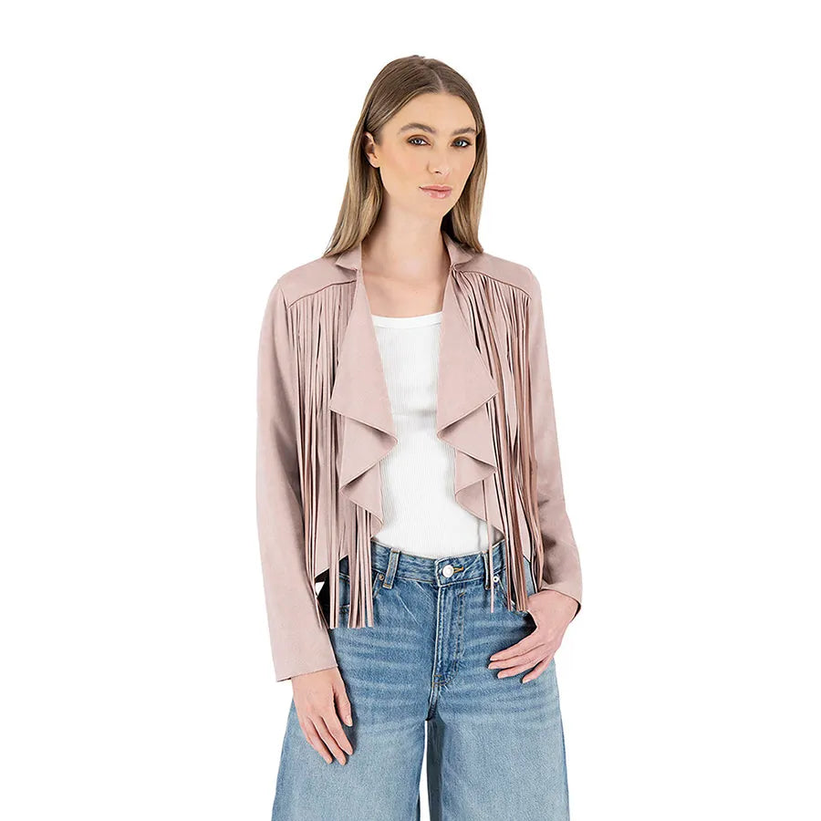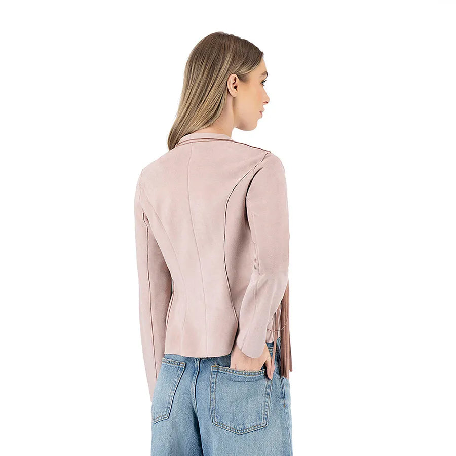 Chaqueta de suede con flecos. Presenta solapa cascada y cierre cruzado que crean una silueta favorecedora y sofisticada. Los flecos en la parte frontal aportan movimiento y textura distintiva, mientras que su corte cropped estiliza la figura