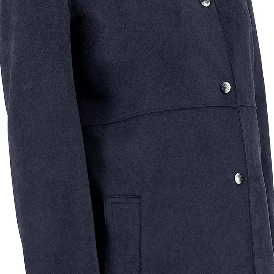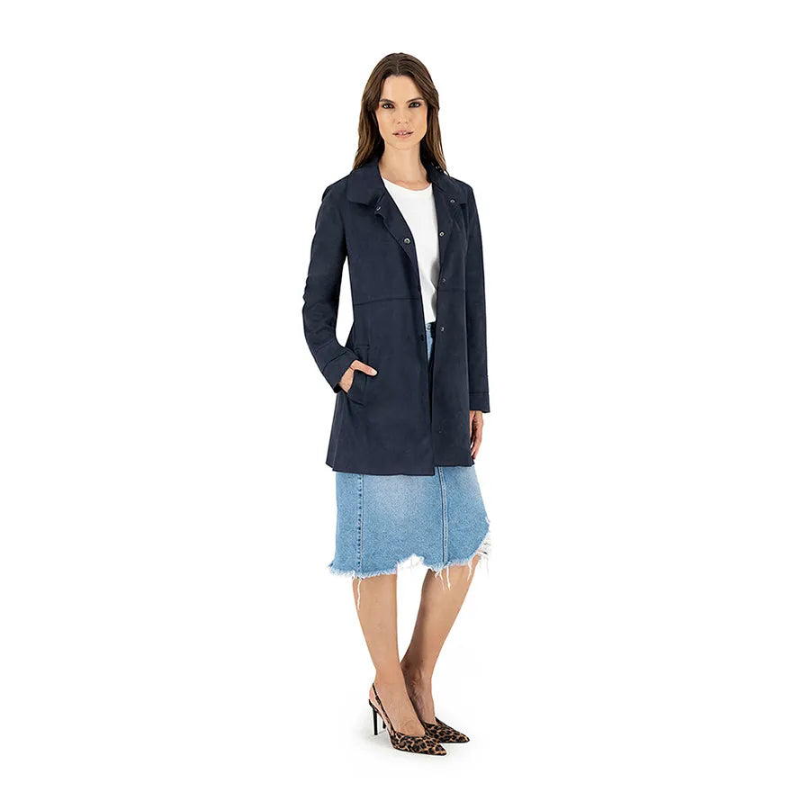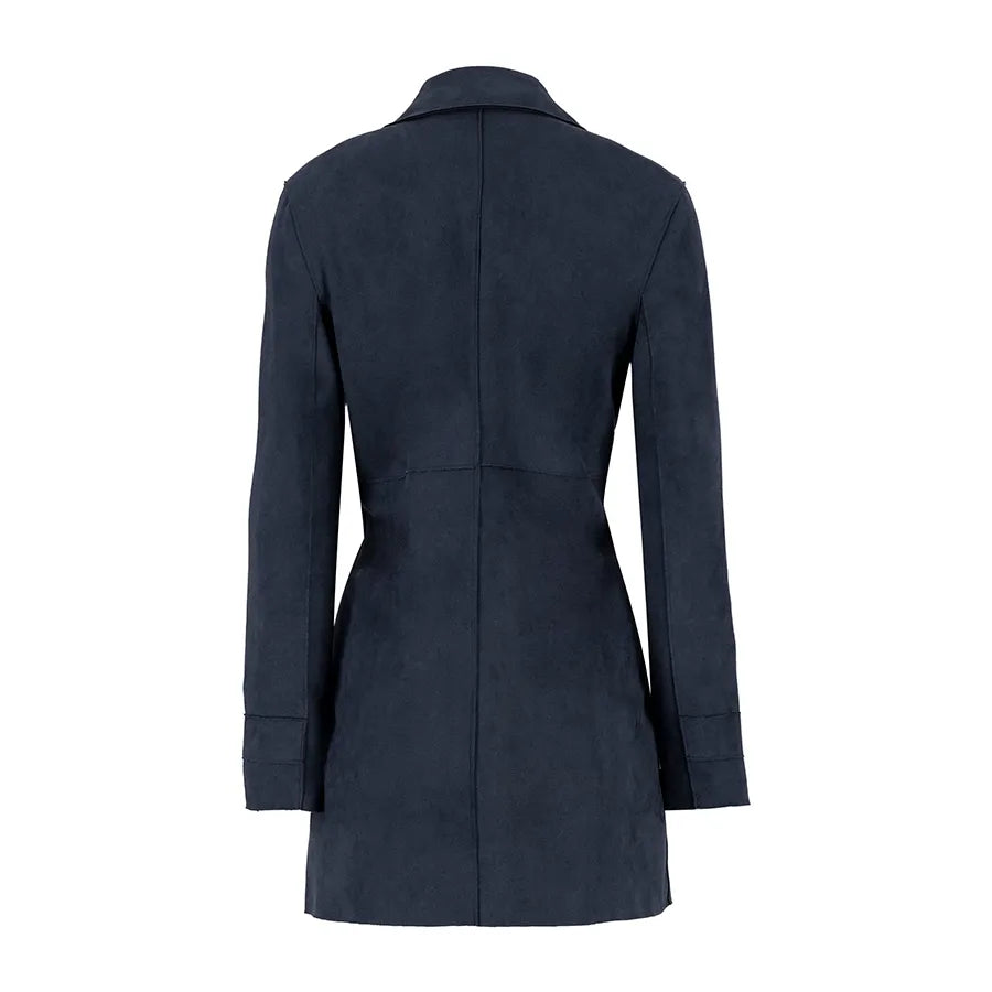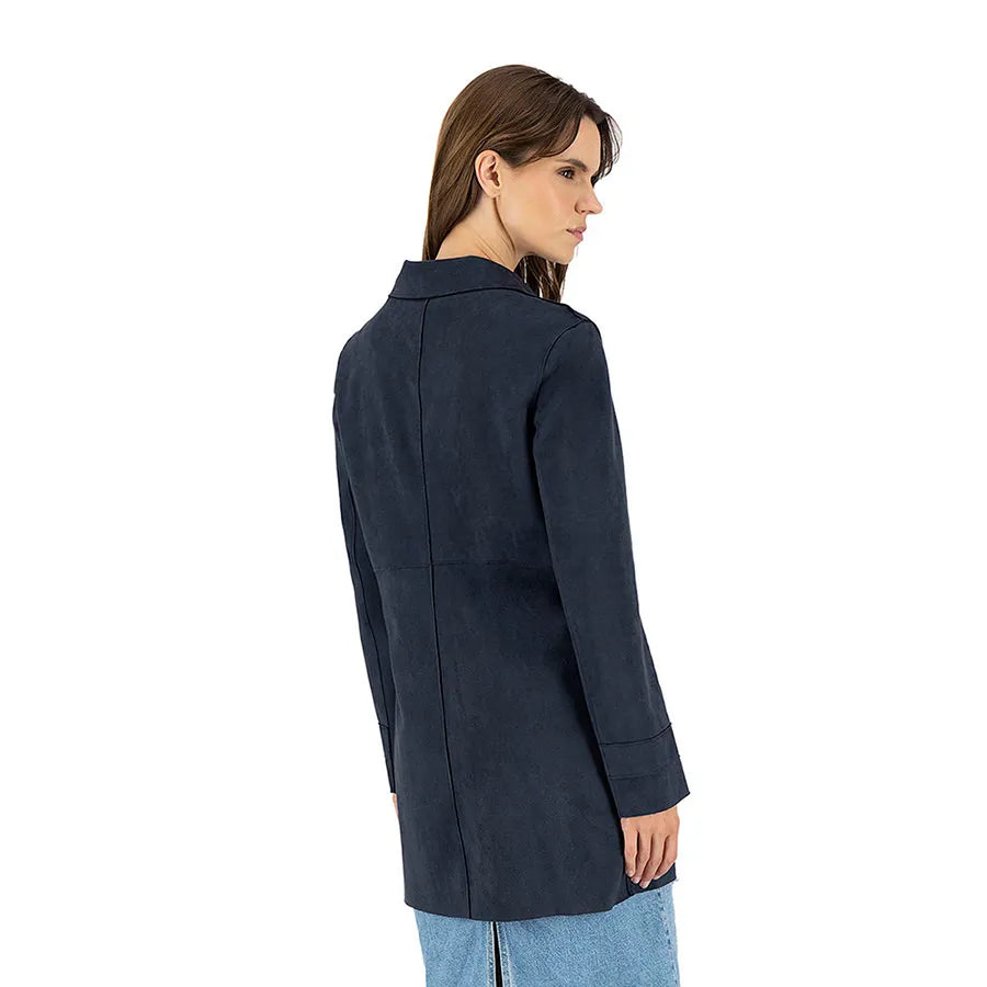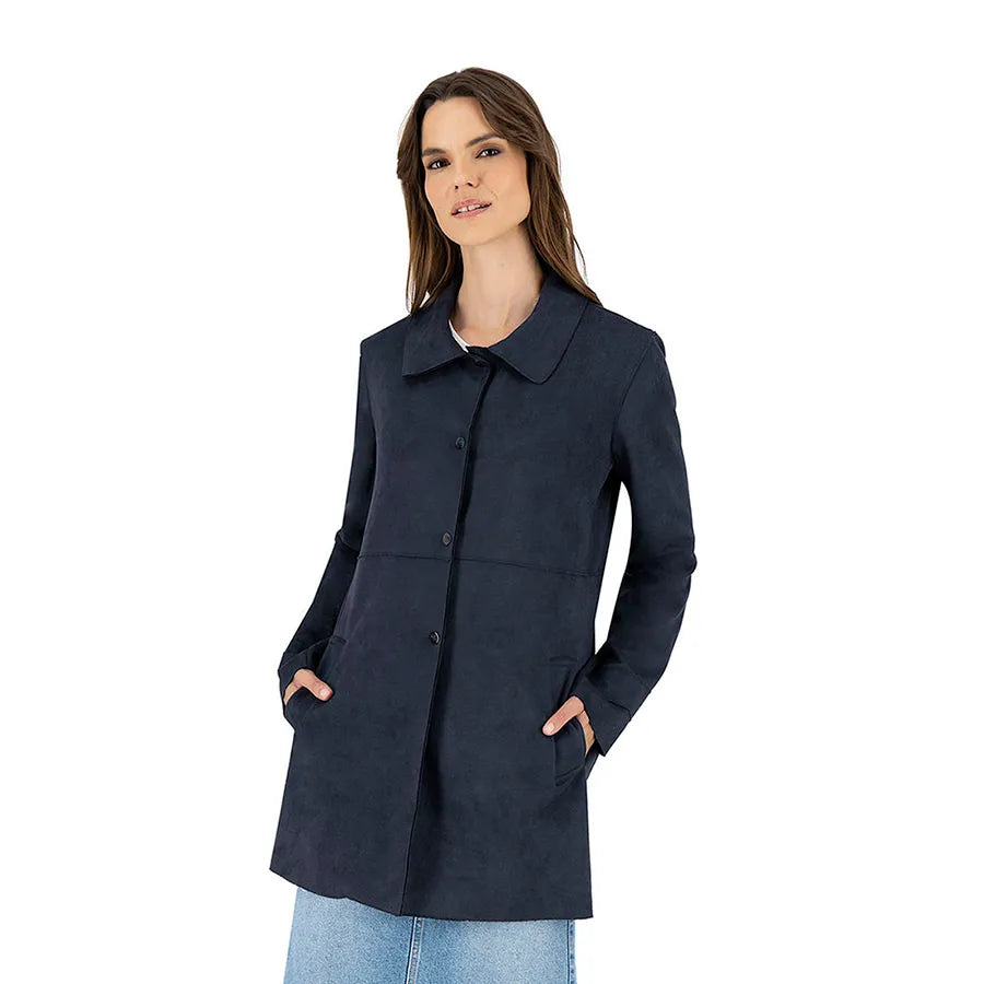 Chaqueta de Suede Larga para mujer. Presenta una elegante silueta estructurada que estiliza la figura, sofisticado cuello clásico que aporta distinción, y cierre frontal con botones que realzan su diseño atemporal. Confeccionada en suave material de gamuza que brinda comodidad y versatilidad para complementar cualquier look con estilo refinado.