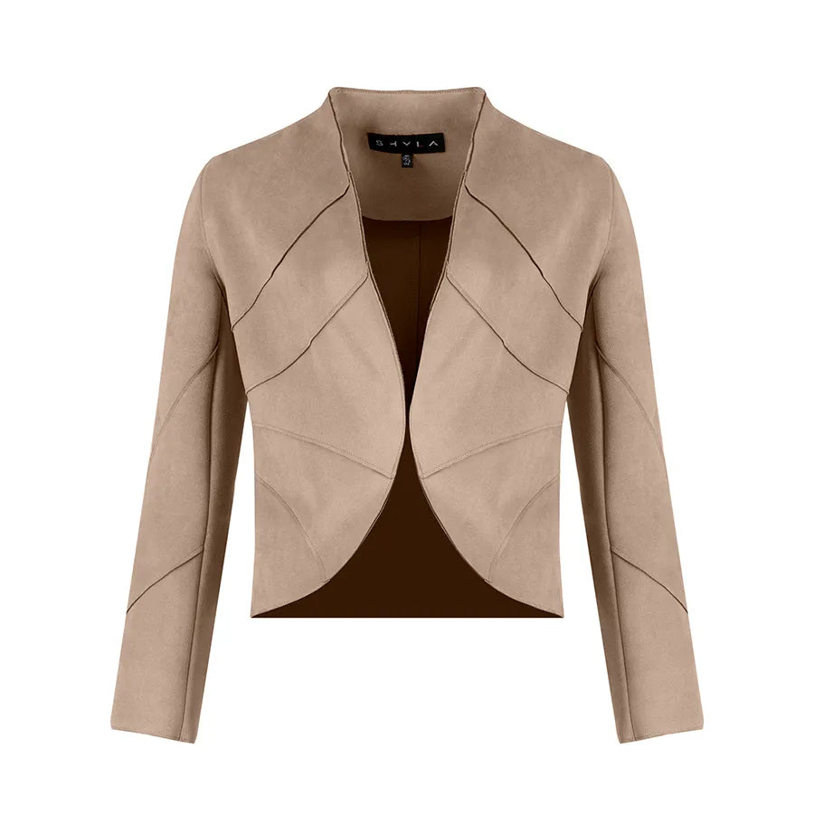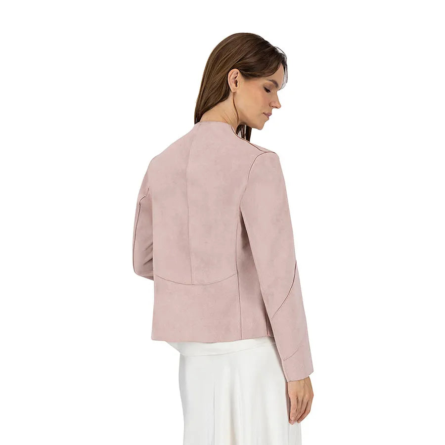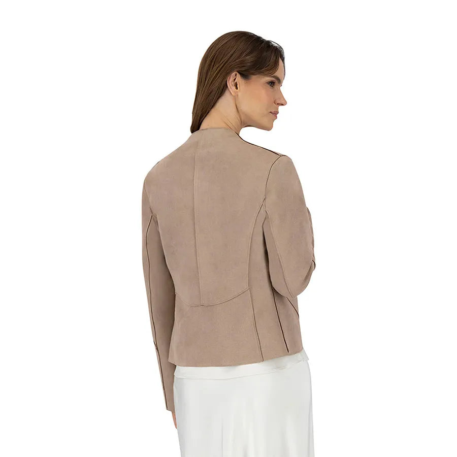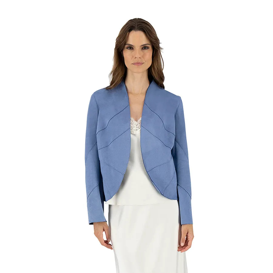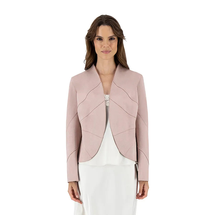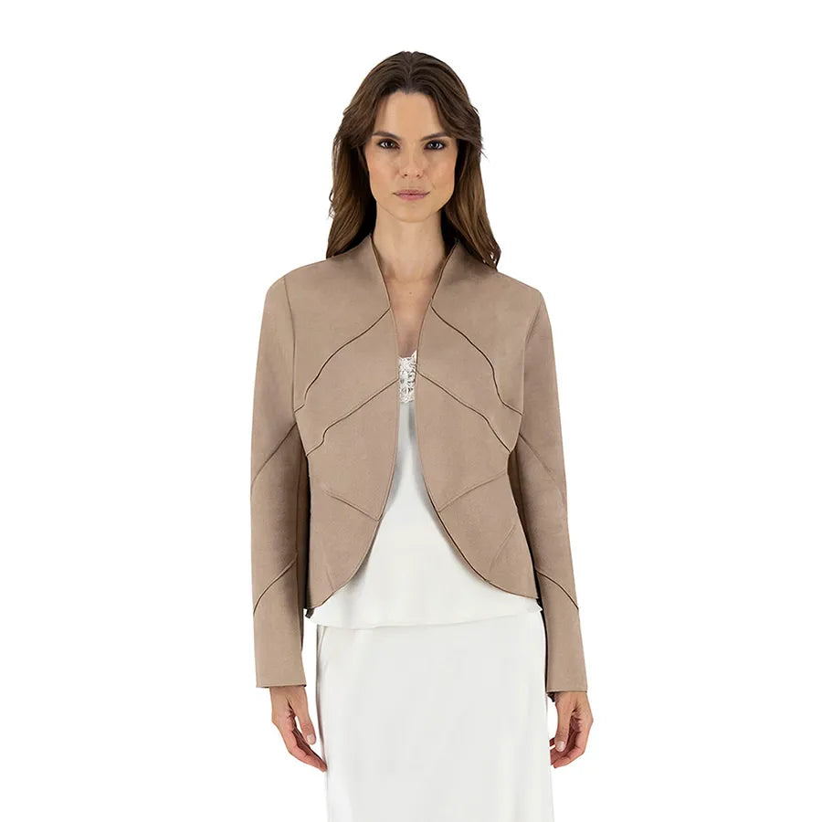Chaqueta Cropped de Suede que redefine la elegancia moderna con su diseño arquitectónico distintivo. Presenta un innovador diseño de frentes cruzados que se superponen creando una silueta asimétrica y contemporánea. El cuello band y las líneas de construcción geométricas añaden un toque vanguardista, mientras que las costuras decorativas crean un efecto visual estilizante. Su corte cropped y ajuste entallado realzan la figura femenina de manera favorecedora. Los detalles de construcción expuestos demuestran la calidad artesanal de la prenda.