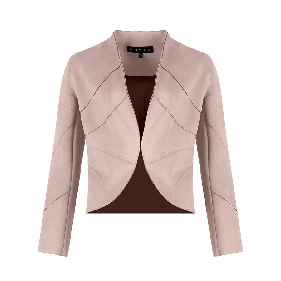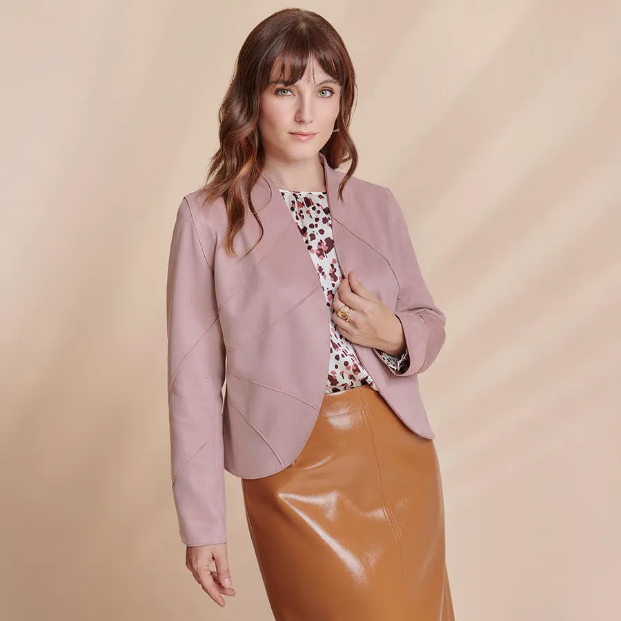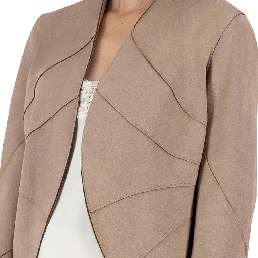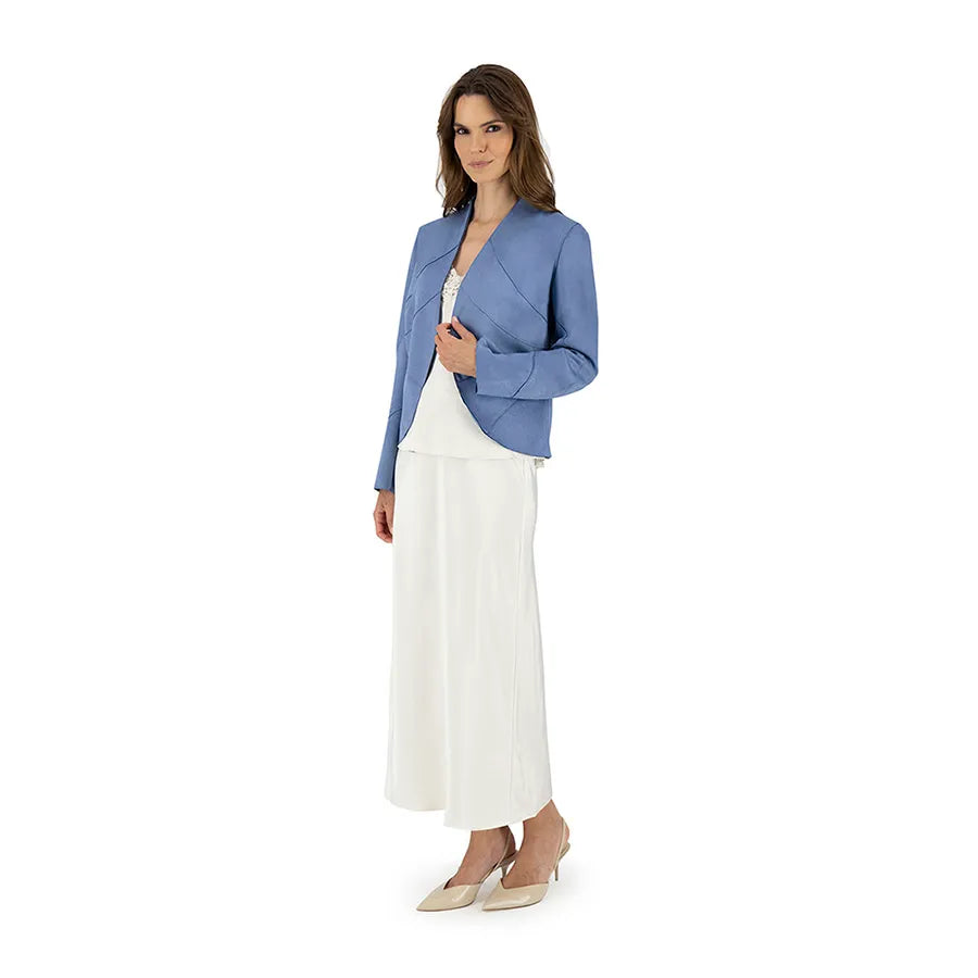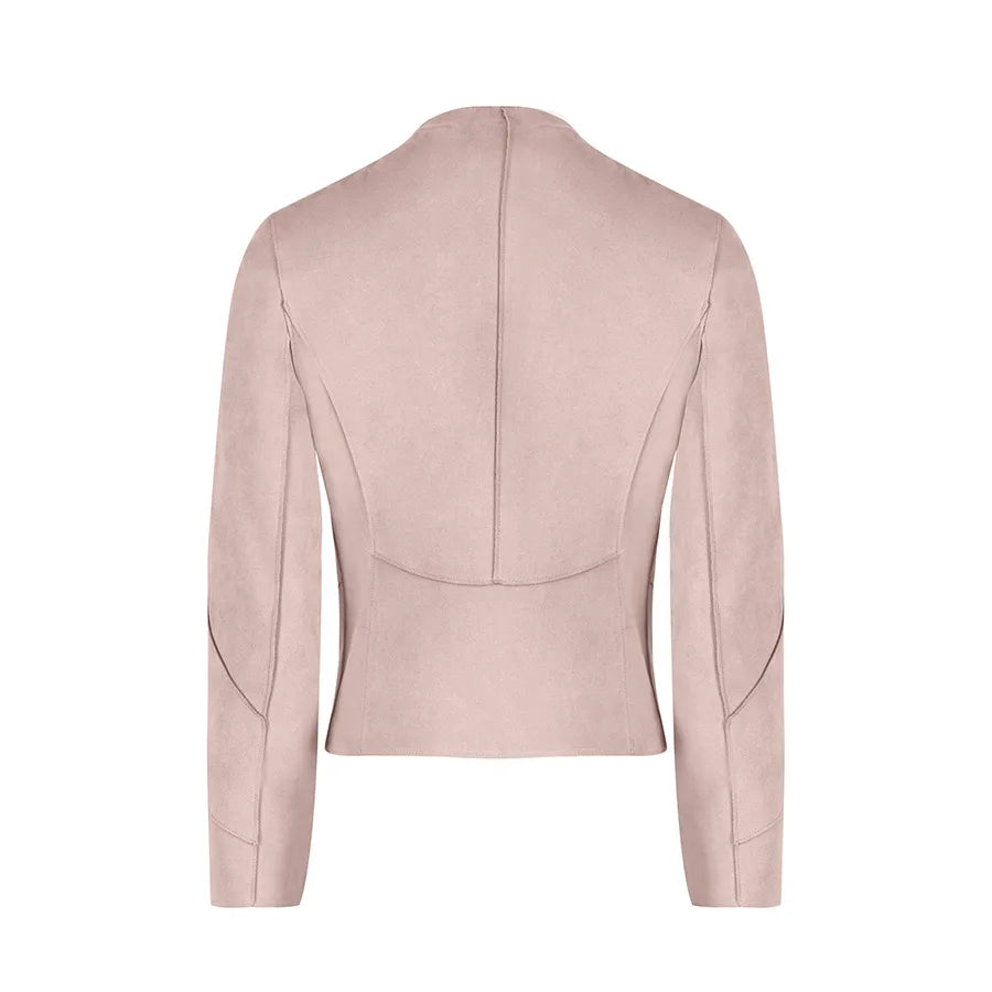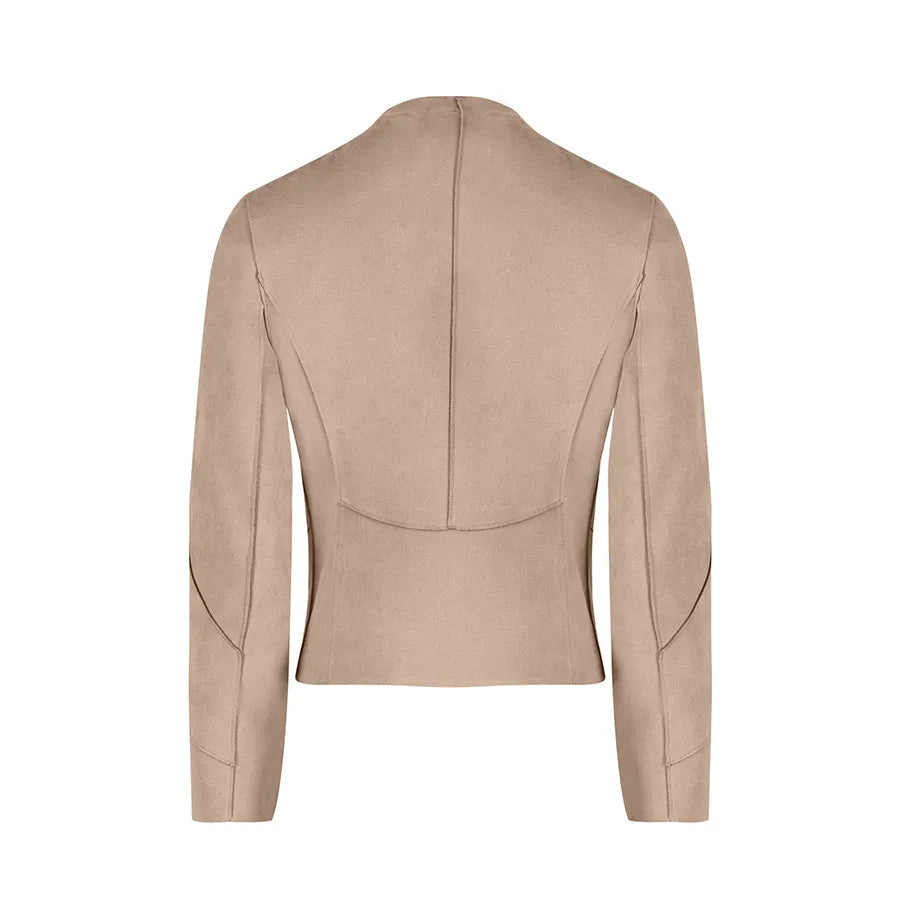 Chaqueta Cropped de Suede que redefine la elegancia moderna con su diseño arquitectónico distintivo. Presenta un innovador diseño de frentes cruzados que se superponen creando una silueta asimétrica y contemporánea. El cuello band y las líneas de construcción geométricas añaden un toque vanguardista, mientras que las costuras decorativas crean un efecto visual estilizante. Su corte cropped y ajuste entallado realzan la figura femenina de manera favorecedora. Los detalles de construcción expuestos demuestran la calidad artesanal de la prenda.