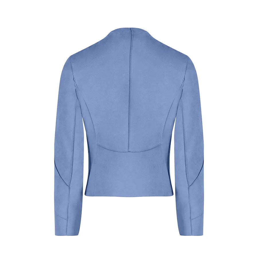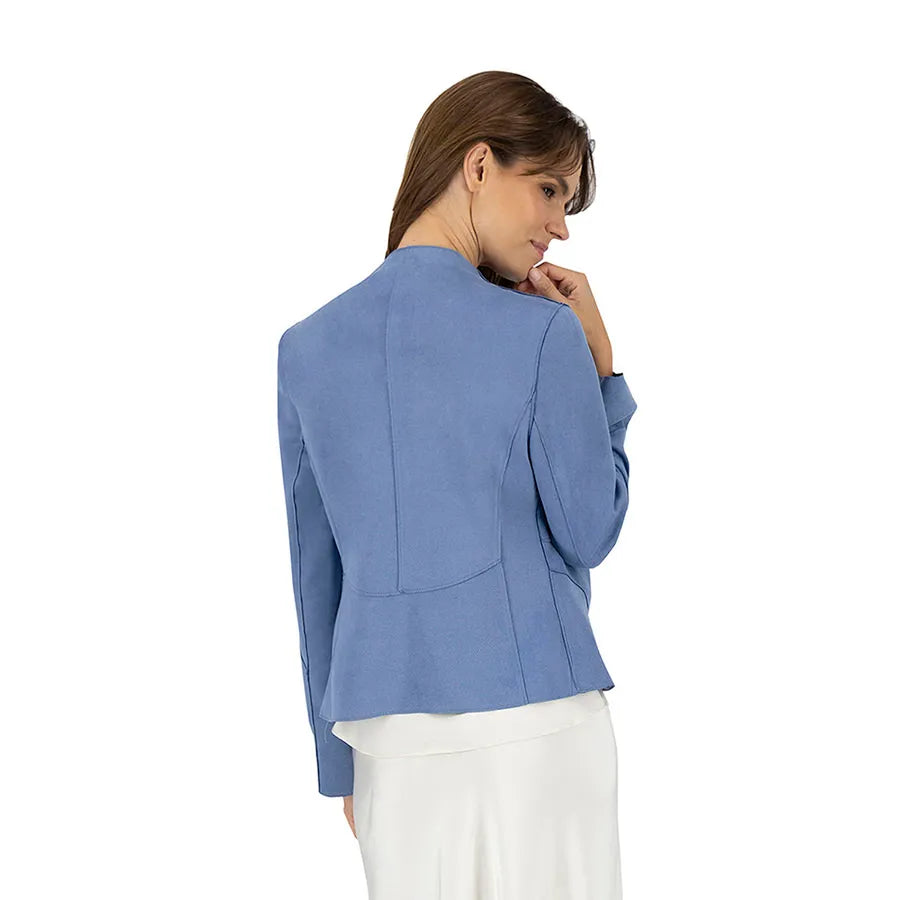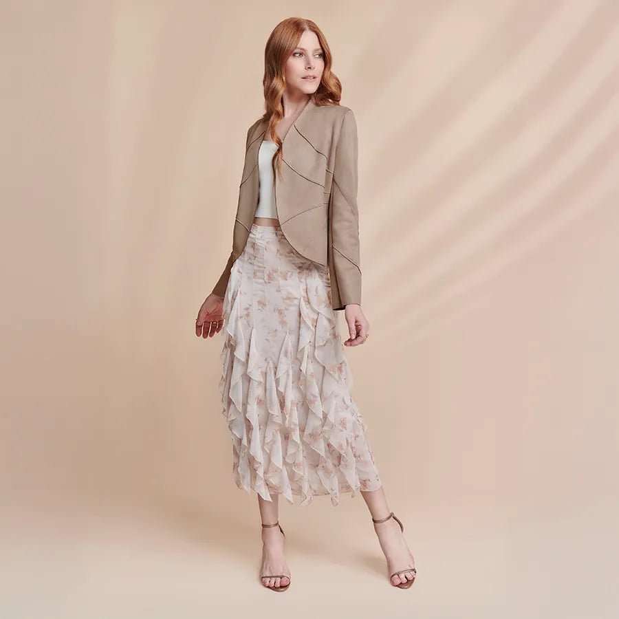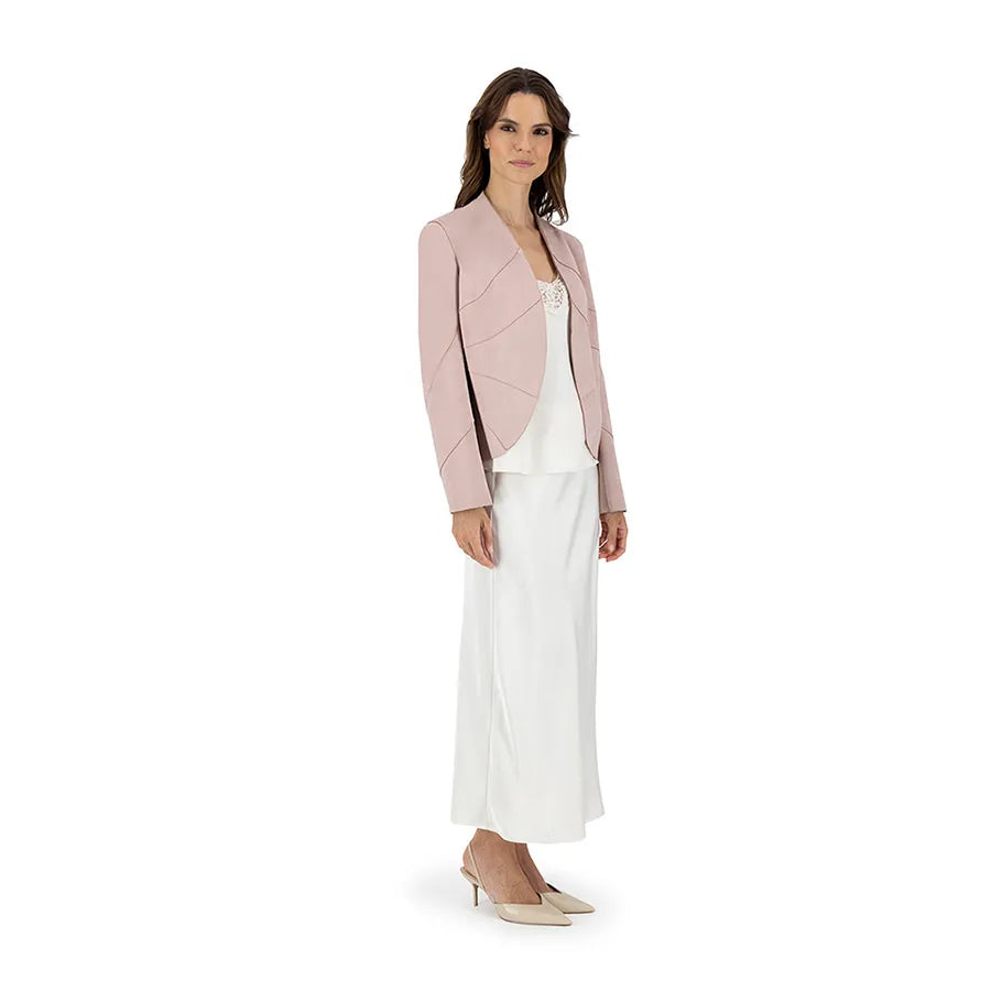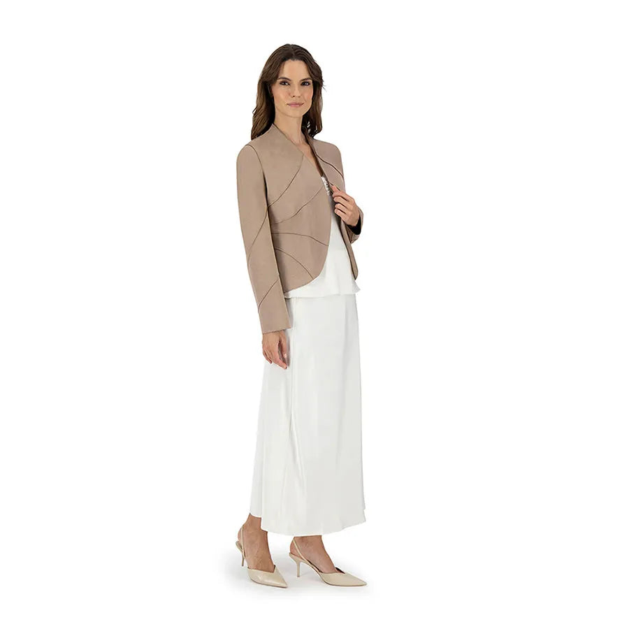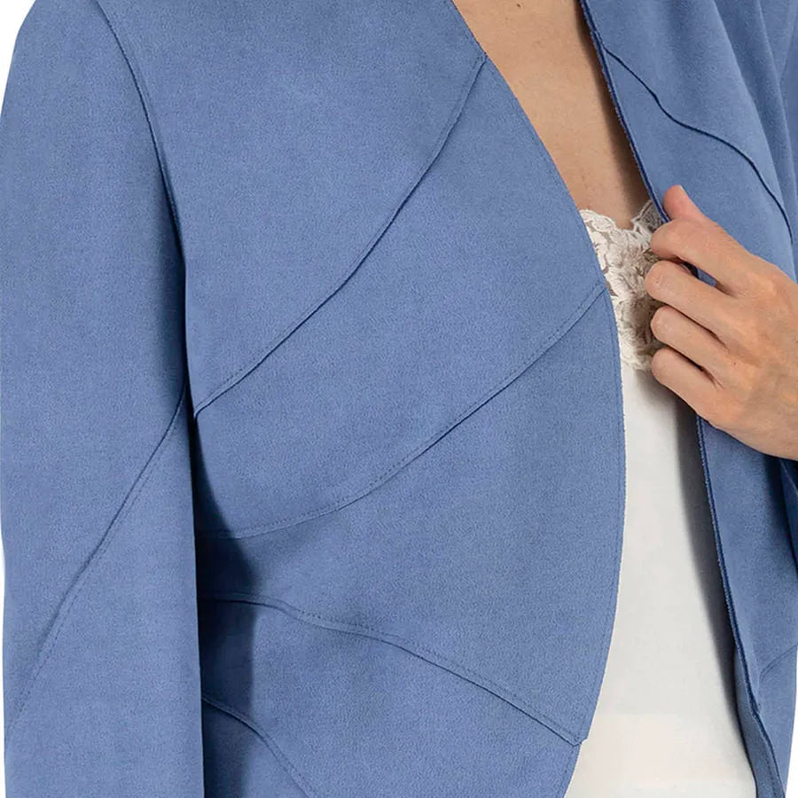 Chaqueta Cropped de Suede que redefine la elegancia moderna con su diseño arquitectónico distintivo. Presenta un innovador diseño de frentes cruzados que se superponen creando una silueta asimétrica y contemporánea. El cuello band y las líneas de construcción geométricas añaden un toque vanguardista, mientras que las costuras decorativas crean un efecto visual estilizante. Su corte cropped y ajuste entallado realzan la figura femenina de manera favorecedora. Los detalles de construcción expuestos demuestran la calidad artesanal de la prenda.