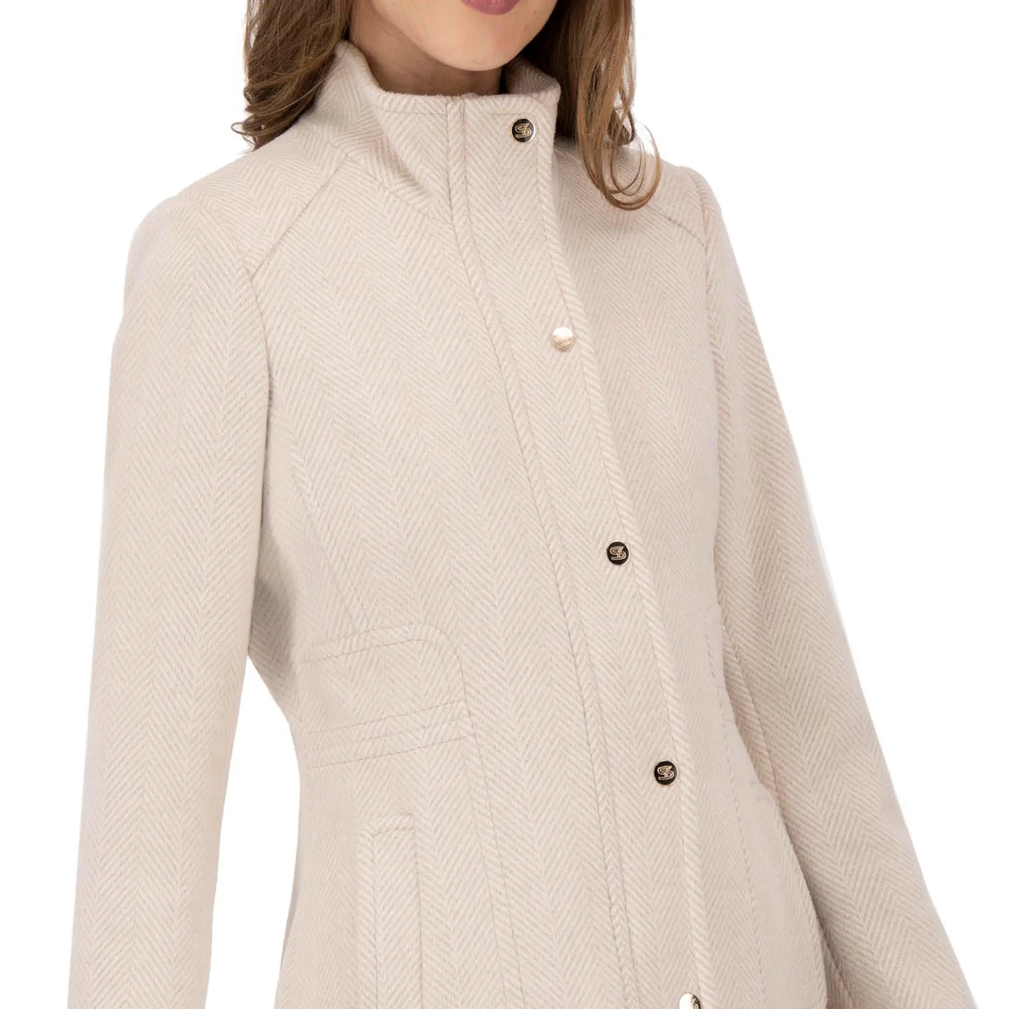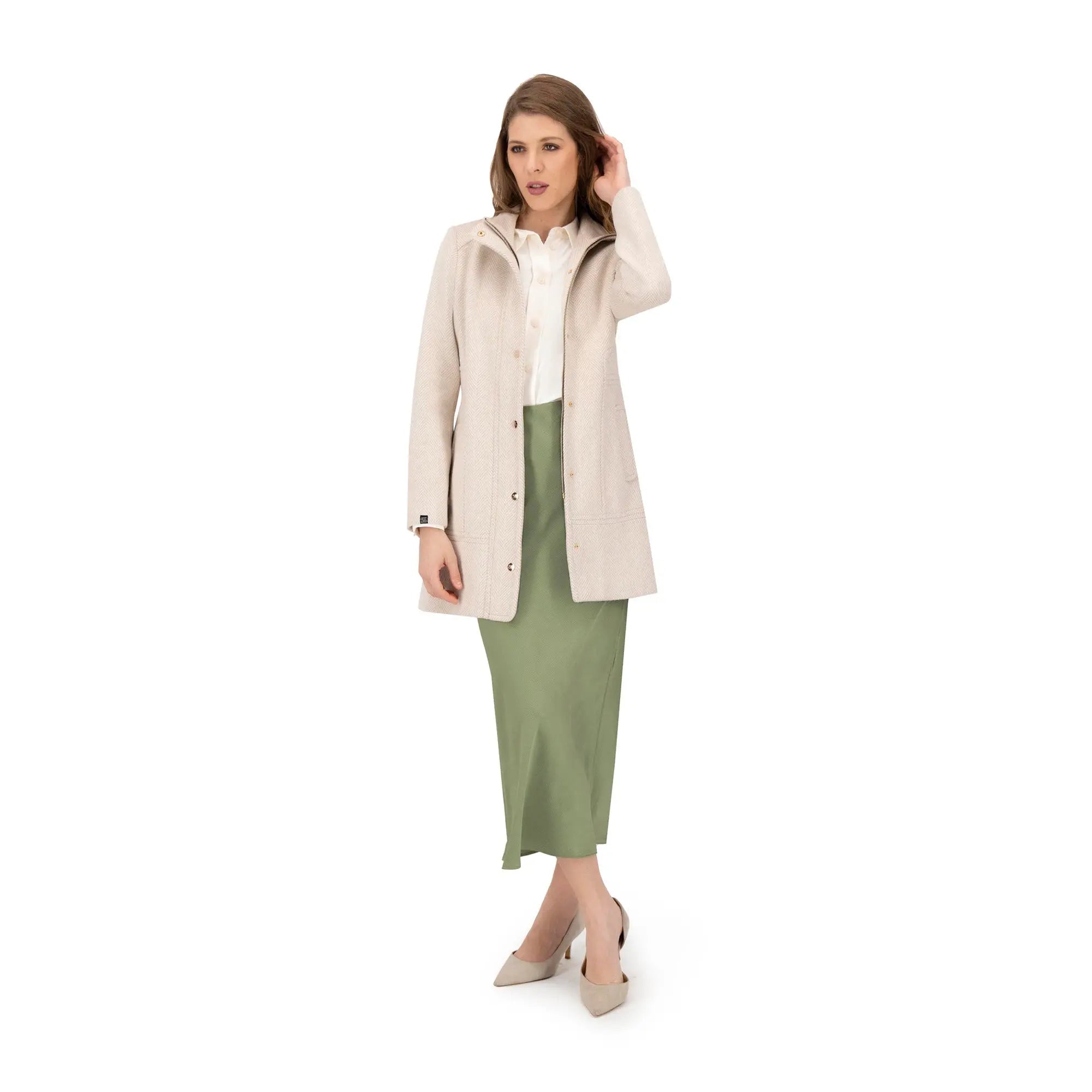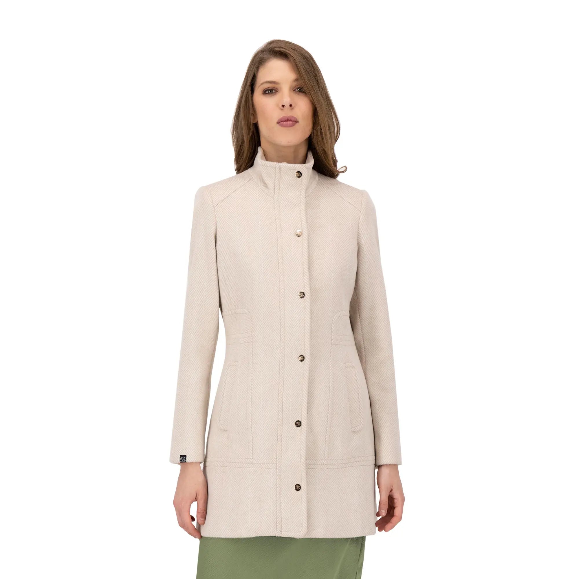 Este abrigo de corte recto presenta un cuello alto y un cierre frontal con botones metálicos, combinando diseño minimalista con un toque sofisticado. Su estructura estilizada favorece la silueta mientras ofrece practicidad gracias a sus bolsillos laterales discretos. Perfecto para darle un toque elegante a tus atuendos tanto formales como casuales durante los días fríos.