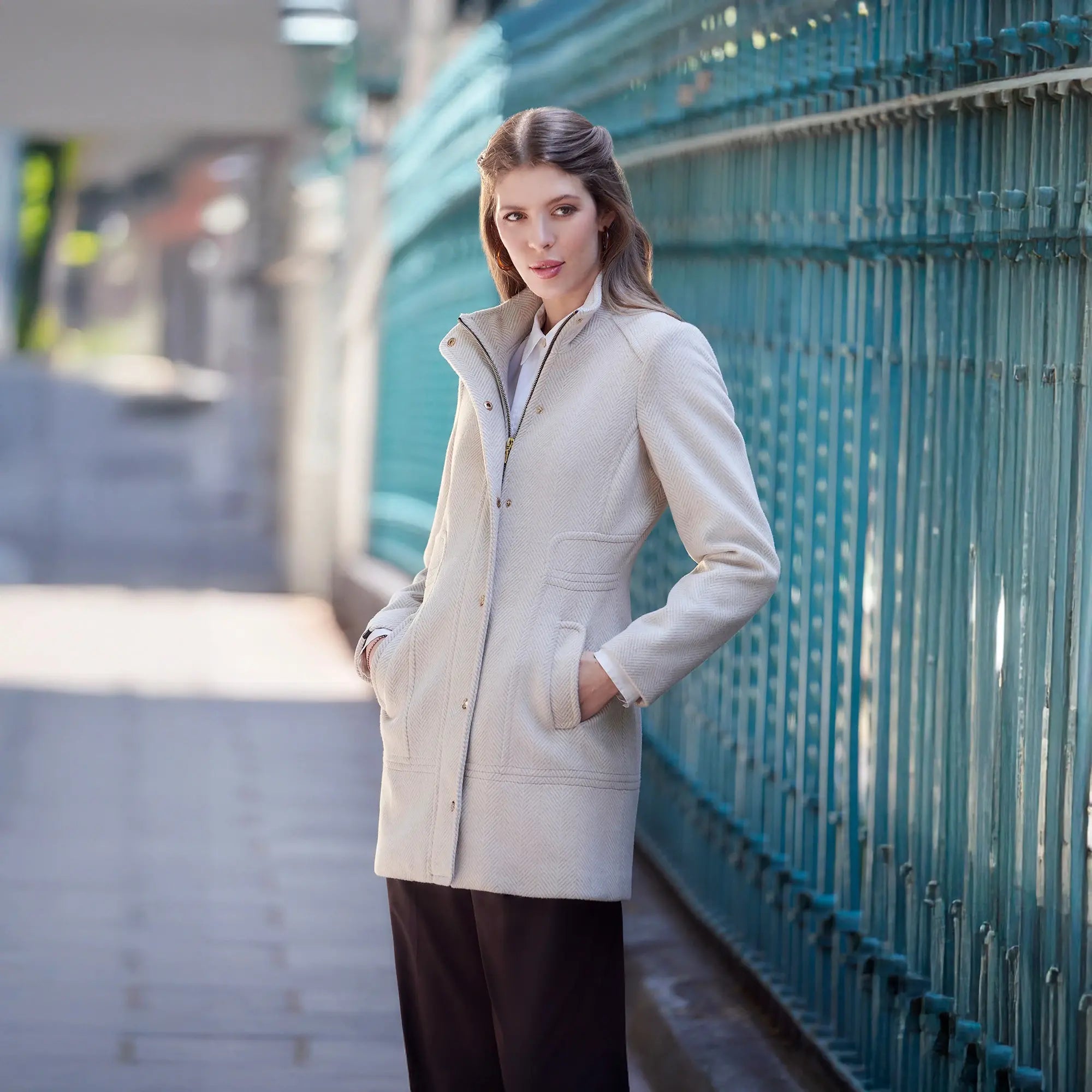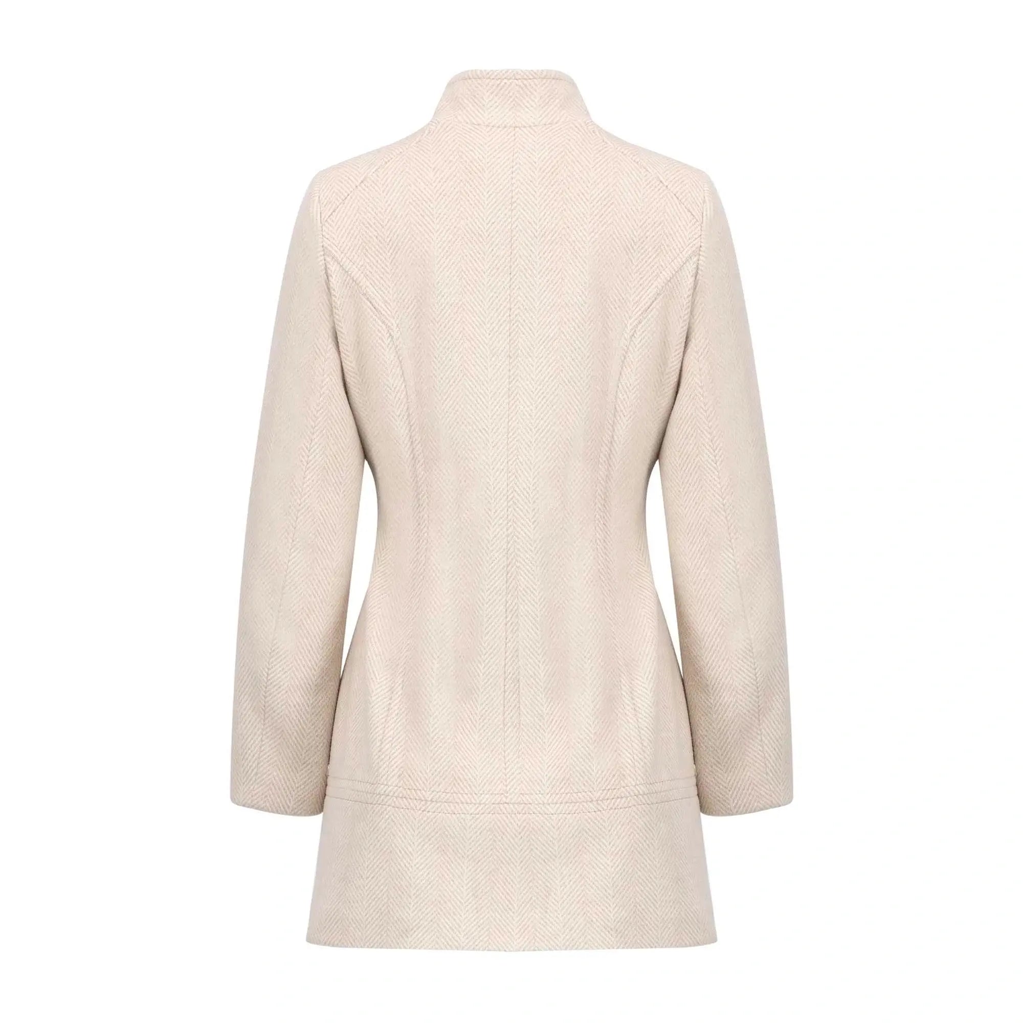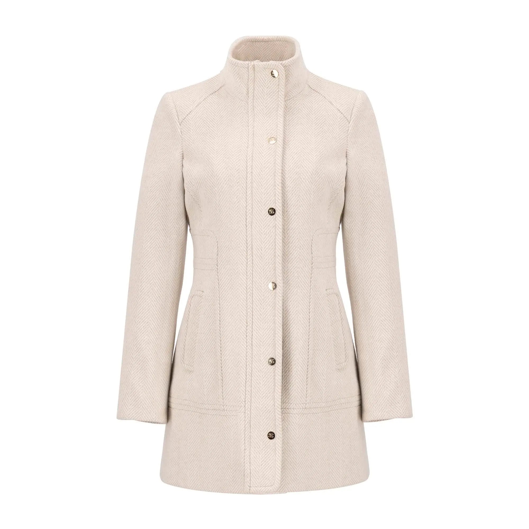 Este abrigo de corte recto presenta un cuello alto y un cierre frontal con botones metálicos, combinando diseño minimalista con un toque sofisticado. Su estructura estilizada favorece la silueta mientras ofrece practicidad gracias a sus bolsillos laterales discretos. Perfecto para darle un toque elegante a tus atuendos tanto formales como casuales durante los días fríos.