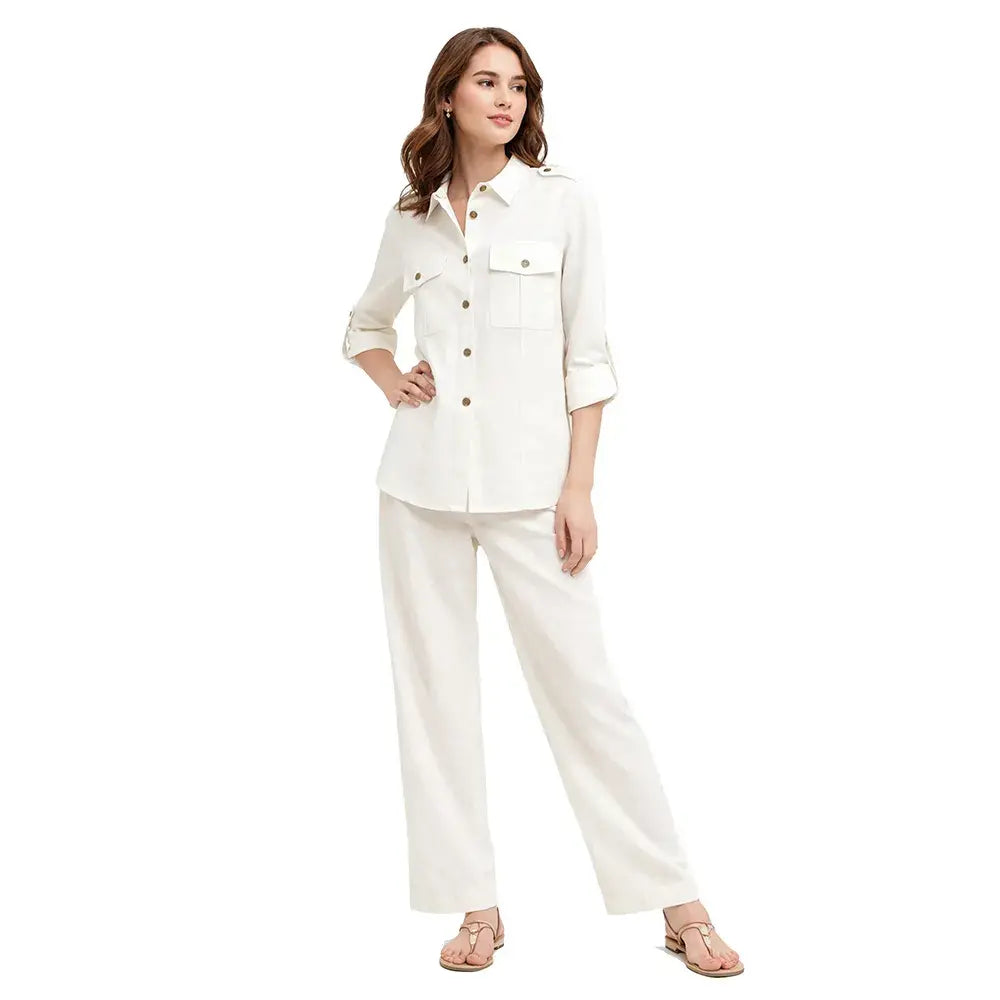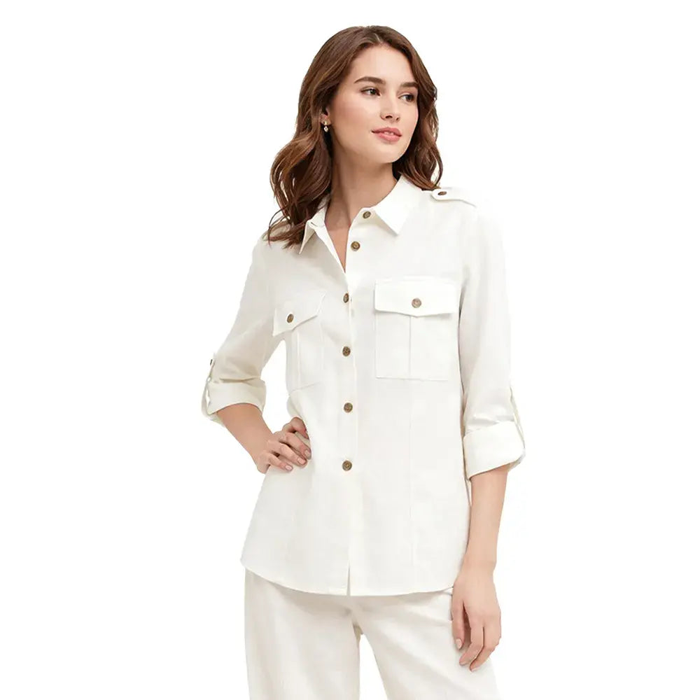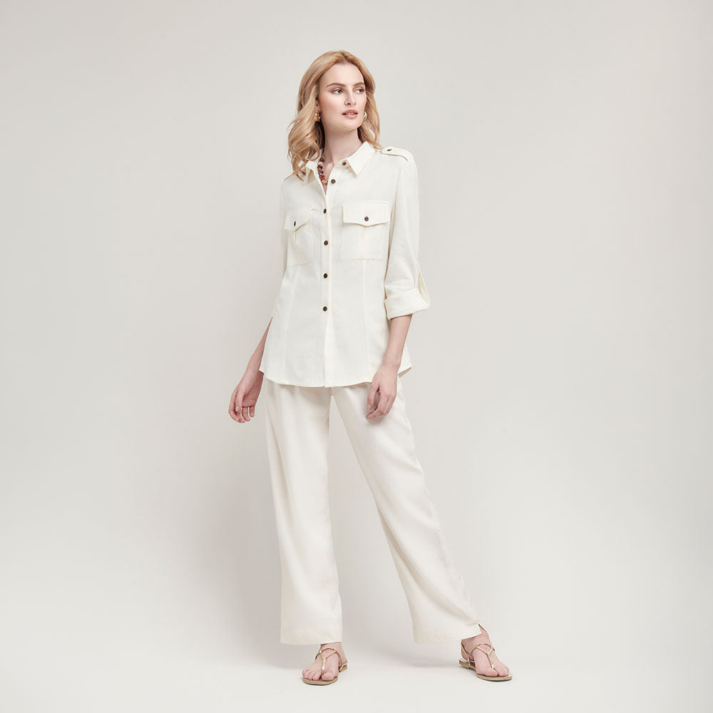 Una reinterpretación contemporánea de la clásica camisa utilitaria. Su silueta ligeramente fluida se complementa con charreteras en hombros que aportan carácter y estructura. Los botones al frente y la bolsa de parche con cartera refuerzan su esencia funcional, mientras que el elevador de manga permite transformar el look con naturalidad. Ideal para crear estilismos pulidos con actitud relajada.
