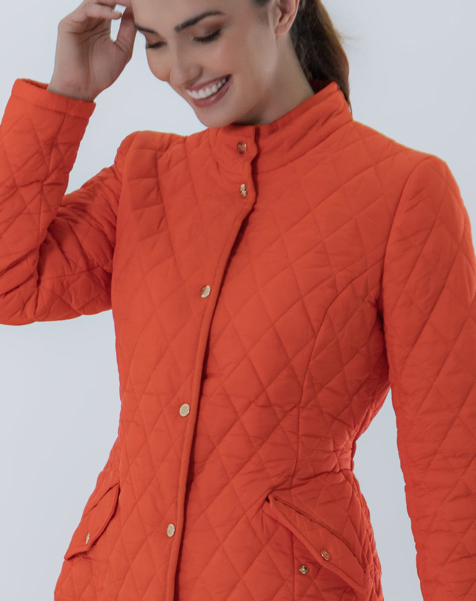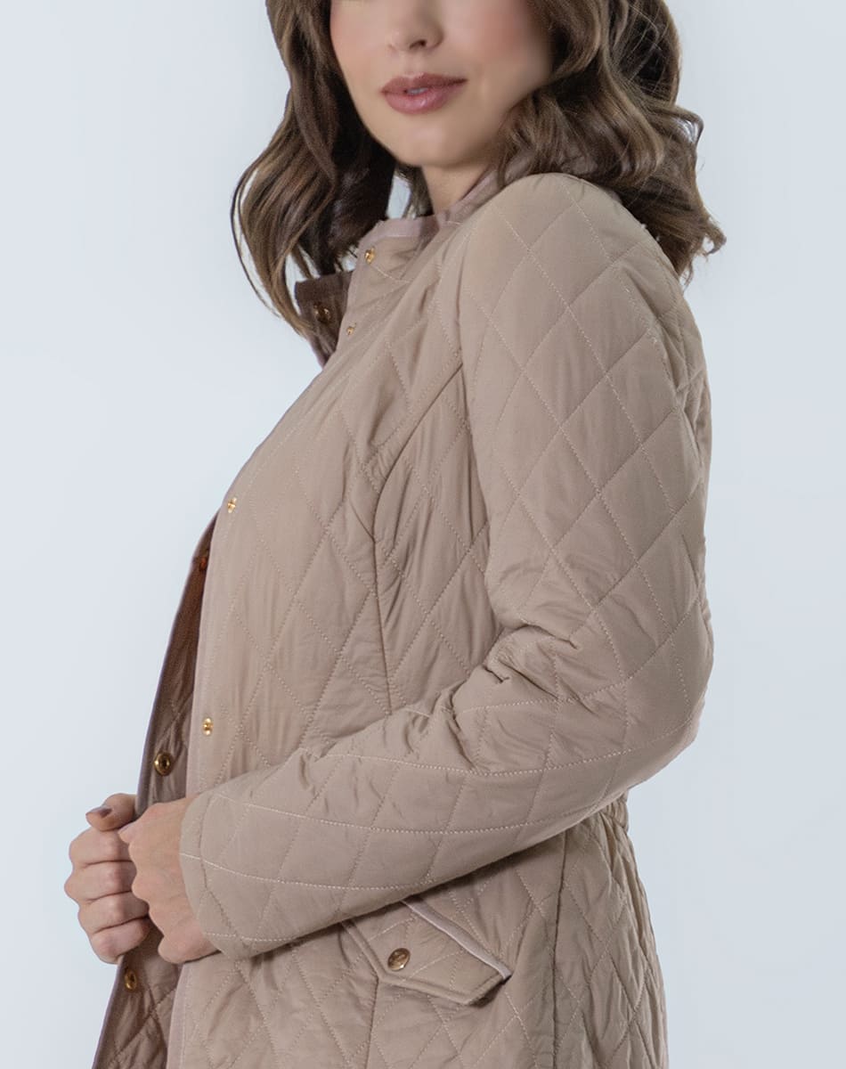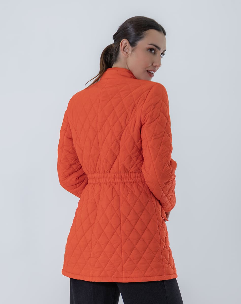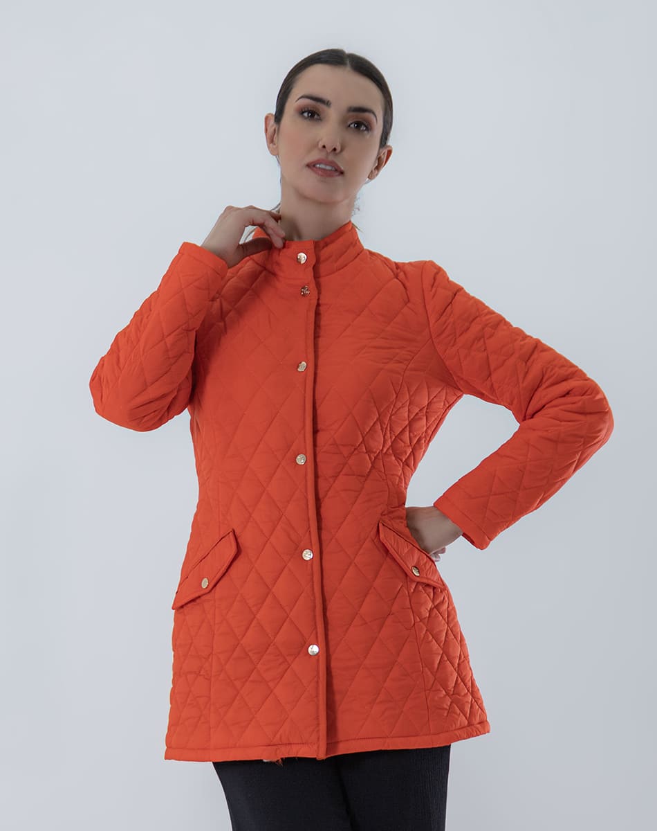 Tela capitonado.Cuello alto.Broches al frente.Cinta popotillo.Bolsas de vivos con cartera.Composición 100% poliester.