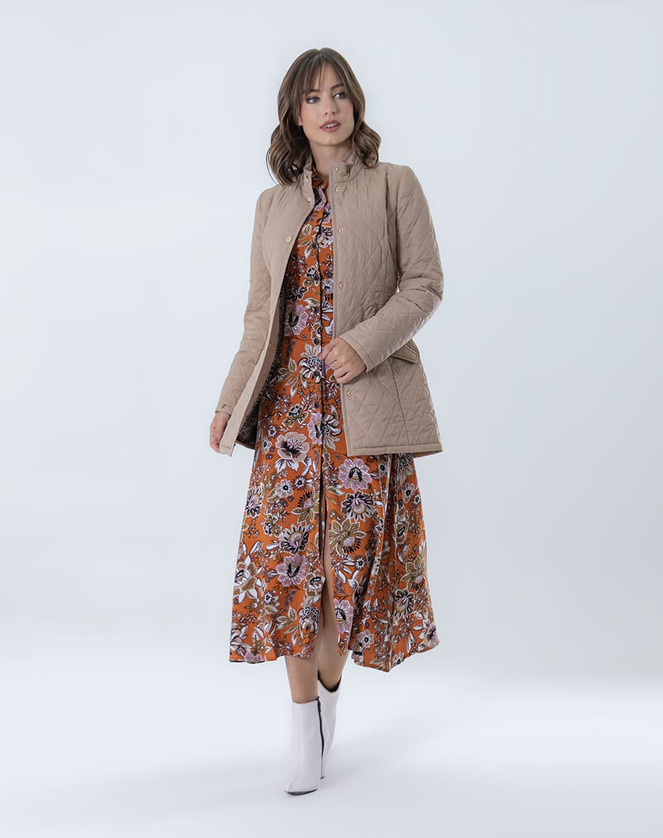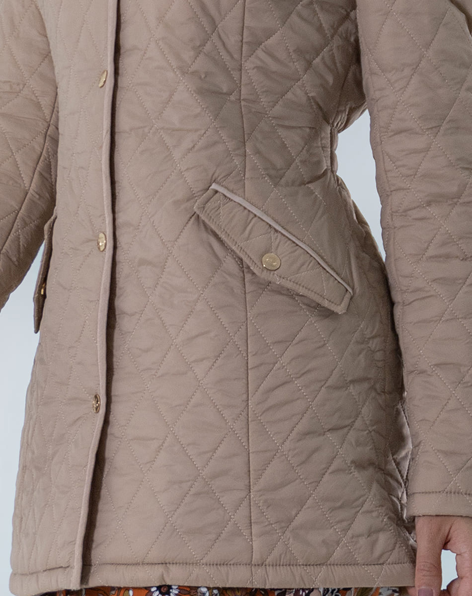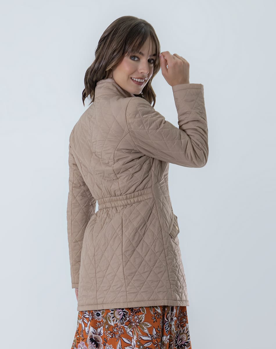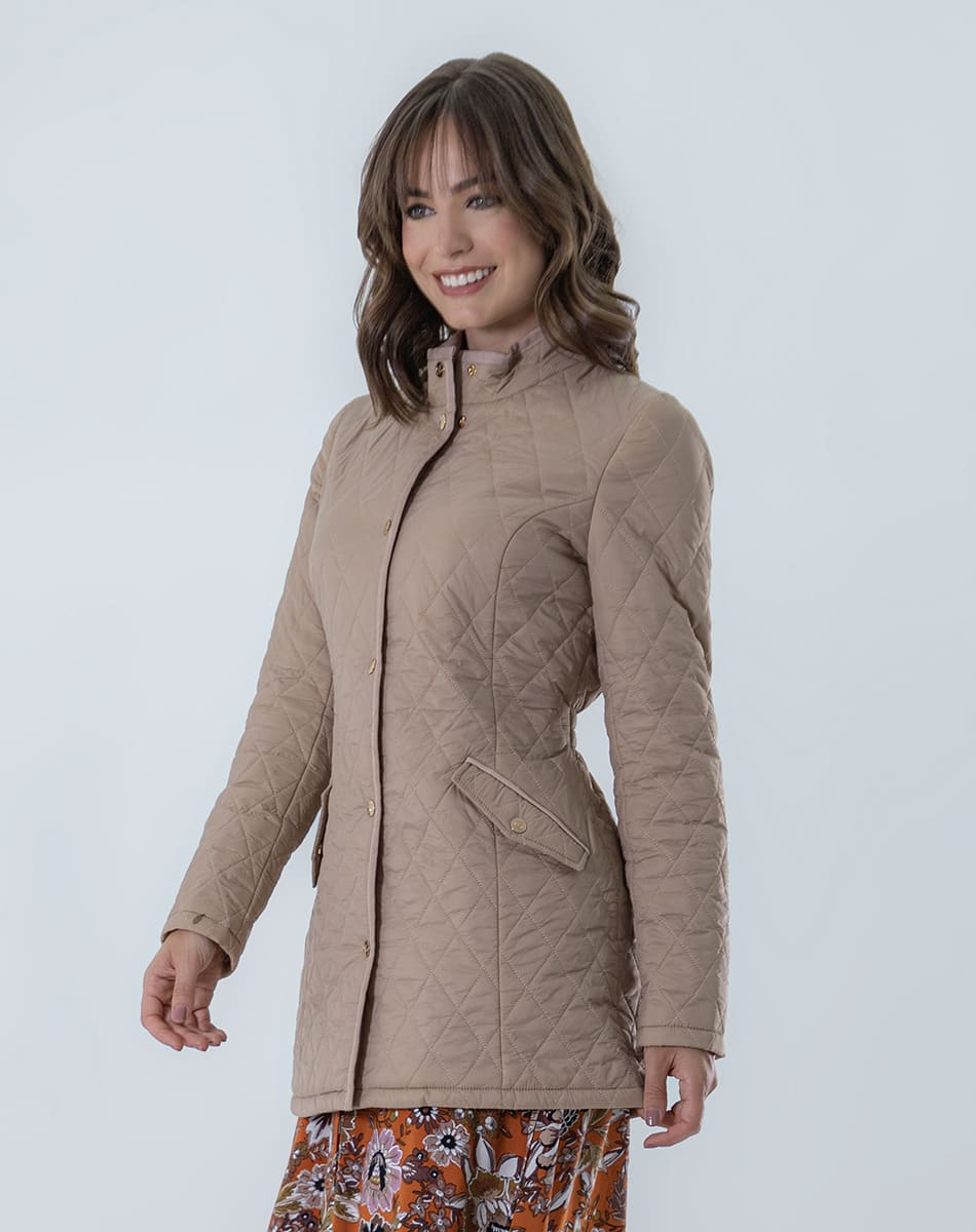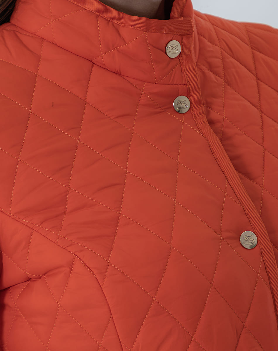 Tela capitonado.Cuello alto.Broches al frente.Cinta popotillo.Bolsas de vivos con cartera.Composición 100% poliester.