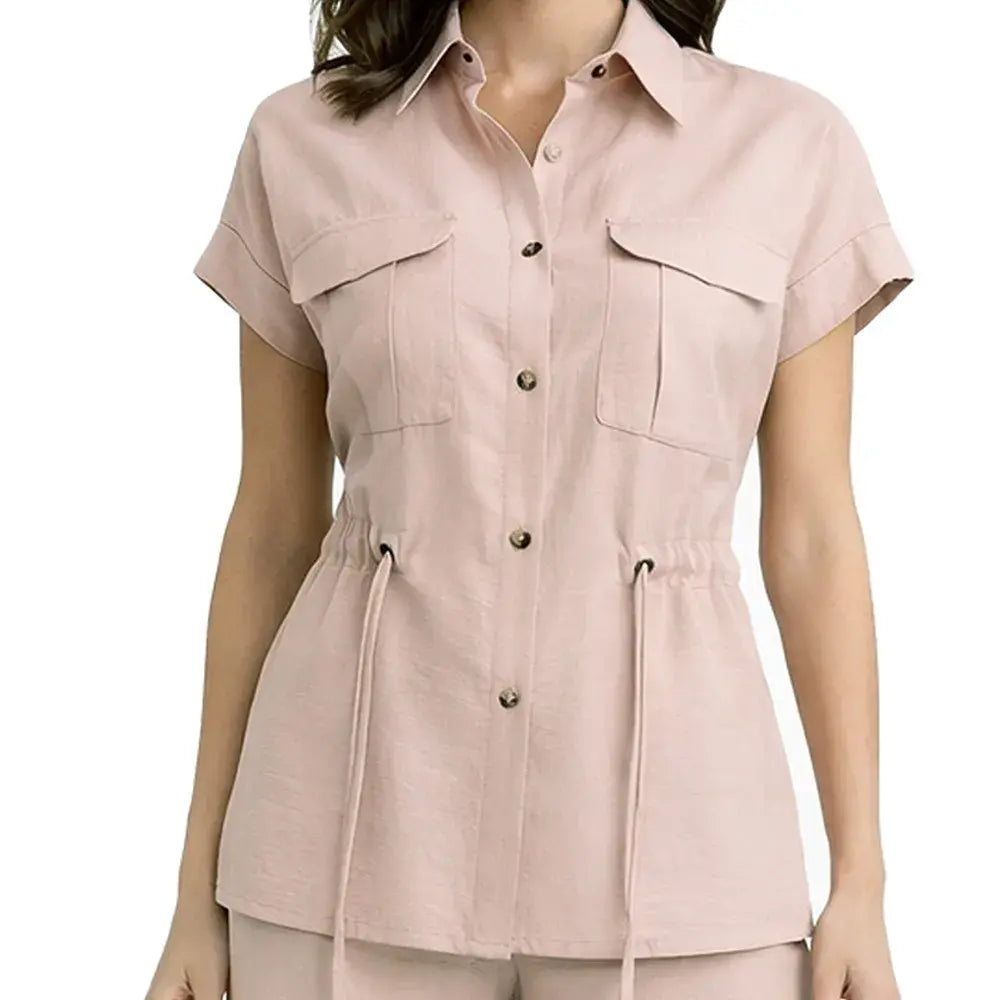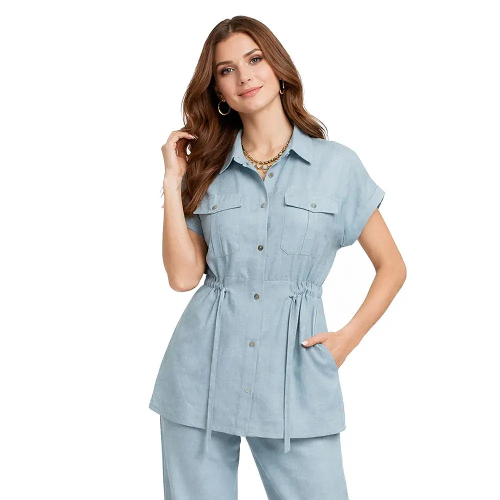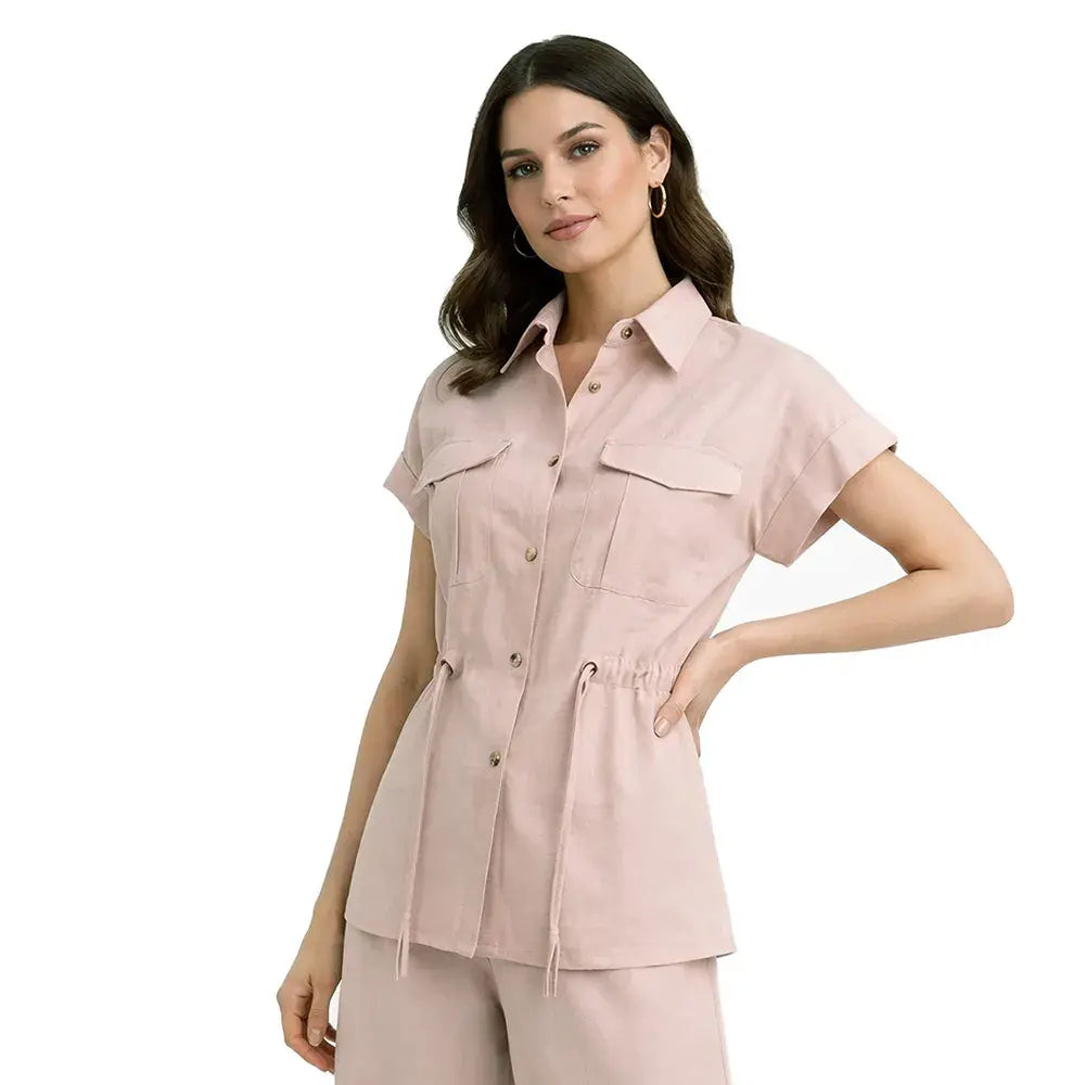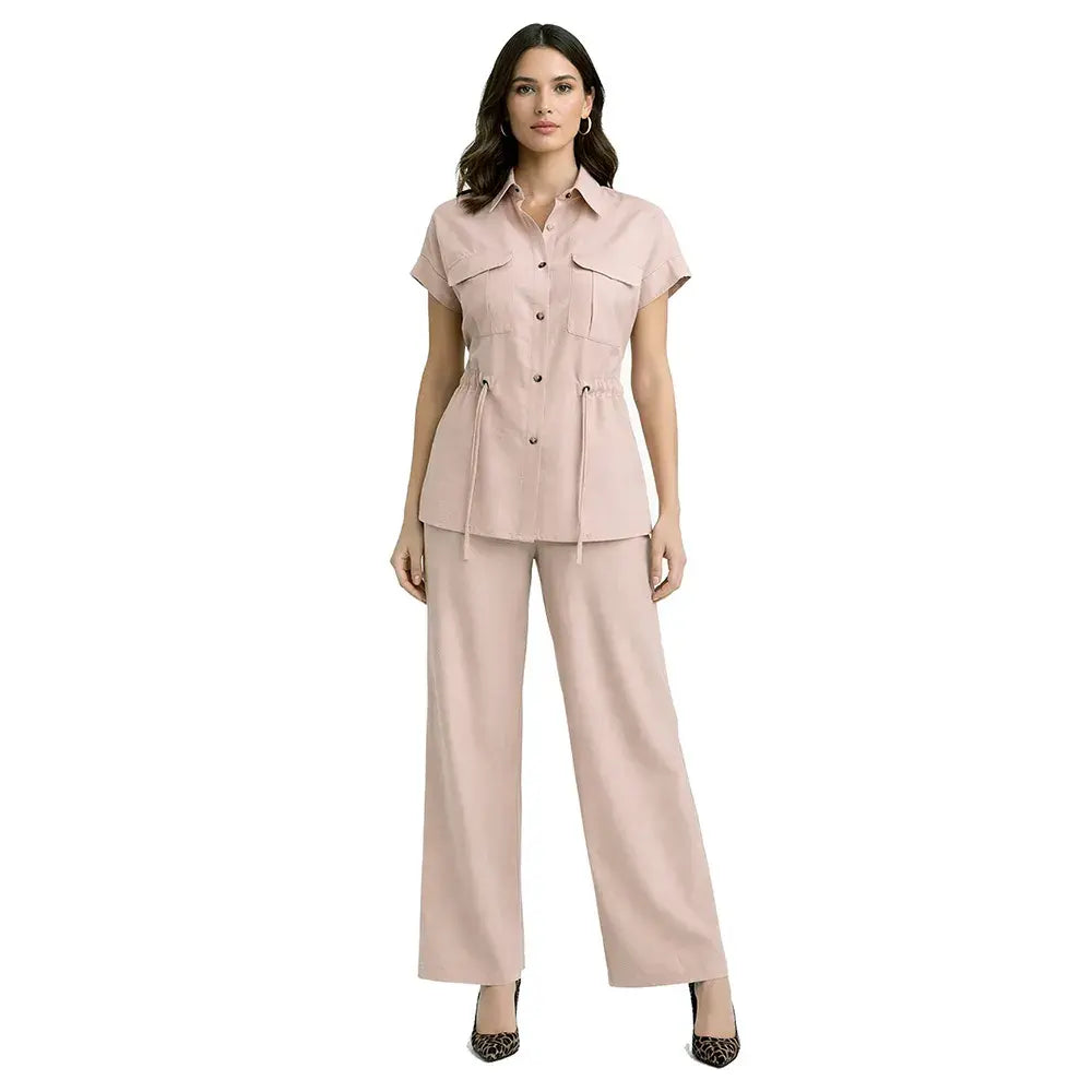 De silueta ligera y estructura relajada, este ensamble incorpora un cuello tipo sport que aporta carácter casual refinado. Los botones frontales mantienen una línea clásica y funcional, mientras que la bolsa de parche con cartera añade un detalle utilitario bien definido. La jareta permite ajustar la silueta con sutileza, equilibrando amplitud y definición.