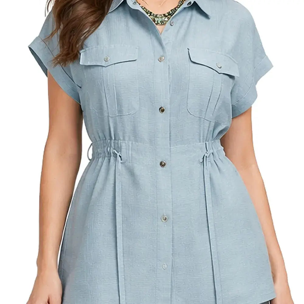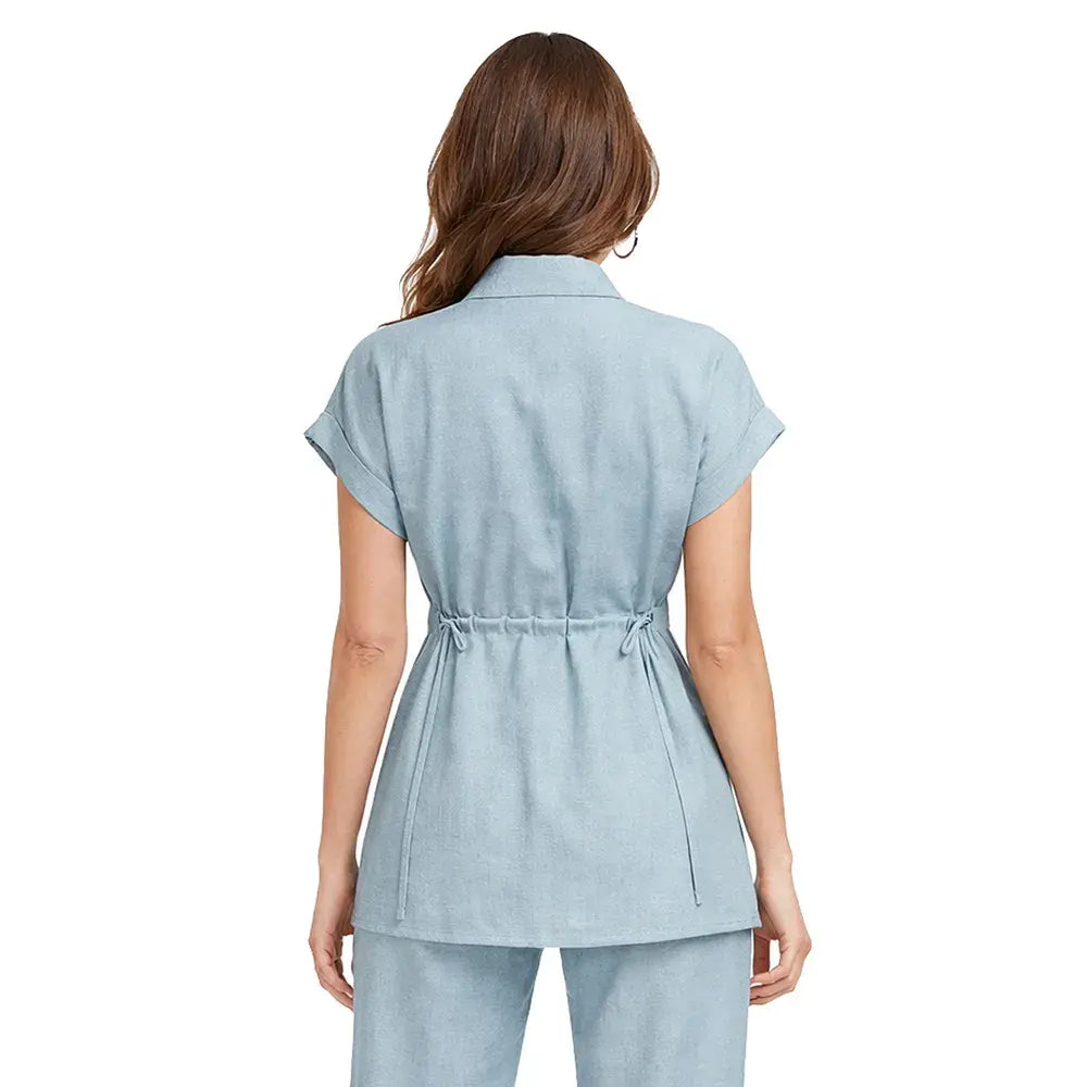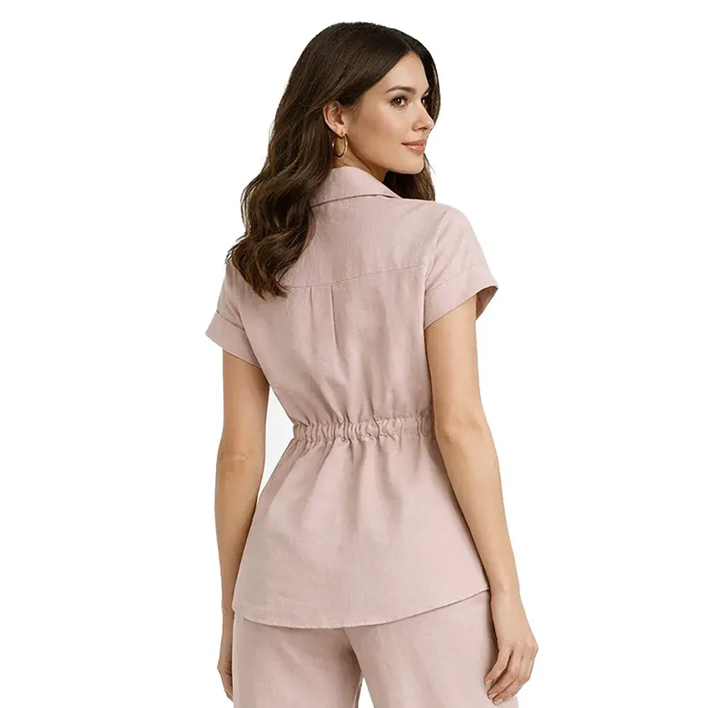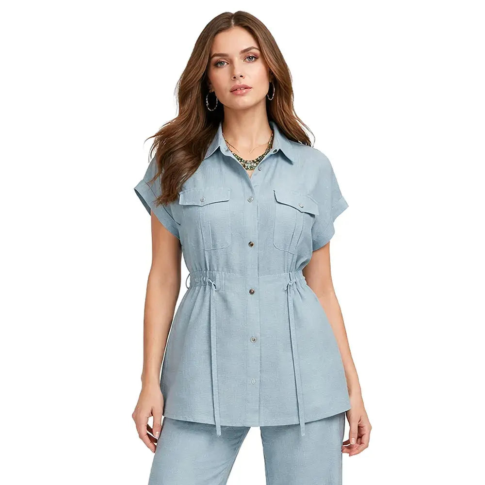 De silueta ligera y estructura relajada, este ensamble incorpora un cuello tipo sport que aporta carácter casual refinado. Los botones frontales mantienen una línea clásica y funcional, mientras que la bolsa de parche con cartera añade un detalle utilitario bien definido. La jareta permite ajustar la silueta con sutileza, equilibrando amplitud y definición.