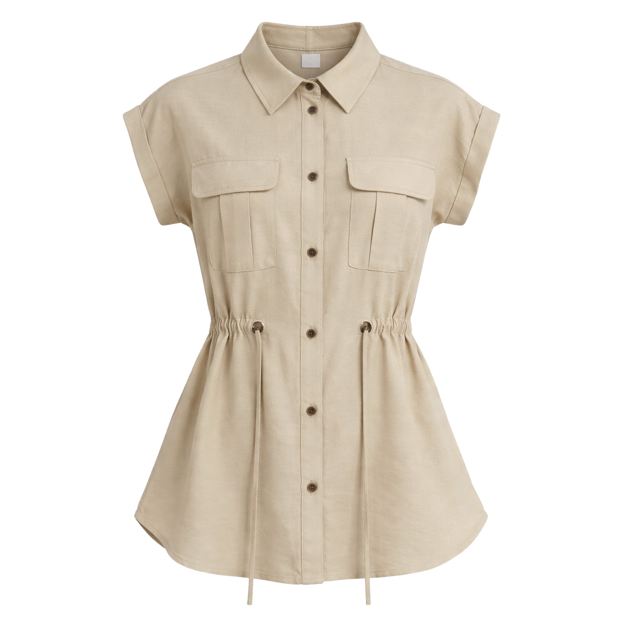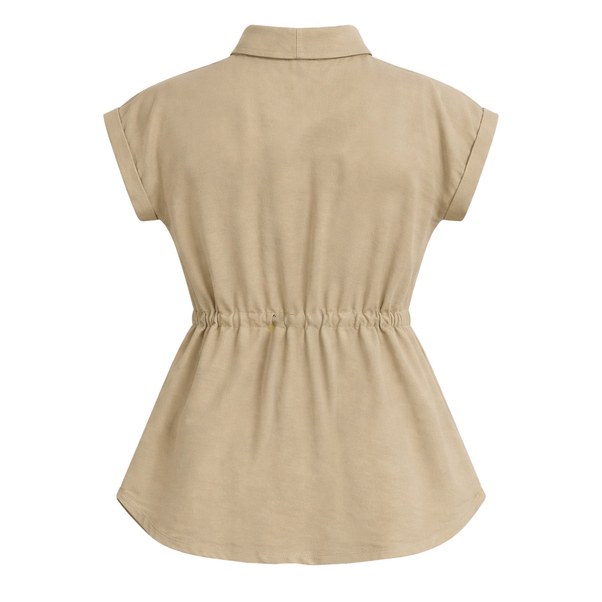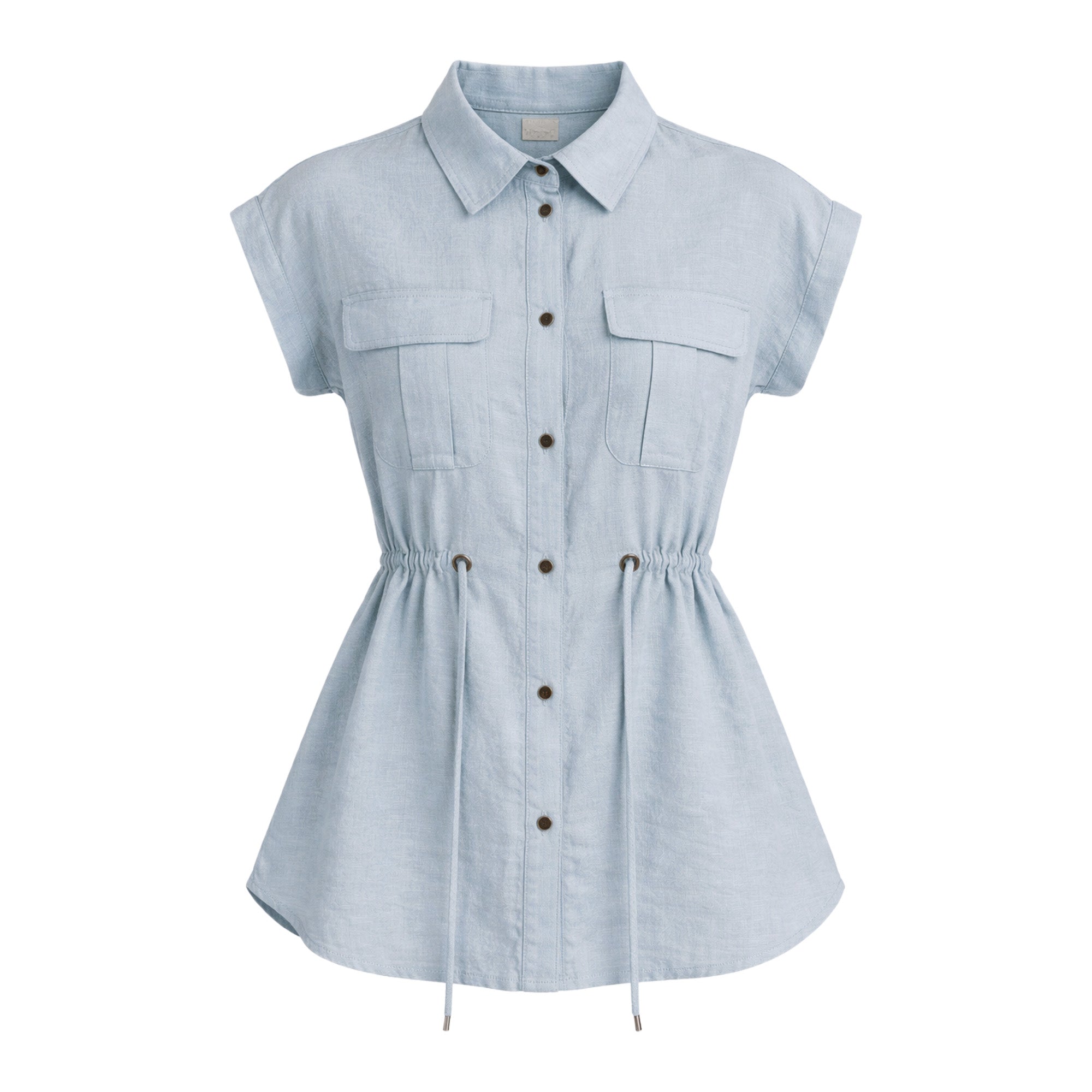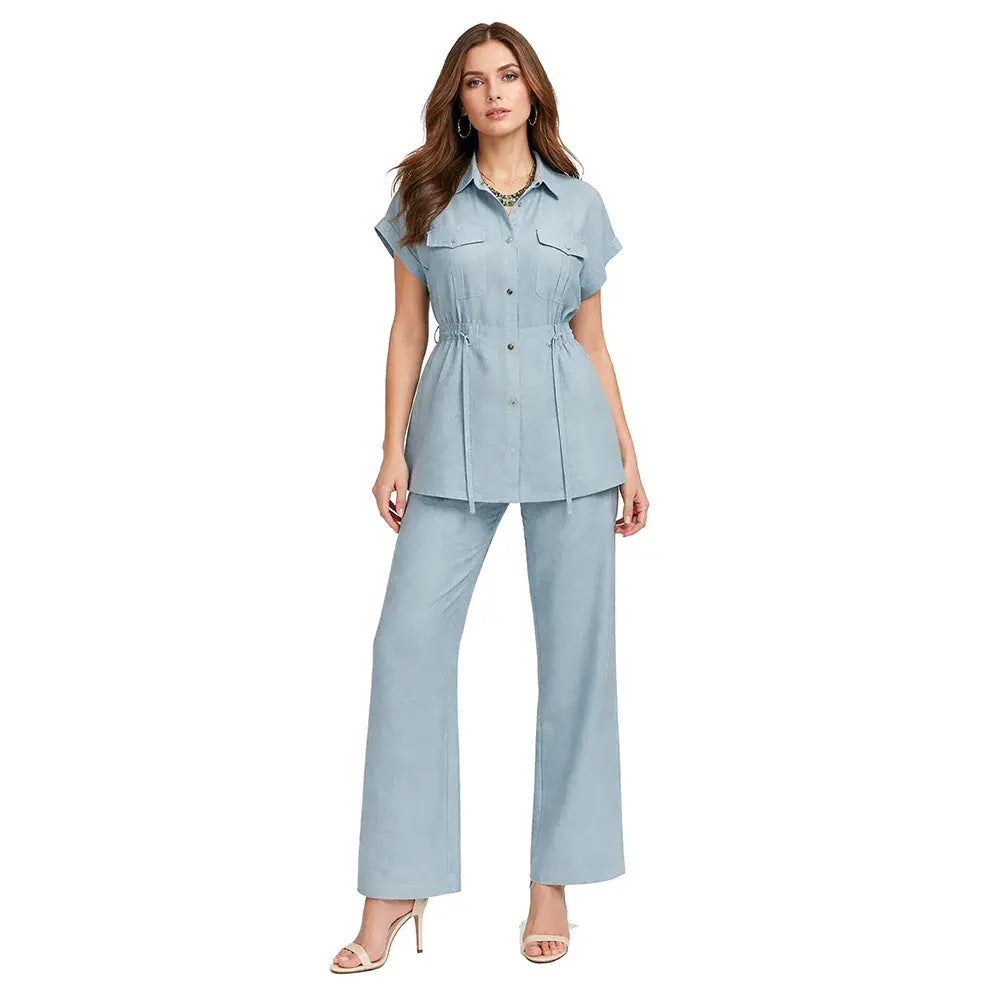 De silueta ligera y estructura relajada, este ensamble incorpora un cuello tipo sport que aporta carácter casual refinado. Los botones frontales mantienen una línea clásica y funcional, mientras que la bolsa de parche con cartera añade un detalle utilitario bien definido. La jareta permite ajustar la silueta con sutileza, equilibrando amplitud y definición.