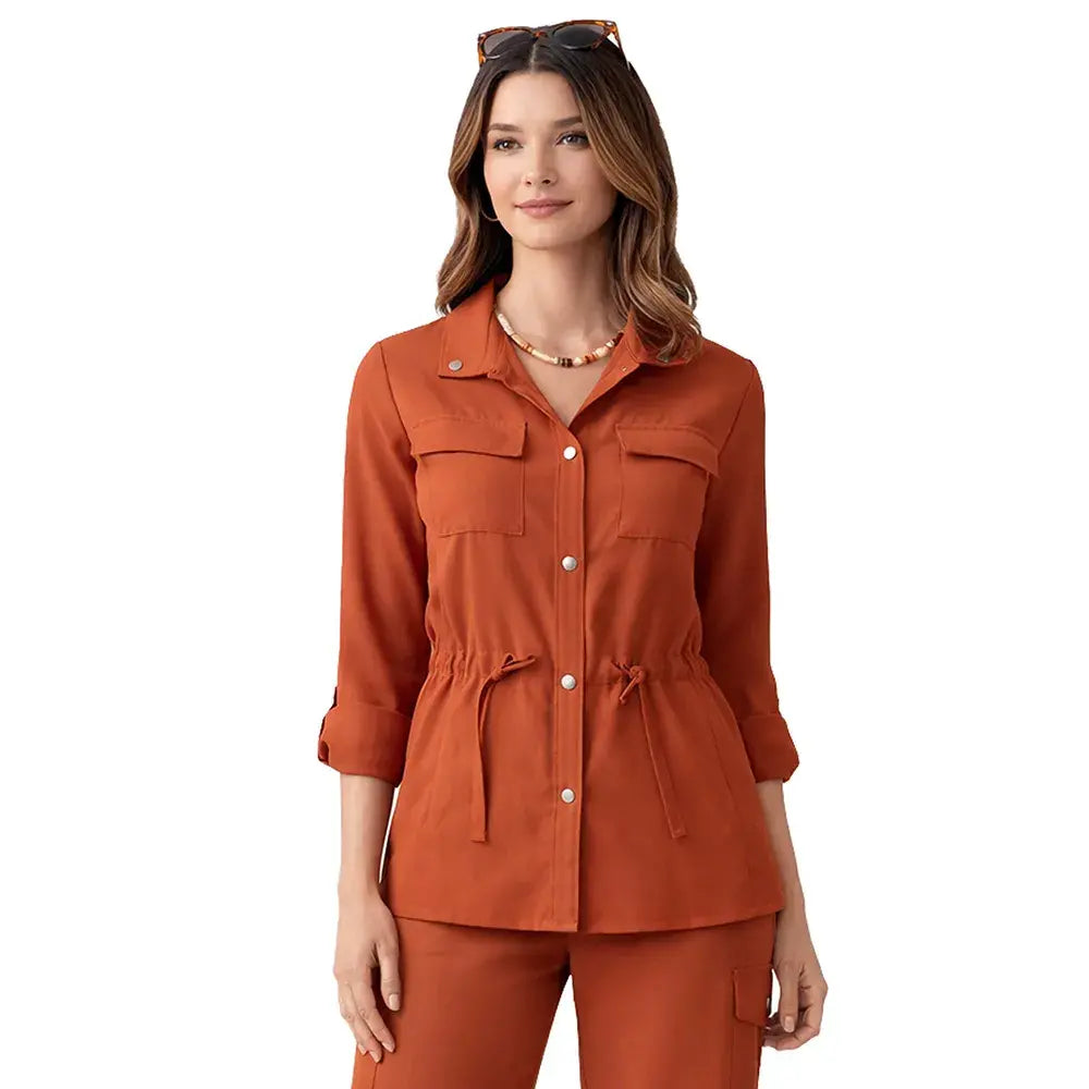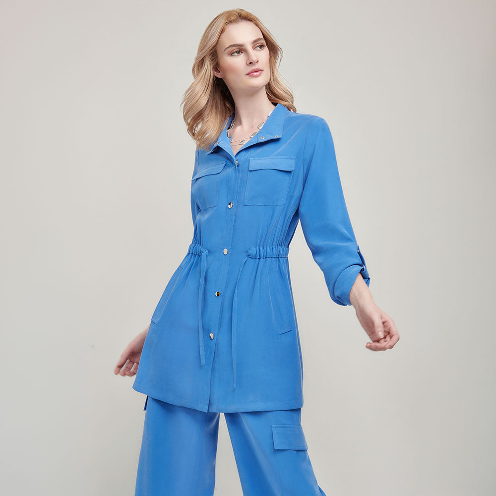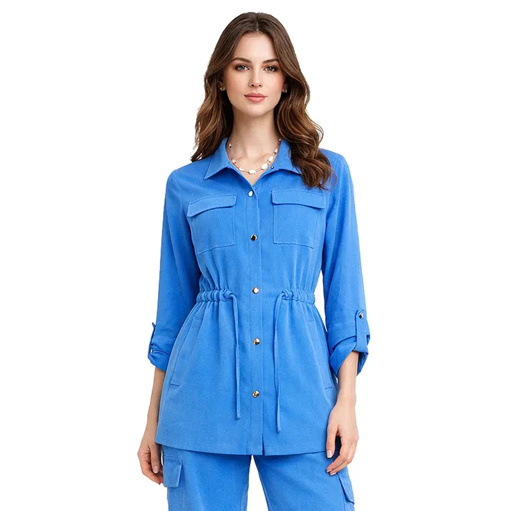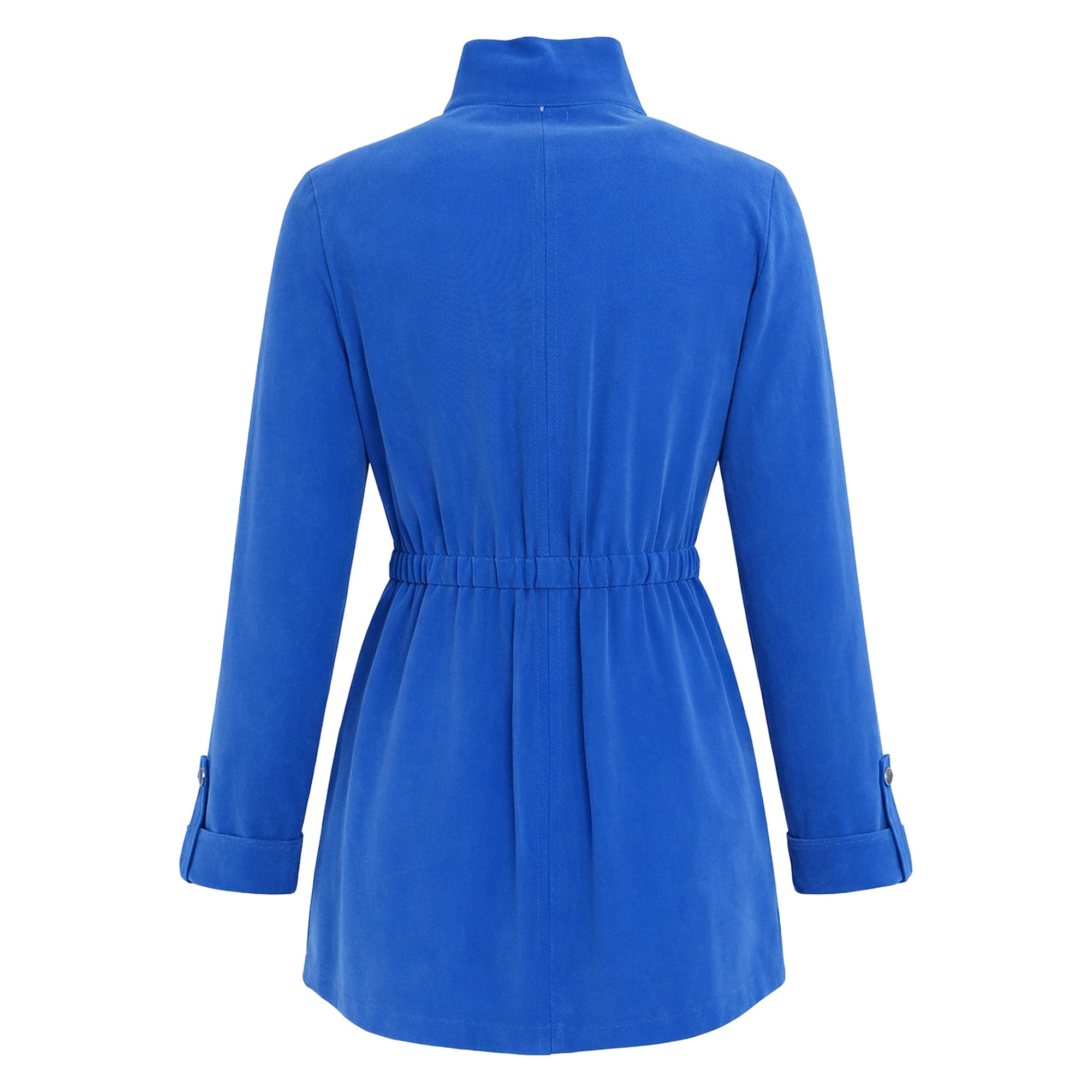 Diseñado para quienes buscan estructura con comodidad. El cuello alto aporta presencia, los broches frontales permiten cierre práctico y la jareta en cintura define silueta. Incluye bolsas de parche y elevador de manga, haciendo la pieza completamente funcional.
